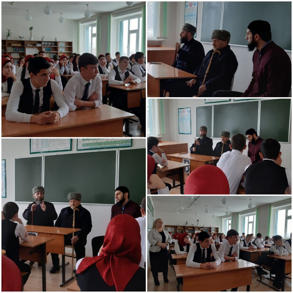 21.11.2019Кадий Веденского района Джафаров Арби, член Совета старейшин Хизриев Турпал-Али, педагог ДНВ Хадисов Салман Ш. провели профилактическую беседу с учащимися в честь священного месяца Раббиуль-авваль – месяца рождения лучшего из людей Пророка Мухаммада (с.а.в.).