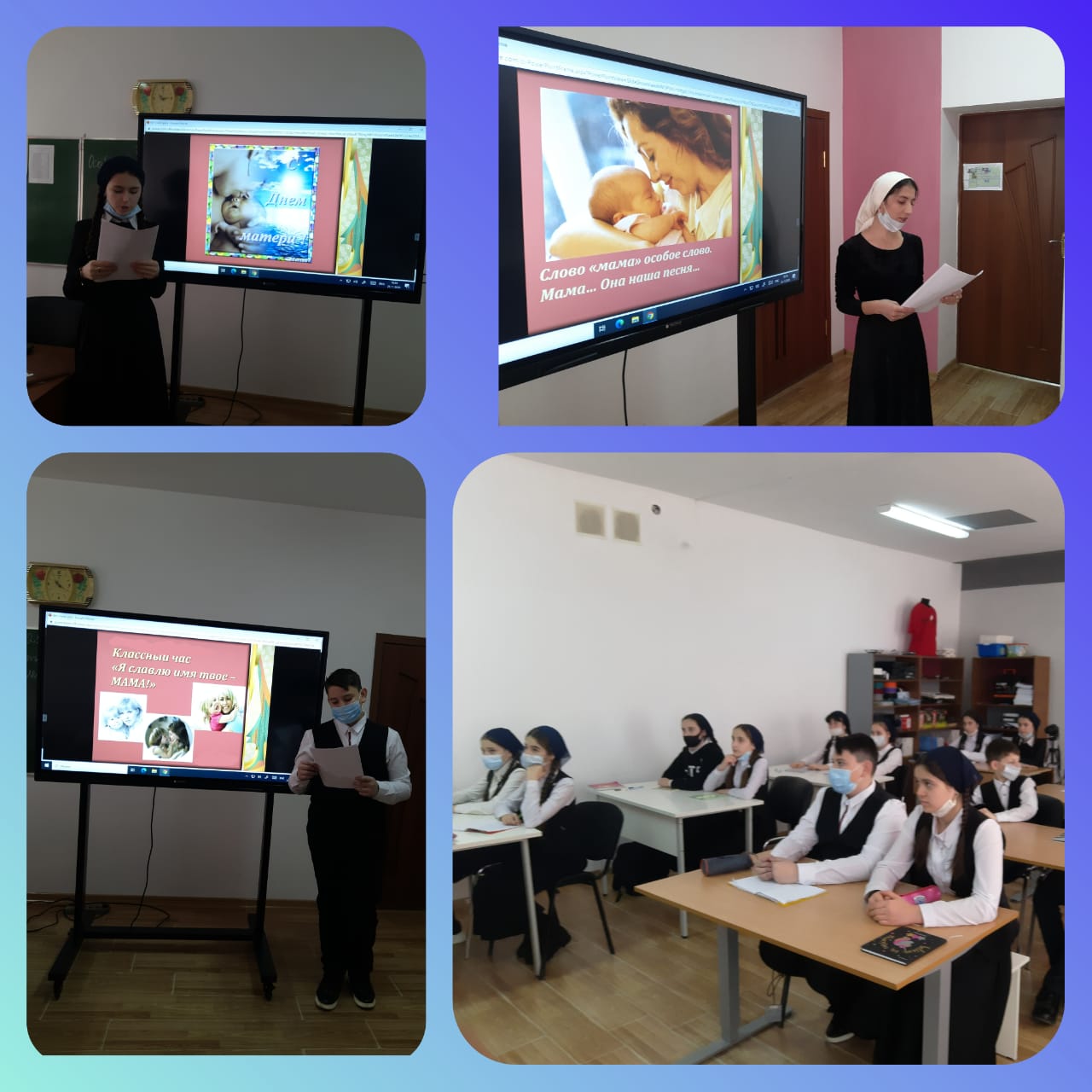 25.11.2020г. учительница начальных классов Хизриева И.С. провела классный час в 7 А классе на тему: "Я славлю имя твое - МАМА!".