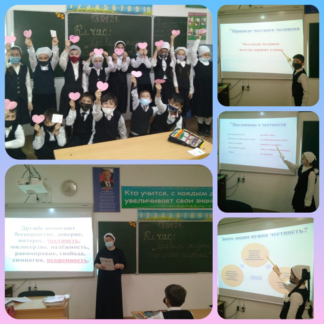 13.01.21г. классный руководитель Хизриева Лариса Мустафаевна провела классный час в 3"А" классе на тему: "Правила жизни честного человека".