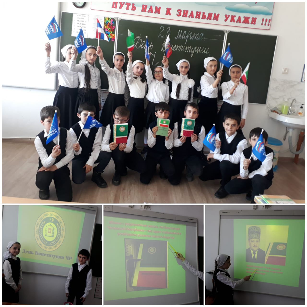 19.03.2021г. классный руководитель Досуева М.Т. провела в 4 «Б» классе классный час на тему: «23 марта - День Конституции ЧР».