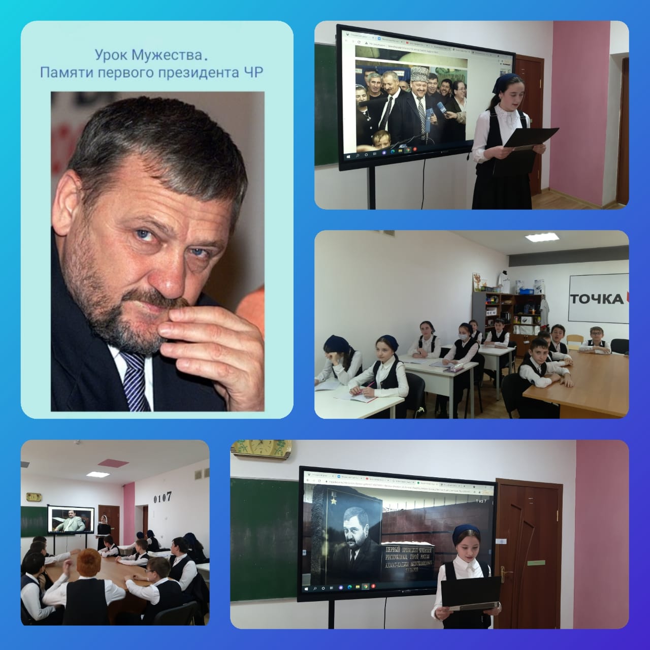 28.04.2021г. классный руководитель Хизриева И. С. провела в 7"А" классный час:" Урок Мужества. Памяти Первого президента Чеченской Республики".