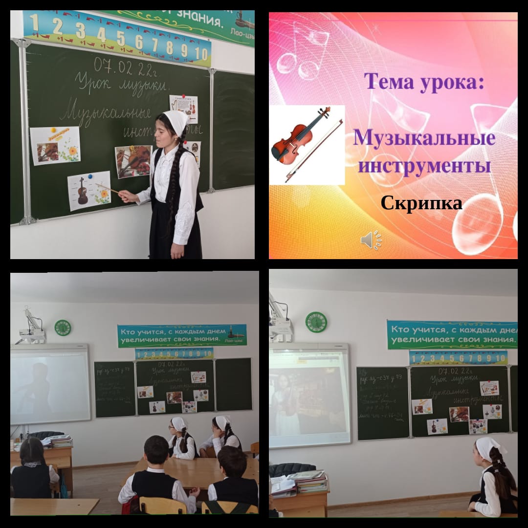 07.02.2022Учительница начальных классов Хизриева Л. М. провела в 4 "А" классе провела урок музыки на тему: Музыкальные инструменты. Скрипка" Учащиеся познакомились с разными видами струнных музыкальных инструментов. Подробнее узнали о скрипке. Посмотрели видеоролик и прослушали прекрасное звучание скрипки. Также посмотрели познавательный видеоролик, в котором увлекательно и интересно рассказывалось об истории появления скрипки, о великих мастерах, создателях скрипки, об устройстве этого "волшебного" инструмента.