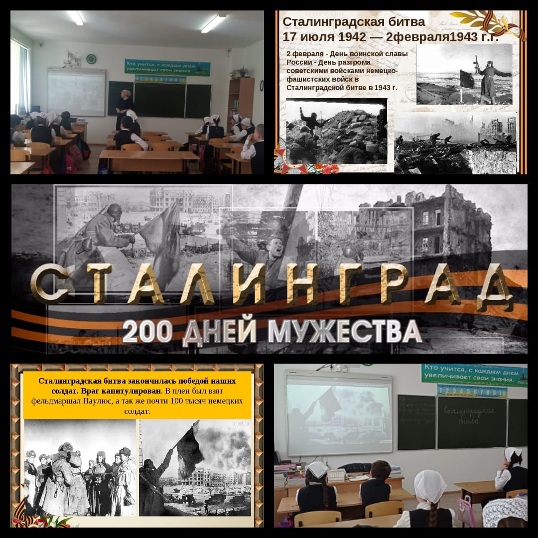05.02.2022Учительница начальных классов Хизриева Л. М. провела Урок Мужества в 4 "А" классе, посвящённый Сталинградской битве. Обучающиеся посмотрели хронику Сталинградской битвы. Учащиеся узнали много о героизме и мужестве солдат, о подвигах медсестёр. Познакомились с историческими памятниками: "Мамаевым курганом", " Домом Павлова". Л. М. Хизриева отметила, что Сталинградская битва длилась 200 дней и ночей. Борьба шла за каждую улицу, каждый завод, дом, подвал или лестничный проход... Но советские войска сорвали план противника и разгромили фашистские войска 02 февраля 1943г.