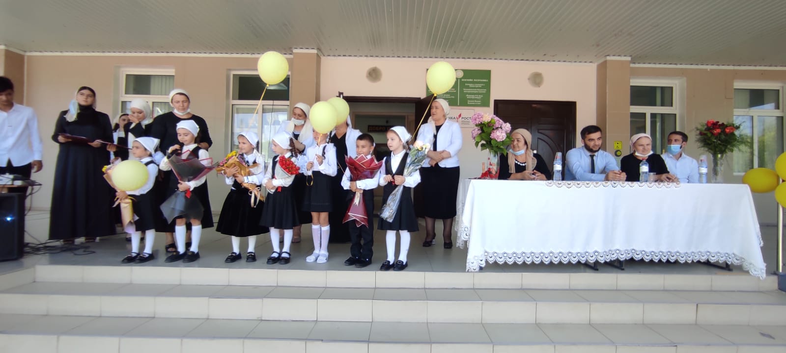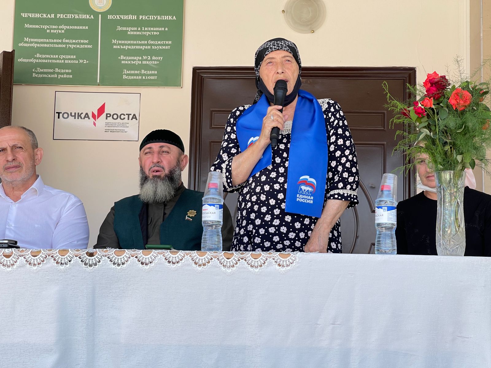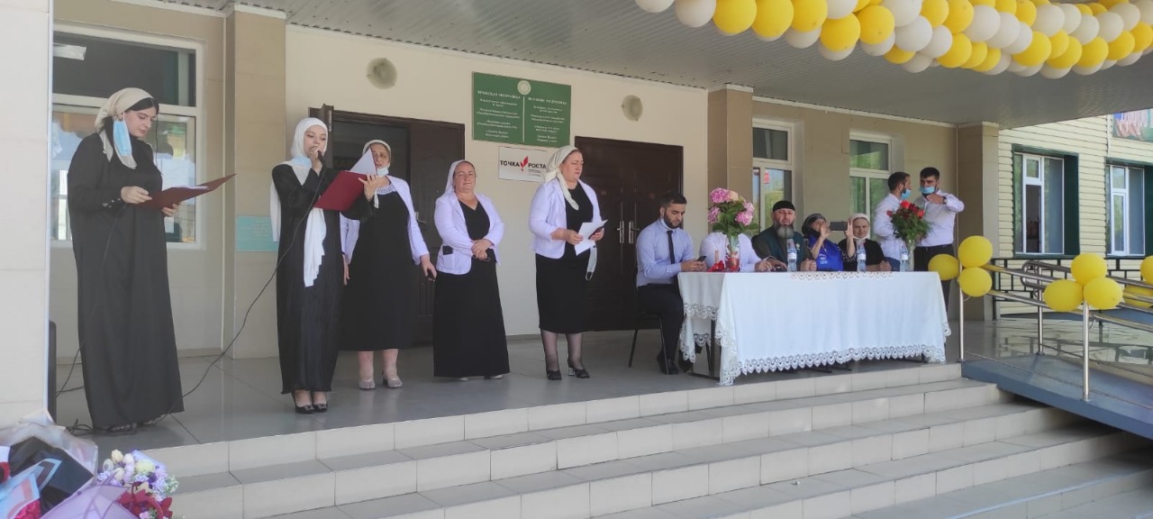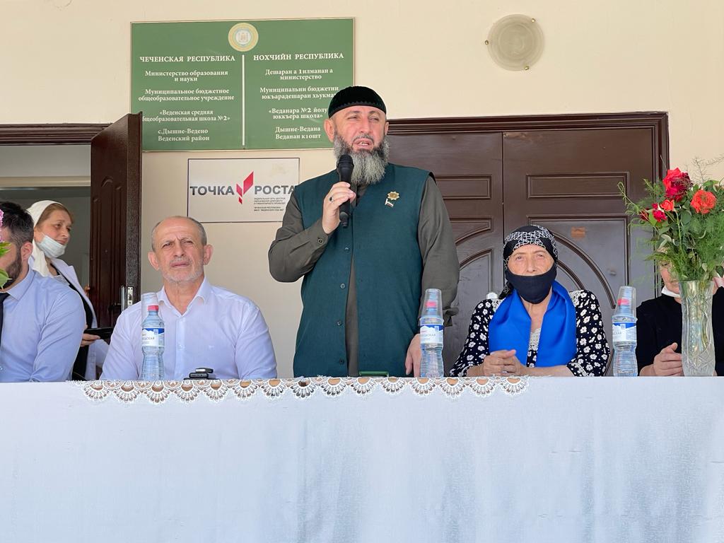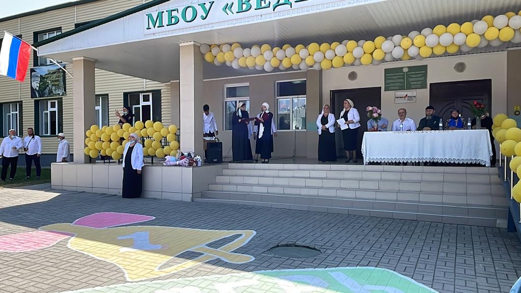 На торжественной линейке присутствовали гости: депутат парламента Чеченской Республики Ханбиев Магомед, зам муфтия республики и депутат парламента Чеченской Республики Джафаров Арби, исполнительный секретарь Веденского местного отделения партии Единая Россия Дадакаева Зухра, представители районной администрации Кусиева Зара и Досуев Лом-Али.