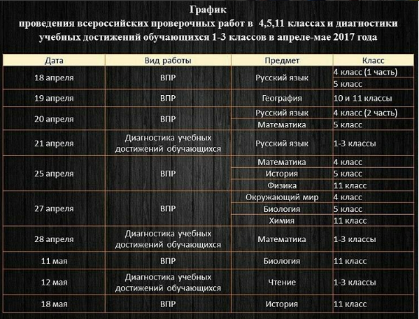 07.04.2017Уважаемые друзья!!! Предлагаем ознакомиться с графиком Всероссийских проверочных работ (ВПР), которые проводятся согласно распоряжения Рособрнадзора в 4-х классах в штатном режиме, в 5-х, 10-11-х классах в режиме апробации. Информационное и технологическое сопровождение подготовки и проведения ВПР осуществляется на сайте www.eduvpr.ru
