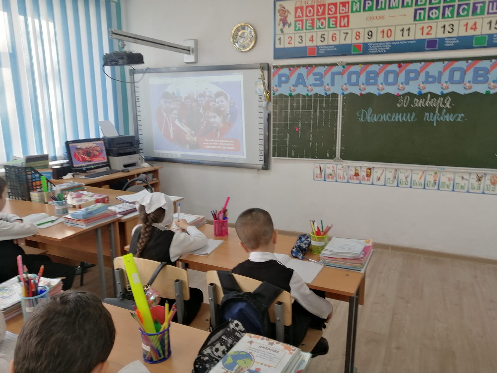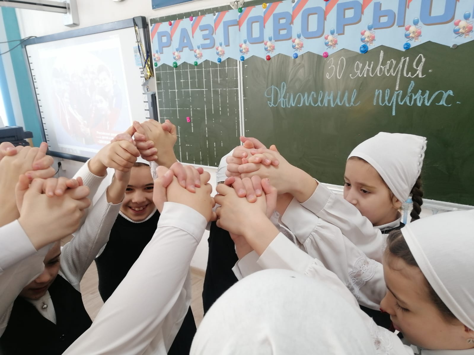 30.01.2023С целью сформировать первоначальные представления Российского движения детей и молодежи Детей и молодежи «Движения первых», создать условия для проявления активной гражданской позиции школьников, мотивировать учащихся к РДДМ, 30 января 2023 года было проведено очередное внеурочное занятие цикла «Разговоры о важном» по теме: «Движение первых».