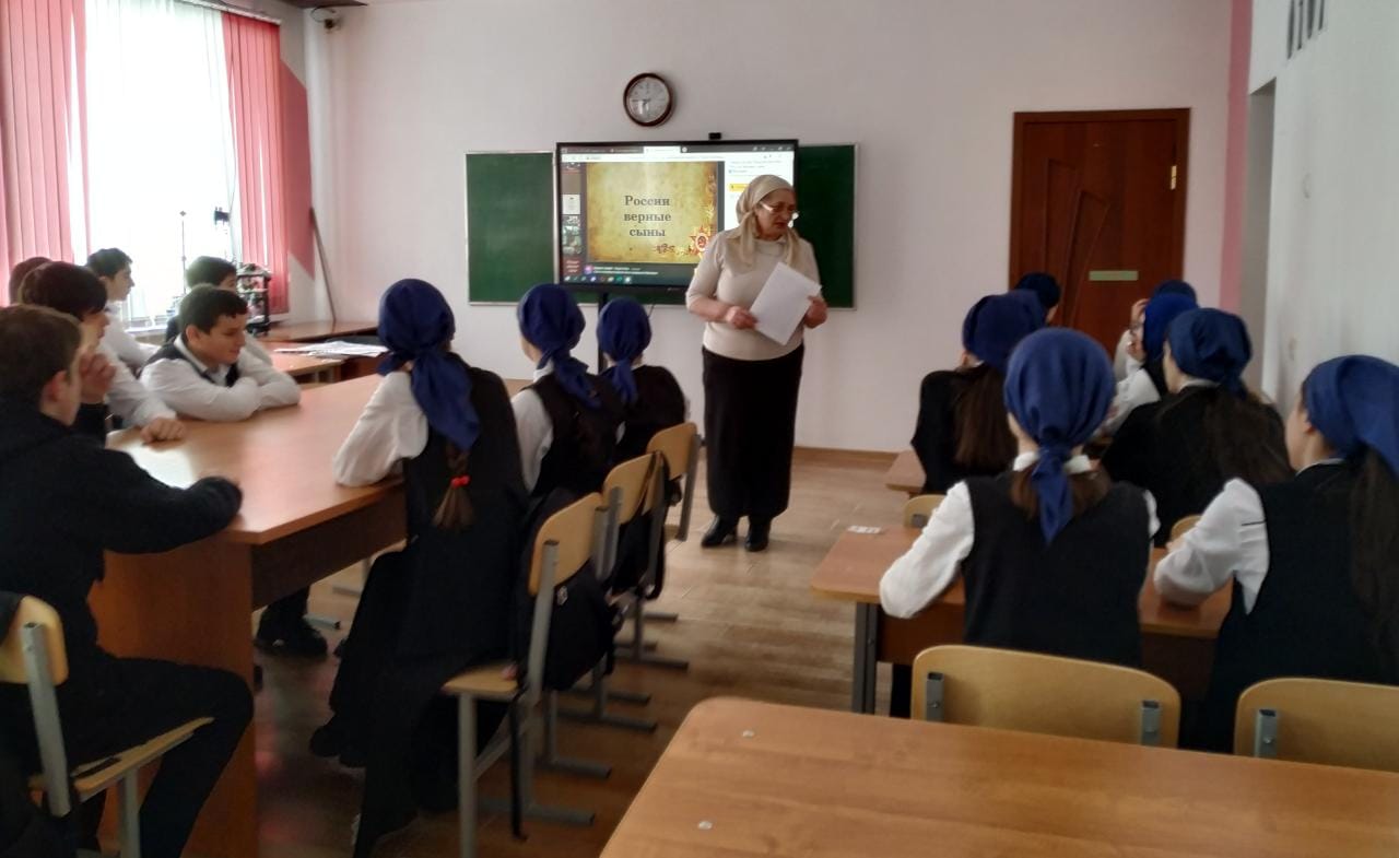 15.02.202315.02.2023 года классный руководитель 8 а класса Магомедова Р.Л. провела классный час на тему: «России верные сыны» ко дню памяти о россиянах, исполняющих свой служебный долг за пределами Отечества.
