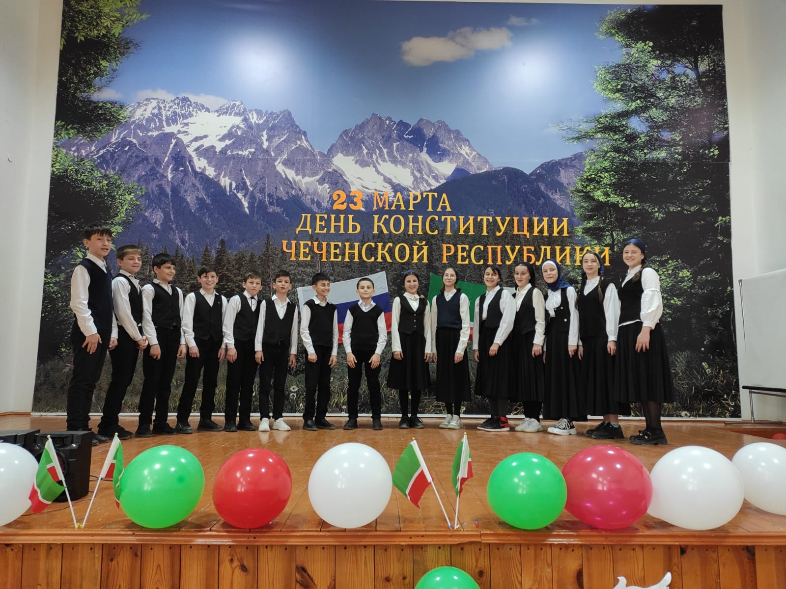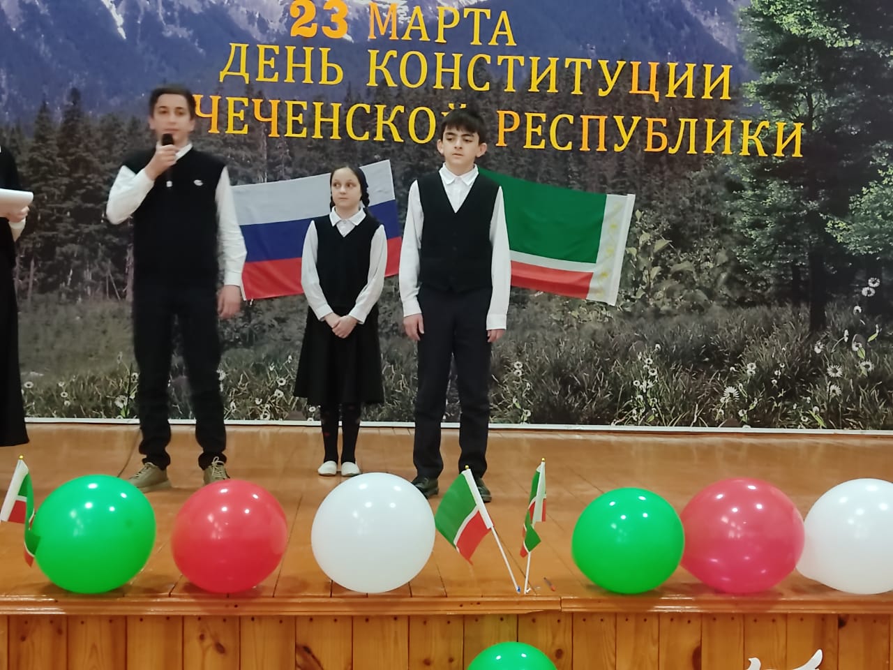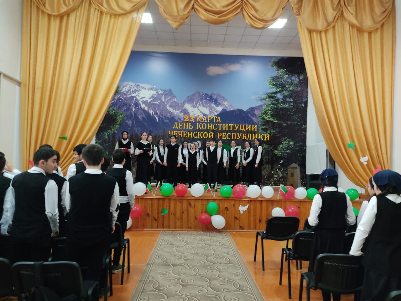 22.03.2023 года было проведено в актовом зале торжественное мероприятие посвященное Дню Конституции ЧР. Учащиеся исполнили гимн Чеченской Республики, читали стихи, пели песни о родине.