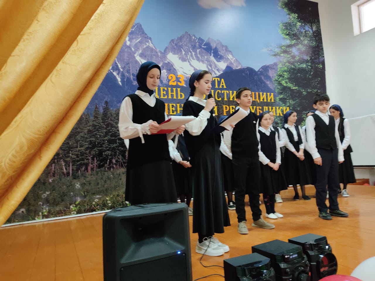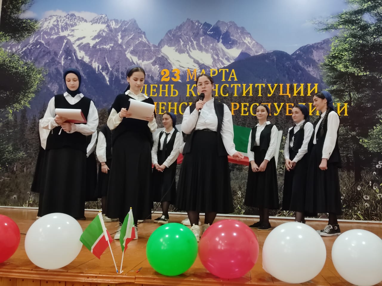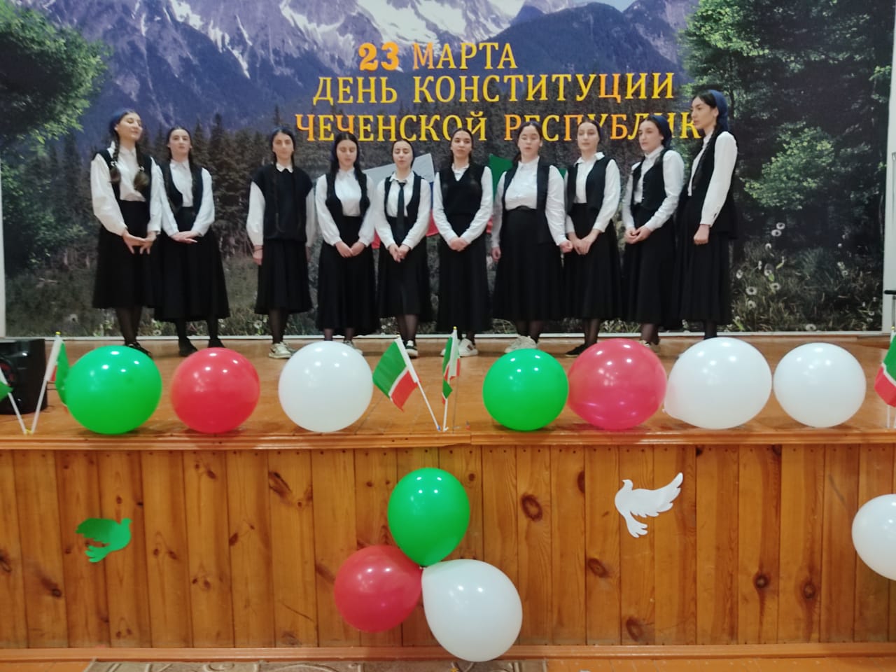 22.03.2023 года было проведено в актовом зале торжественное мероприятие посвященное Дню Конституции ЧР. Учащиеся исполнили гимн Чеченской Республики, читали стихи, пели песни о родине.