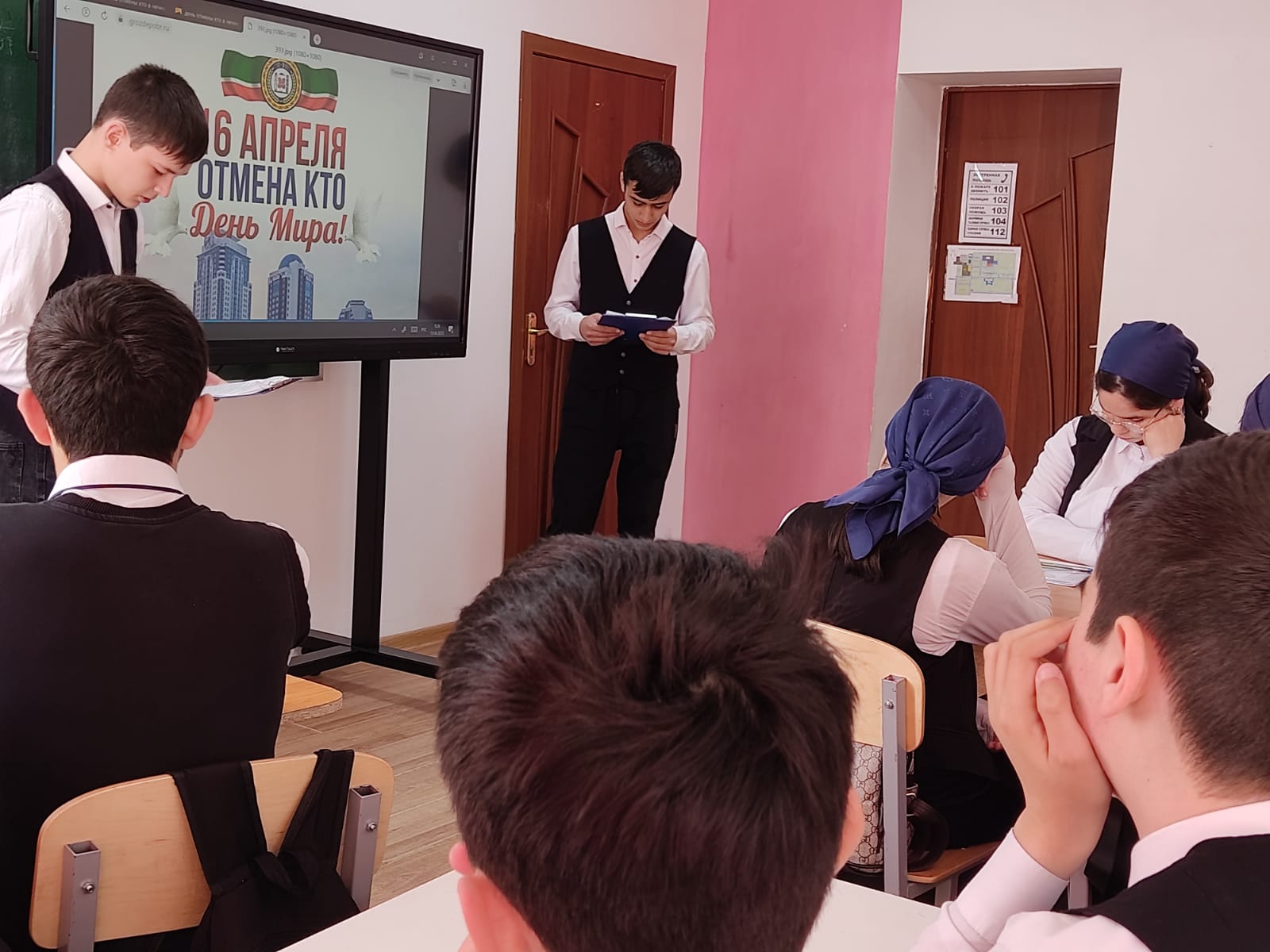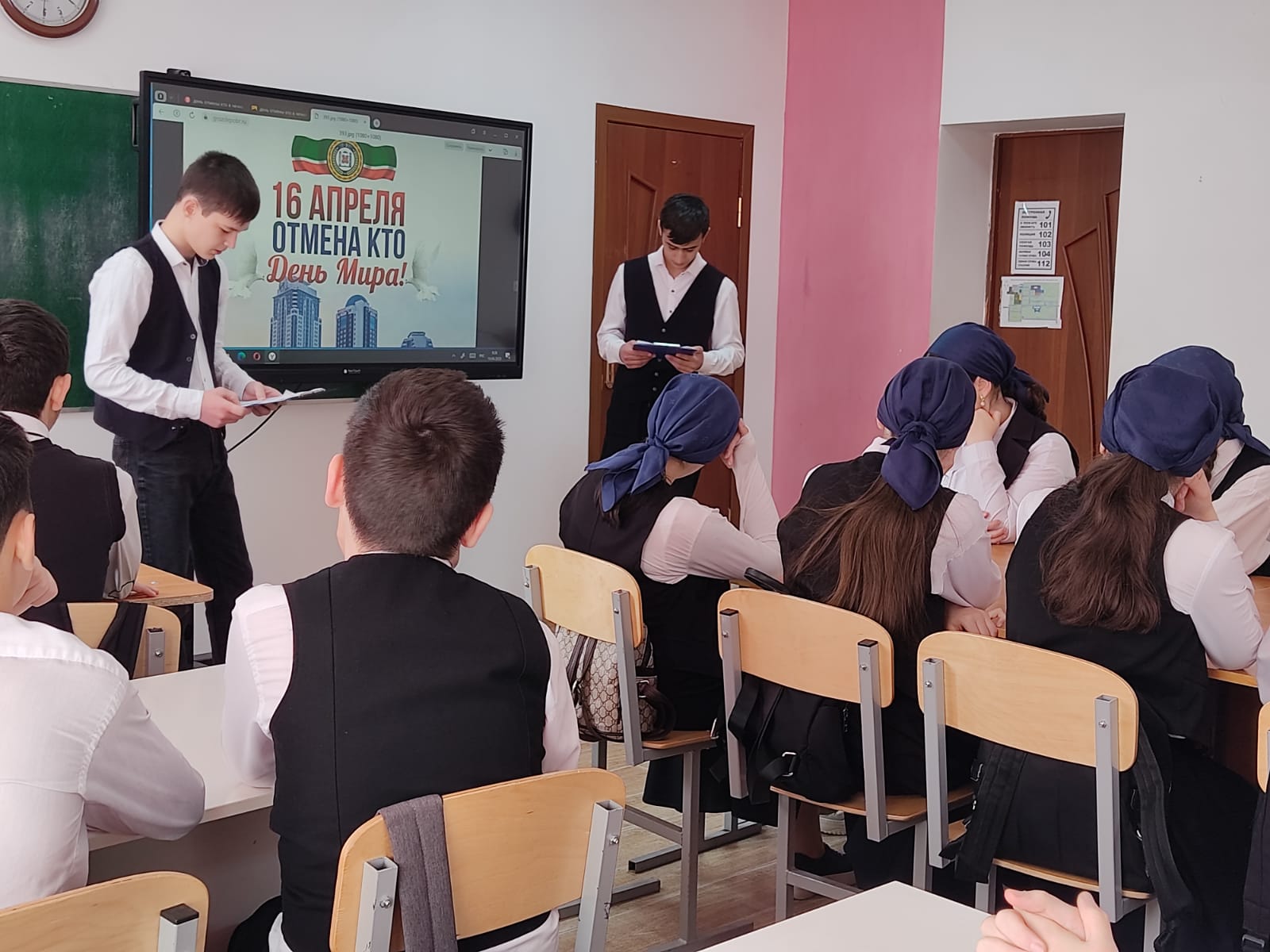19 апреля 2023 года с учащимися 8 а класса заместитель директора по воспитательной работы Роза Лемовна провела видео-лекторий на тему: «Отныне и навсегда 16 апреля – День мира на чеченской земле». Мероприятие направлено на информирование подрастающего поколения о важности этой даты, значимости отмены КТО, о событиях тех лет, которые способствовали возвращению жизни Чеченской Республики в мирное русло.