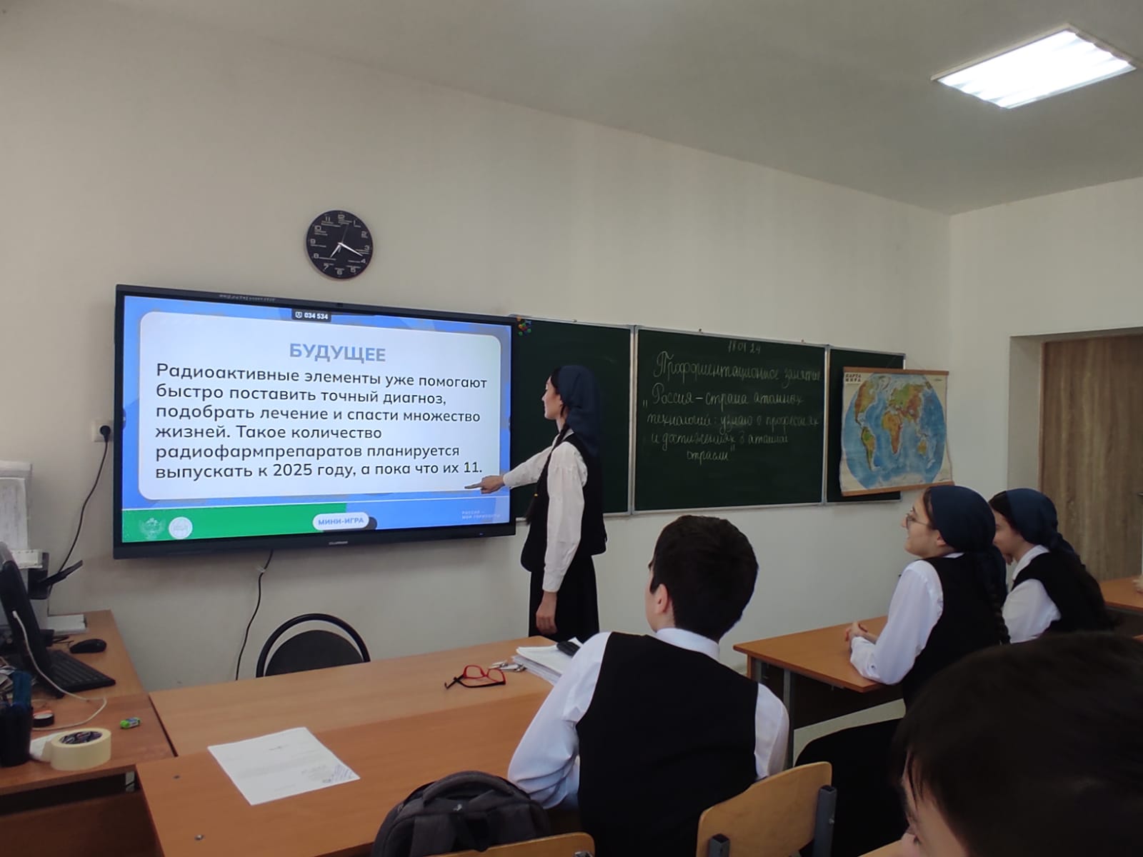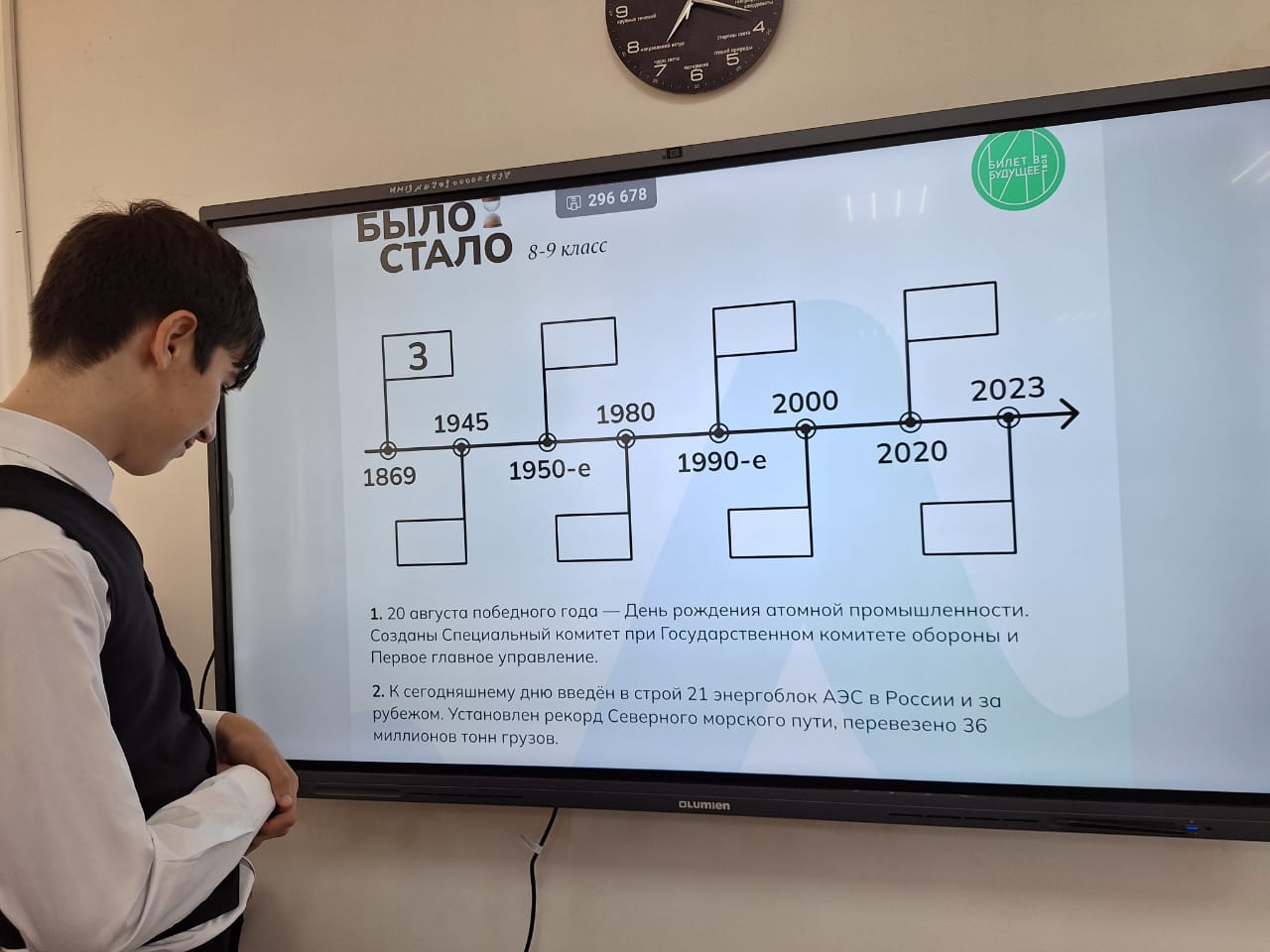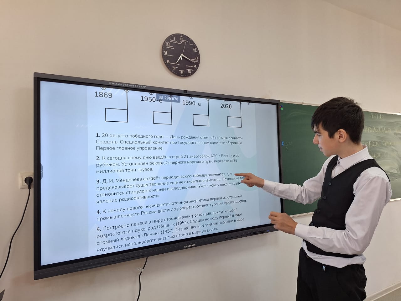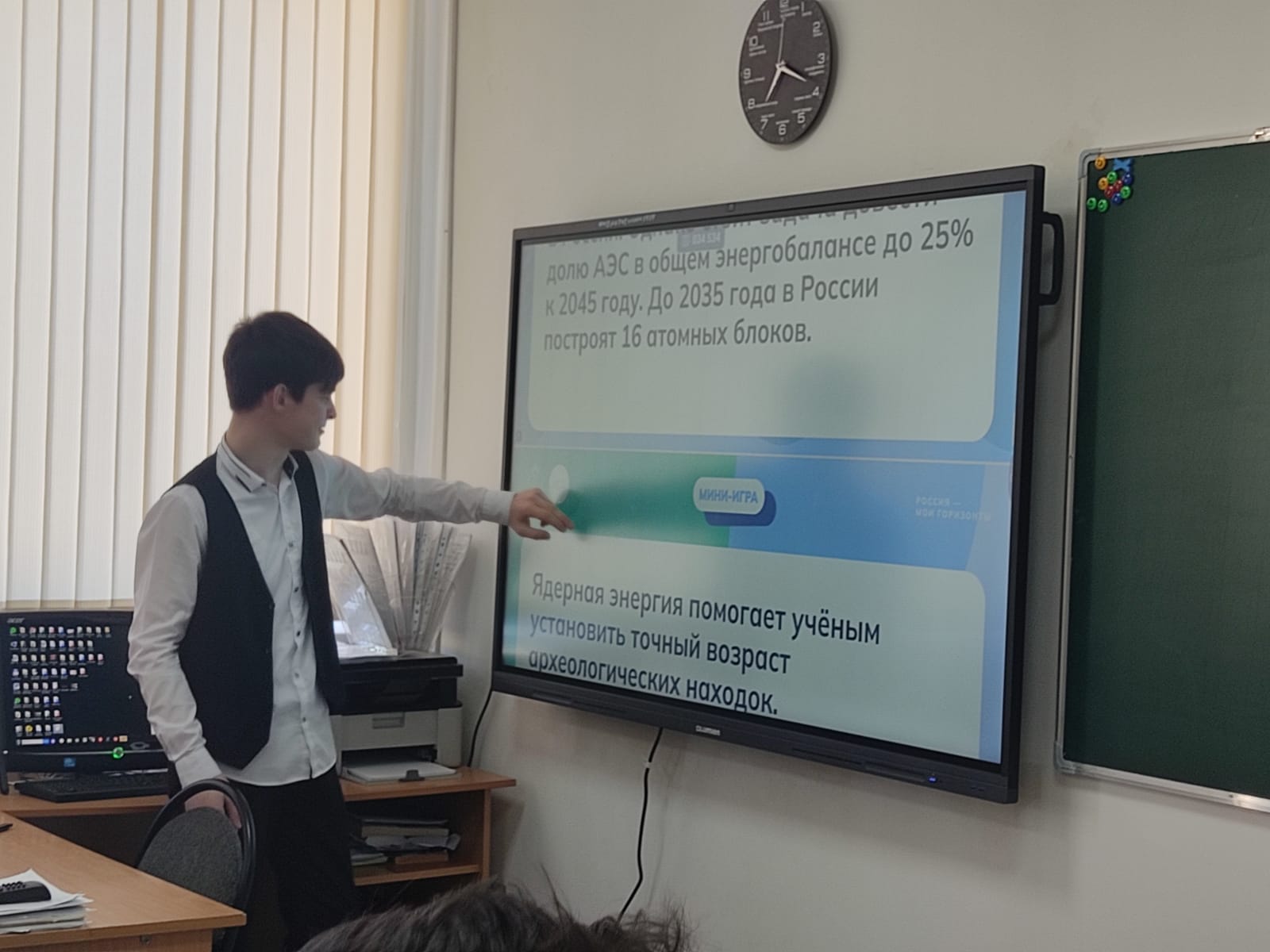 На занятии ребята посмотрели и обсудили видеоролики, поработали в группах и узнали много нового о профессиях отрасли, поразмышляли о перспективах дальнейшего развития атомной сферы.