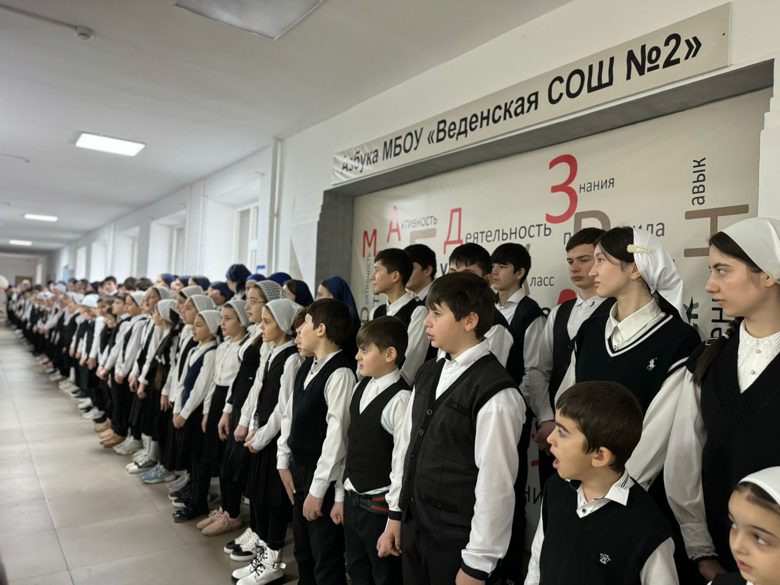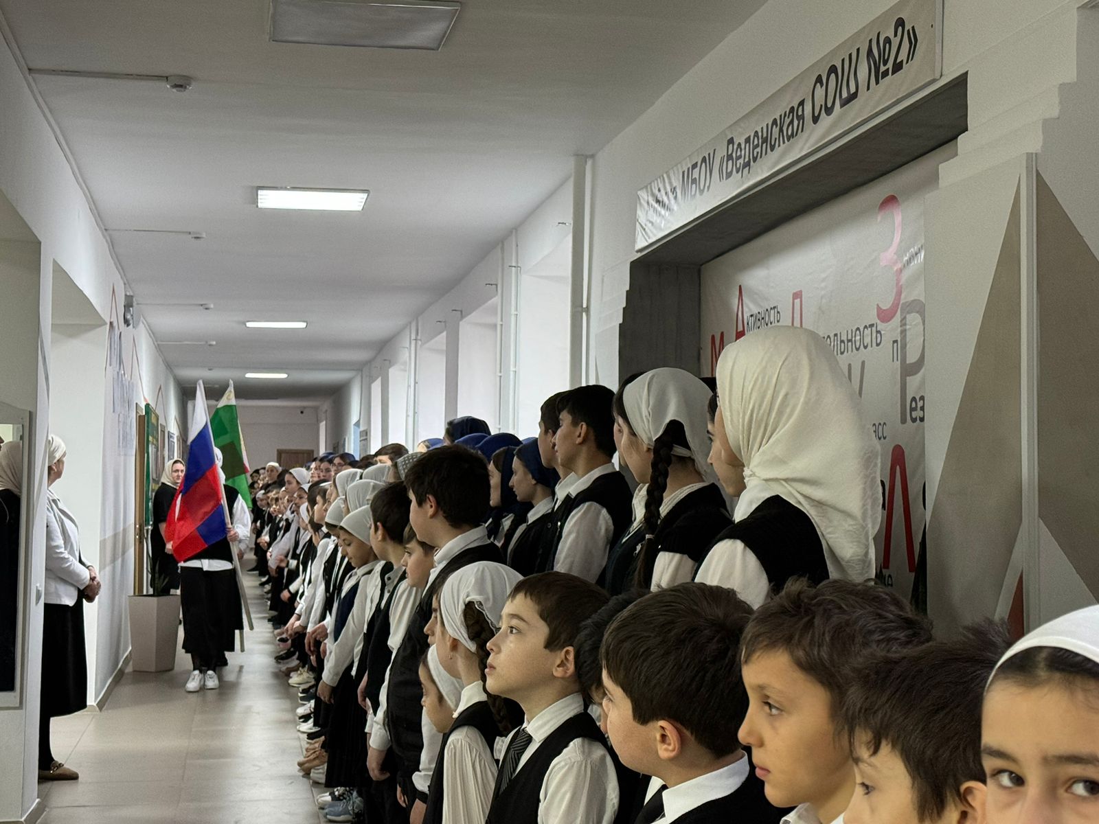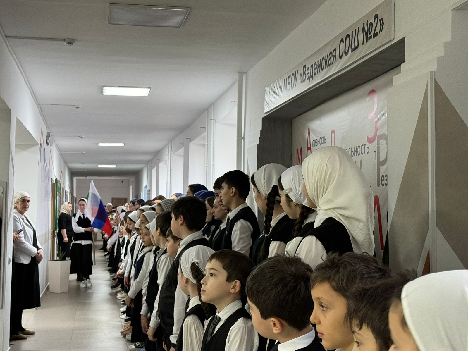 МБОУ «Веденская СОШ №2» открыла ее с торжественной церемонией выноса флагов Российской Федерации и Чеченской Республики под исполнением гимнов.