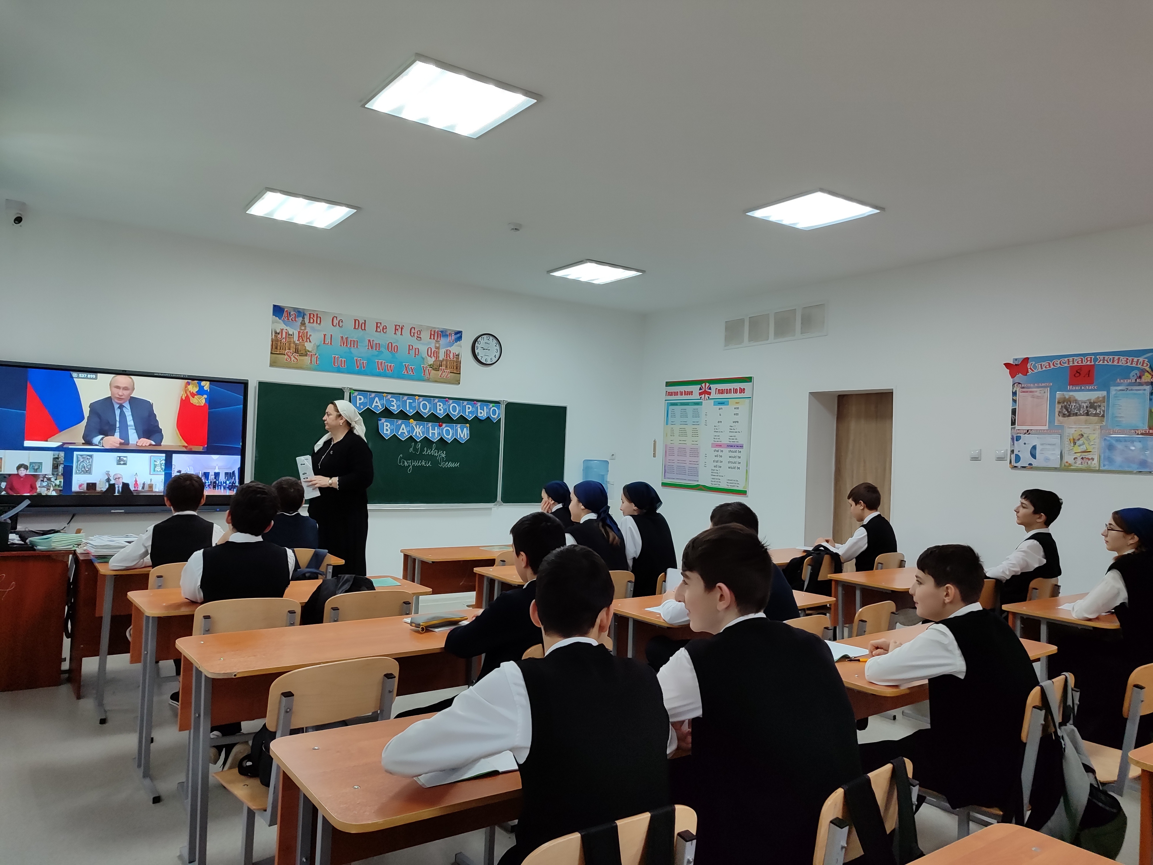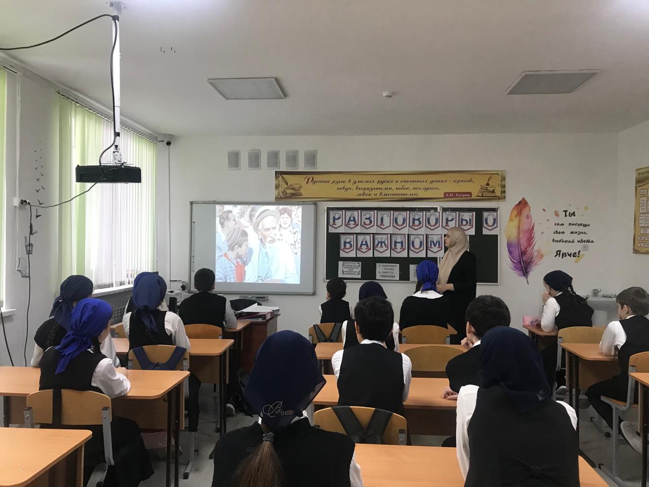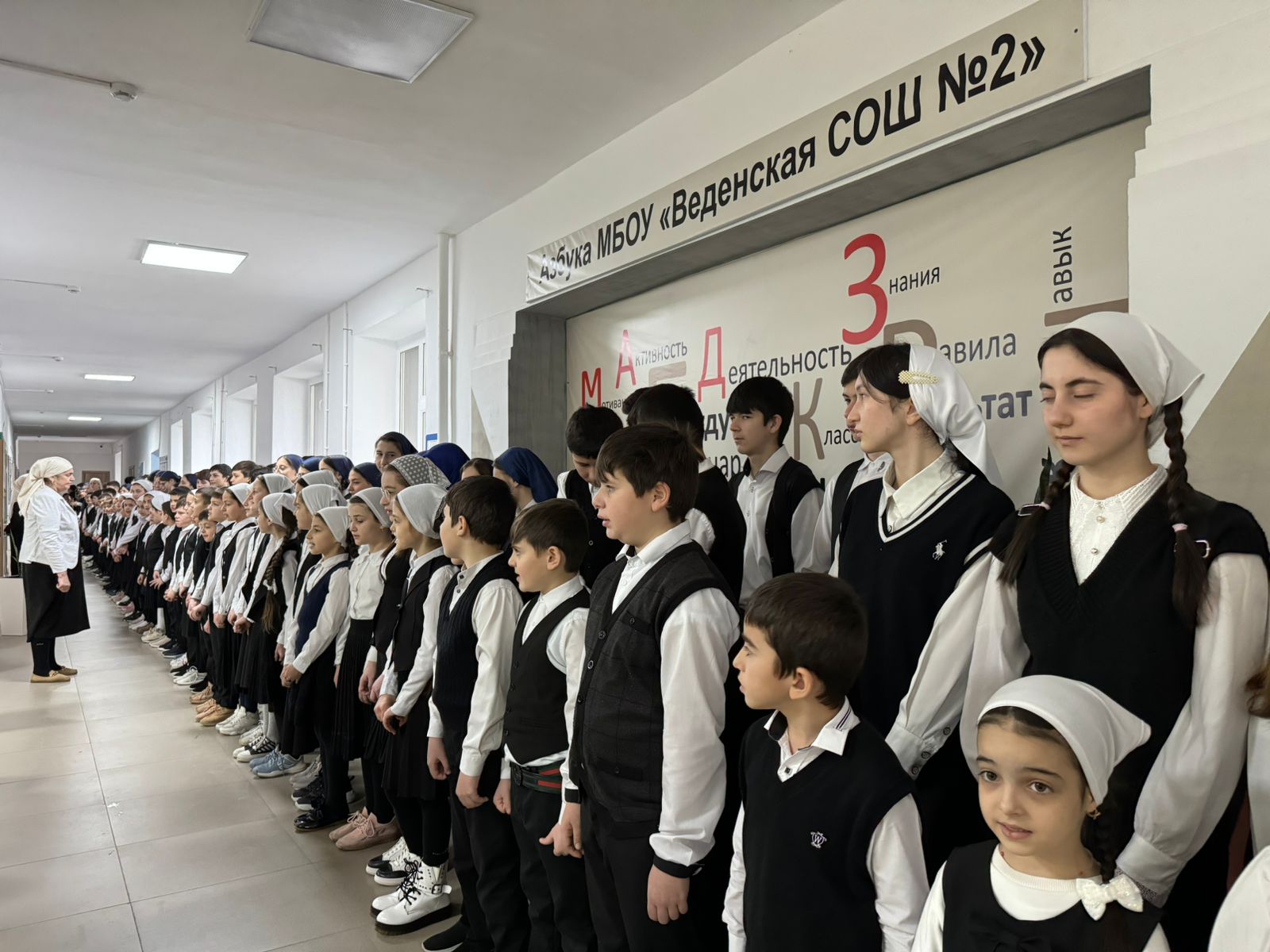 МБОУ «Веденская СОШ №2» открыла ее с торжественной церемонией выноса флагов Российской Федерации и Чеченской Республики под исполнением гимнов.