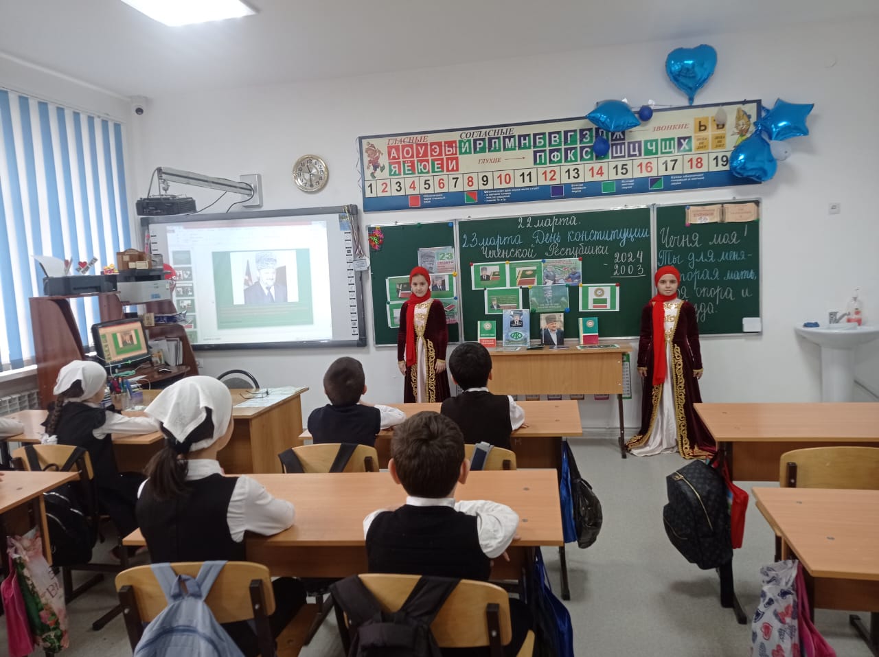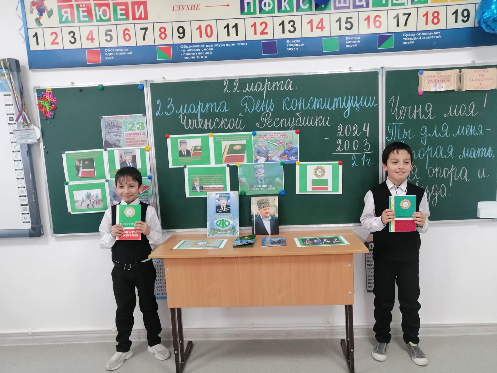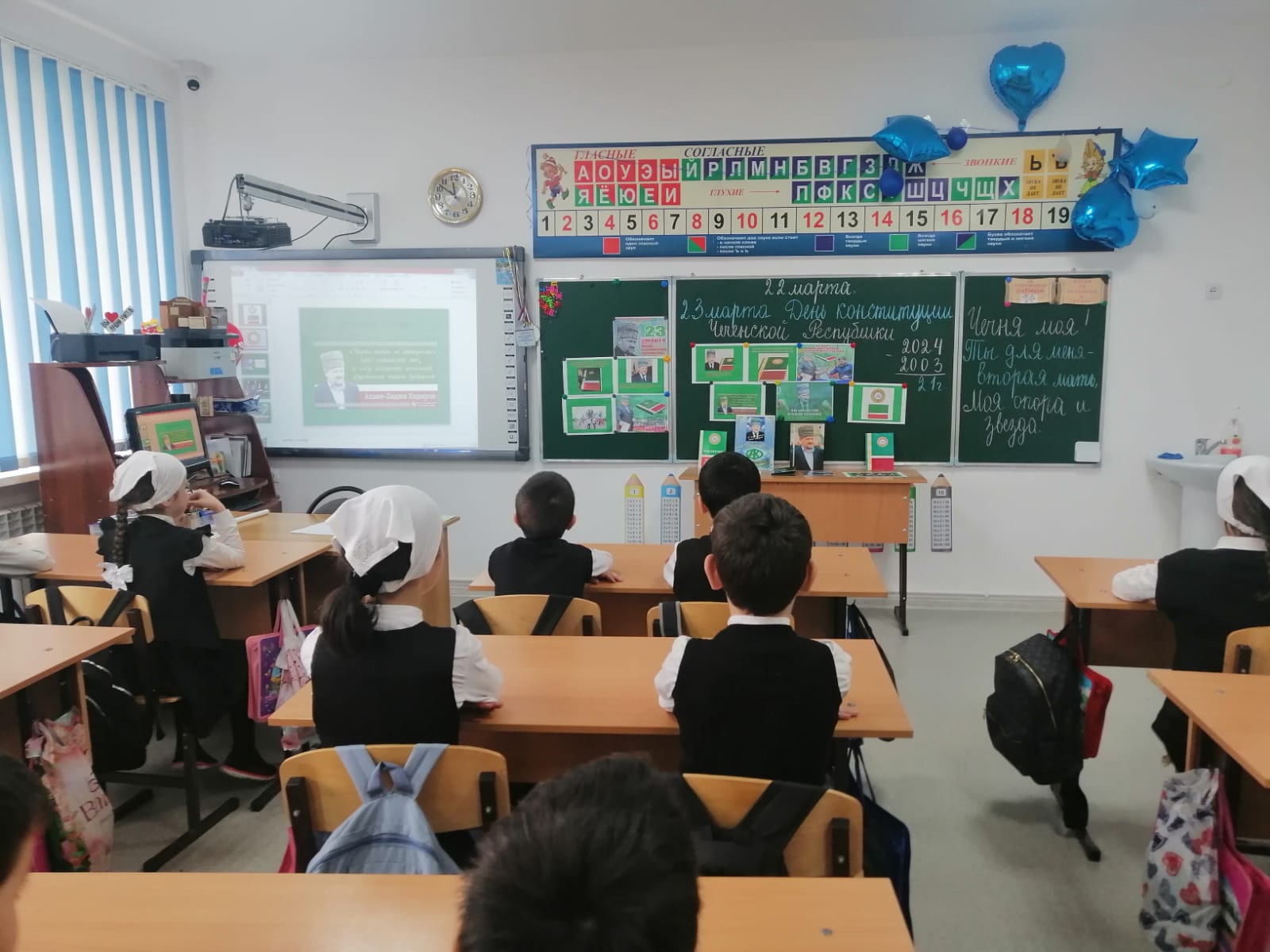 22.03.2024 г. классный руководитель 3 "А" и 3 "Б" класса Исраилова И.С. провела классный час на тему:"День Конституции Чеченской Республики ".