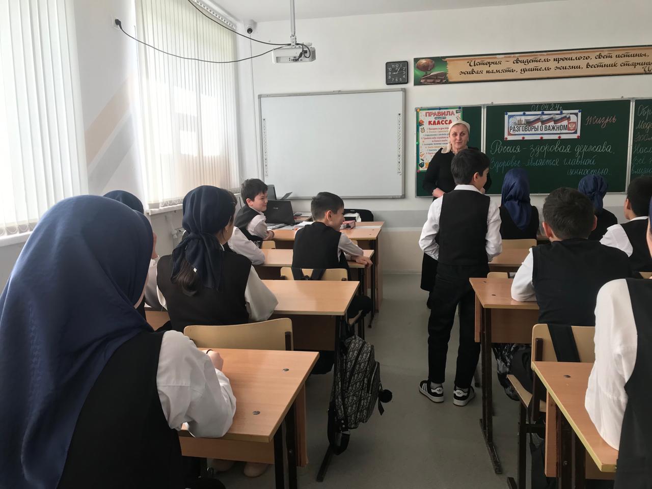 1 апреля в МБОУ «Веденская СОШ №2» прошли уроки, организованные в рамках проекта «Разговоры о важном» среди учеников 6-11 кл. на тему:«Россия — здоровая держава», которые были посвящены спорту, здоровому образу жизни и правильным привычкам, помогающим сохранить здоровье на долгие годы.