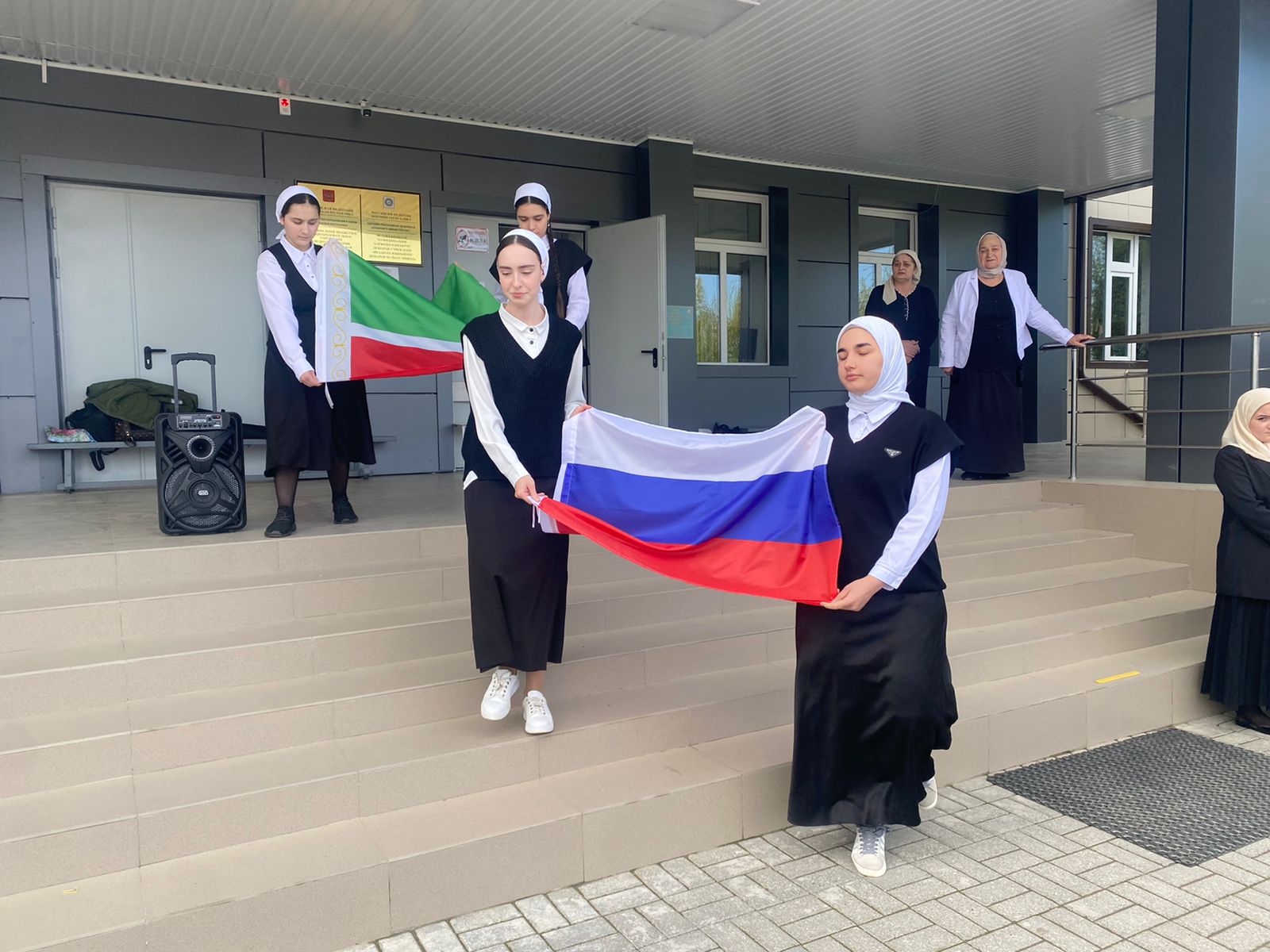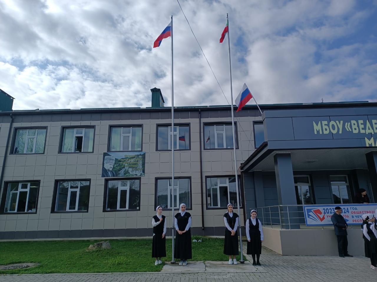 15 АПРЕЛЯ - утро понедельника в школе традиционно началось с торжественной линейки, церемонии поднятия флагов РФ и ЧР, и исполнения гимнов. Право поднять флаги предоставили ученицам 11 класса.