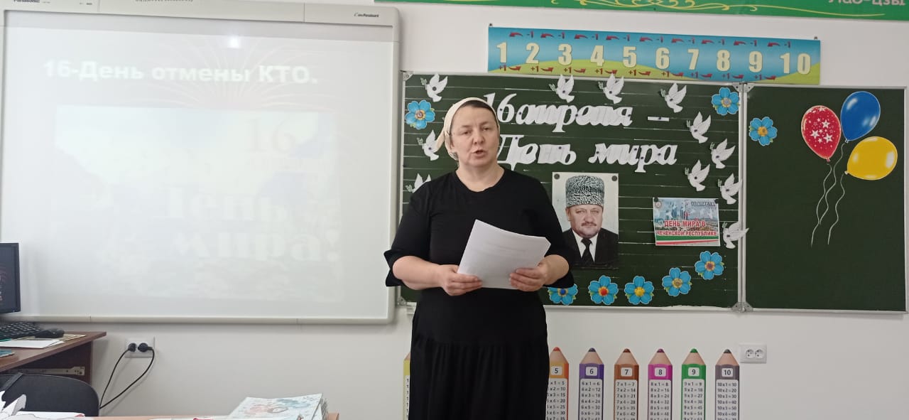 Классный час сопровождался презентацией с фотографиями Чеченской республики, и в частности города Грозного до и после отмены КТО.