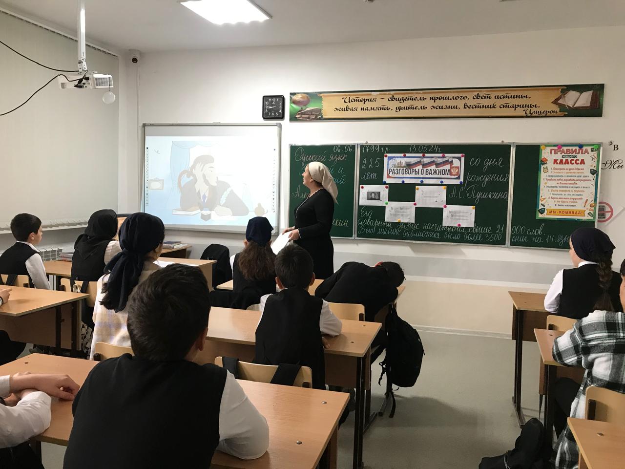 13 мая 2024 года в МБОУ «Веденская СОШ №2» прошли внеурочные занятия Разговоры о важном на тему:«Русский язык. Великий и могучий. 225 лет со дня рождения А.С.Пушкина».