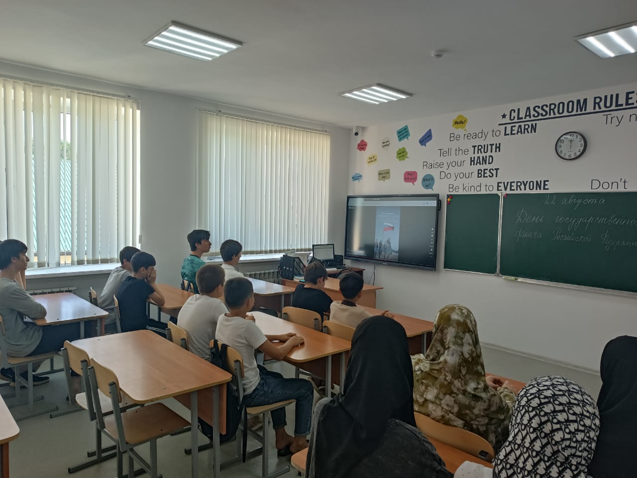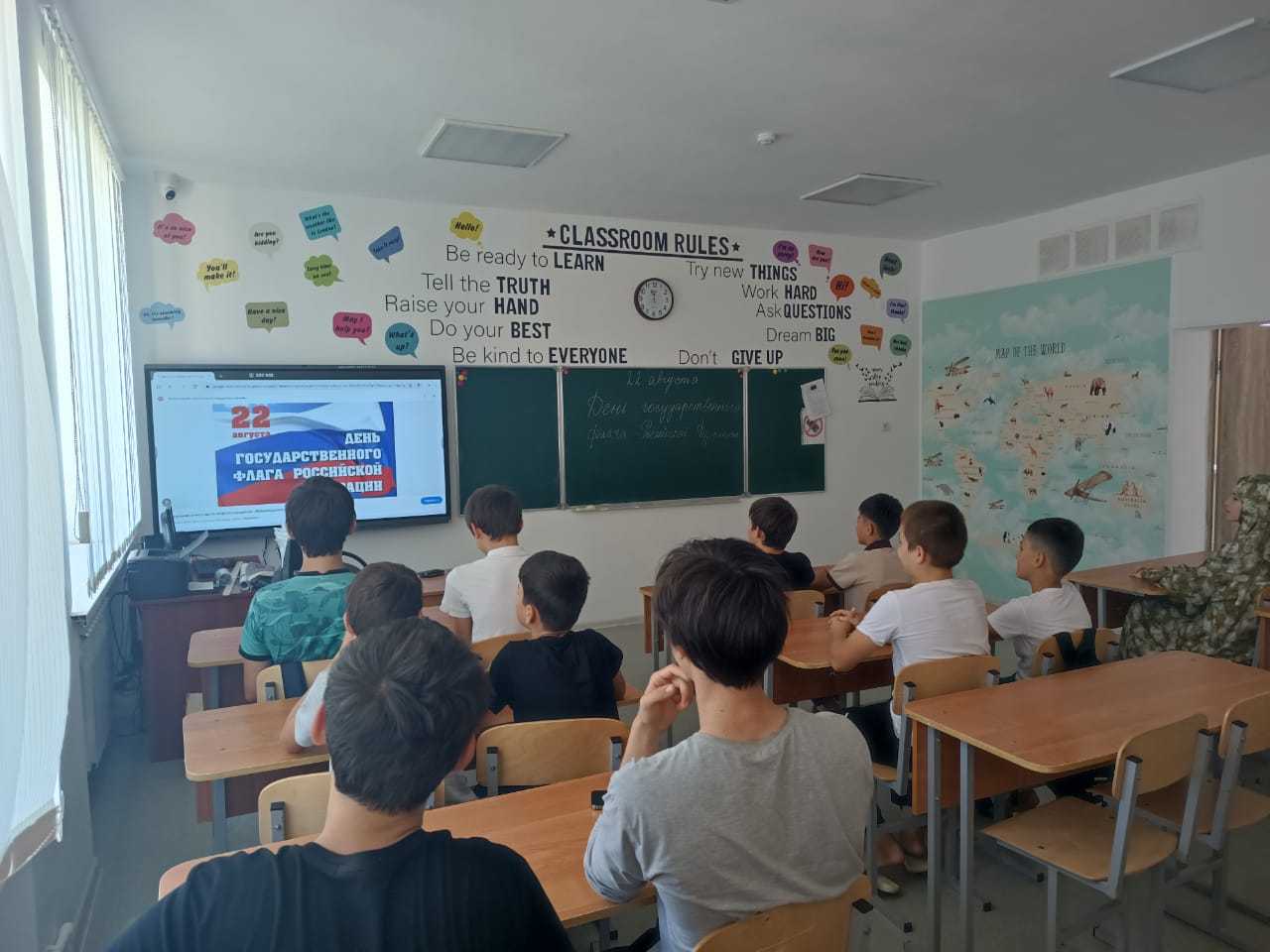 22.08.2024г. в МБОУ «Веденская СОШ № 2» советник директора по воспитанию и взаимодействию с детскими общественными объединениями Салбанова К.Н. провела кинолекторий ко Дню государственного флага РФ.