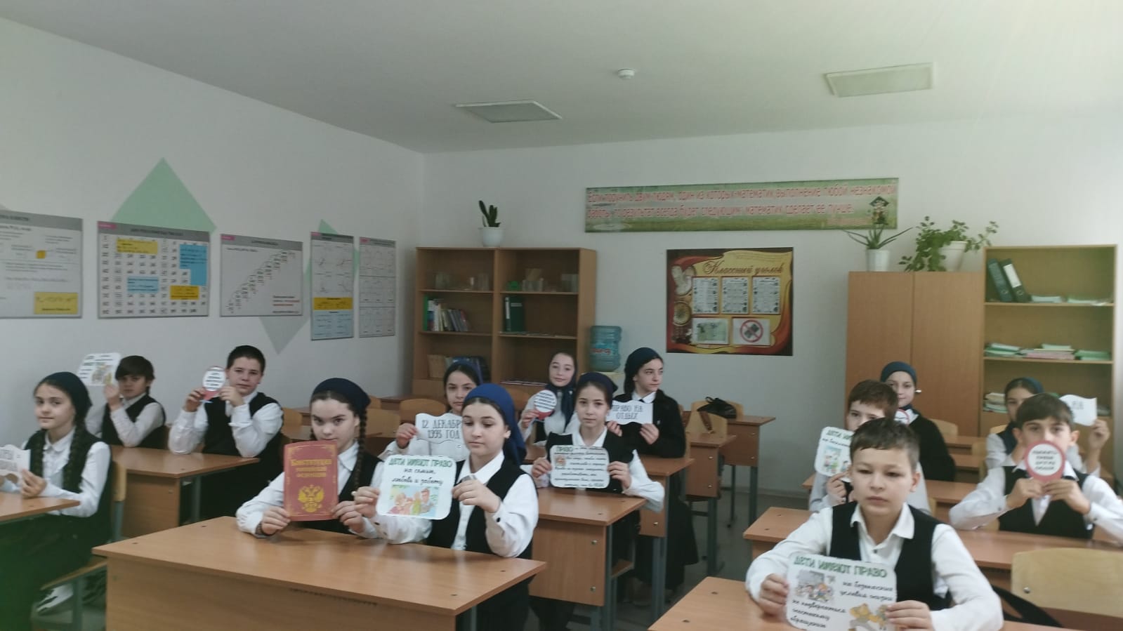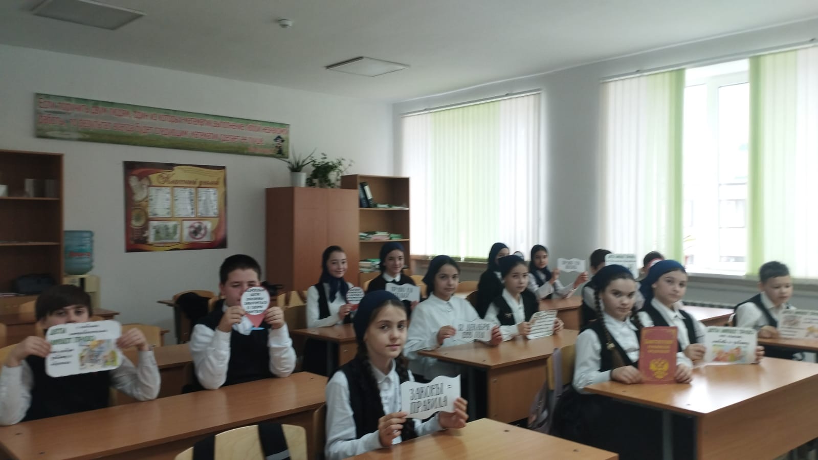 12 декабря 2024г классный руководитель 5 «А» класса Халилаева Э.Ш. провела классный час, посвященный Дню Конституции Российской Федерации. Целями проведения мероприятия было познакомить с историей этого праздника, понятием и основами конституционного строя, учить уважать законы страны, воспитывать гражданскую позицию. Учитель рассказала учащимся об истории Конституции России. Рассказ сопровождался показом слайдов презентации. А затем ребята вспоминали структуру и основное содержание главного Закона нашей страны.