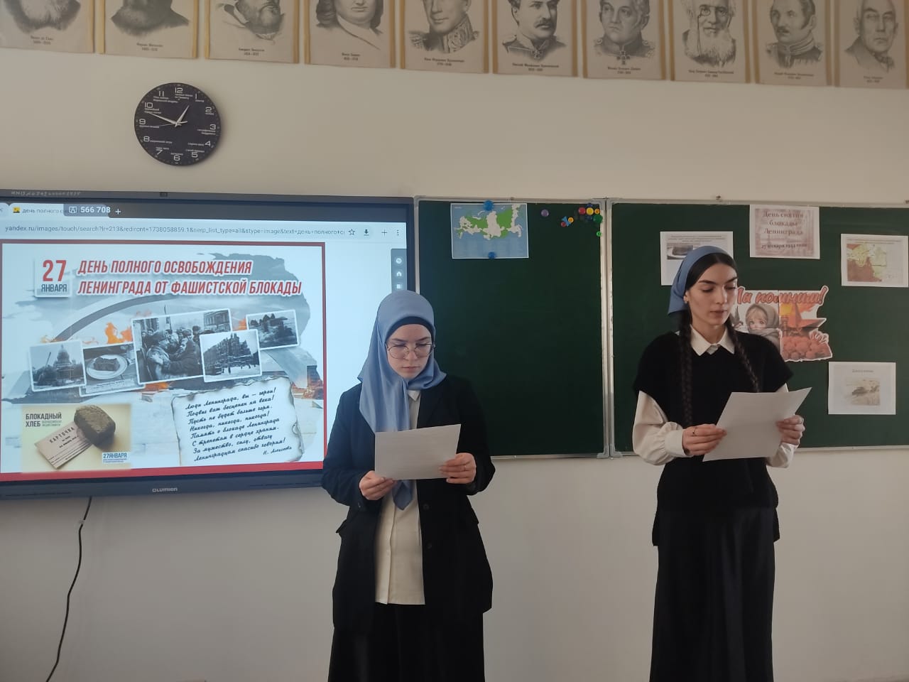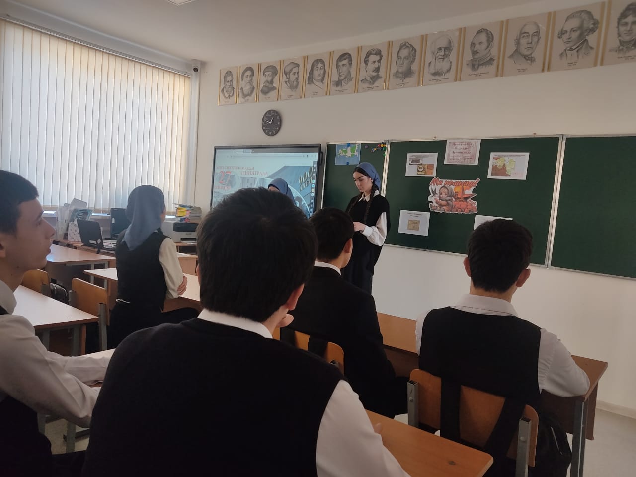 28 января классный руководитель 10 «А» Магомедова Р.Л.провела информационно познавательный час «Я помню город осажденный». Ведущие рассказали учащимся о тяжелых испытаниях, выпавших на долю жителей осажденного закрытого города Ленинграда. С помощью видео презентации старшеклассники узнали о голоде и холоде, о детях и женщинах, работавших наравне с мужчинами на заводах, о защите и обороне Ленинграда советскими солдатами.