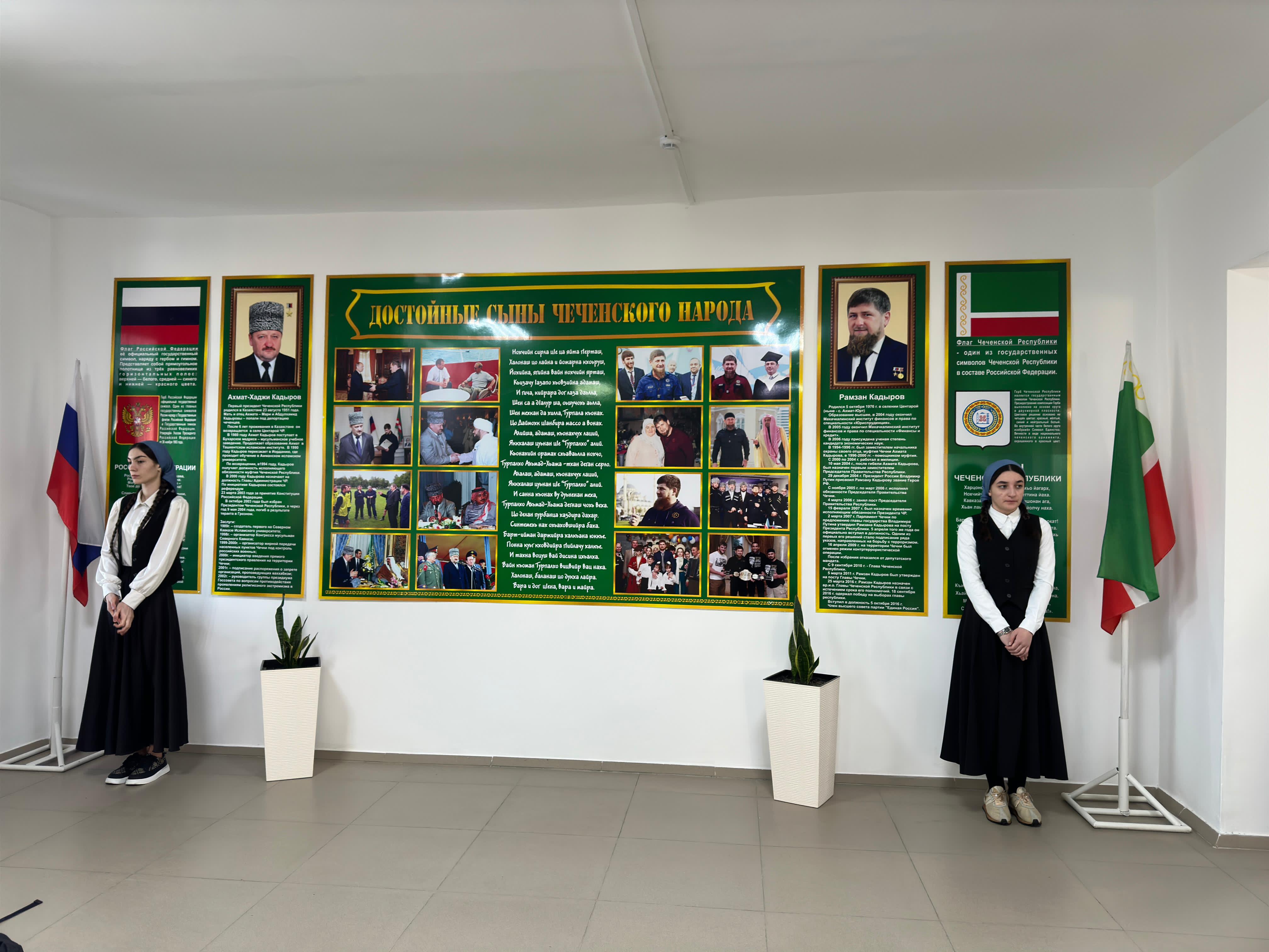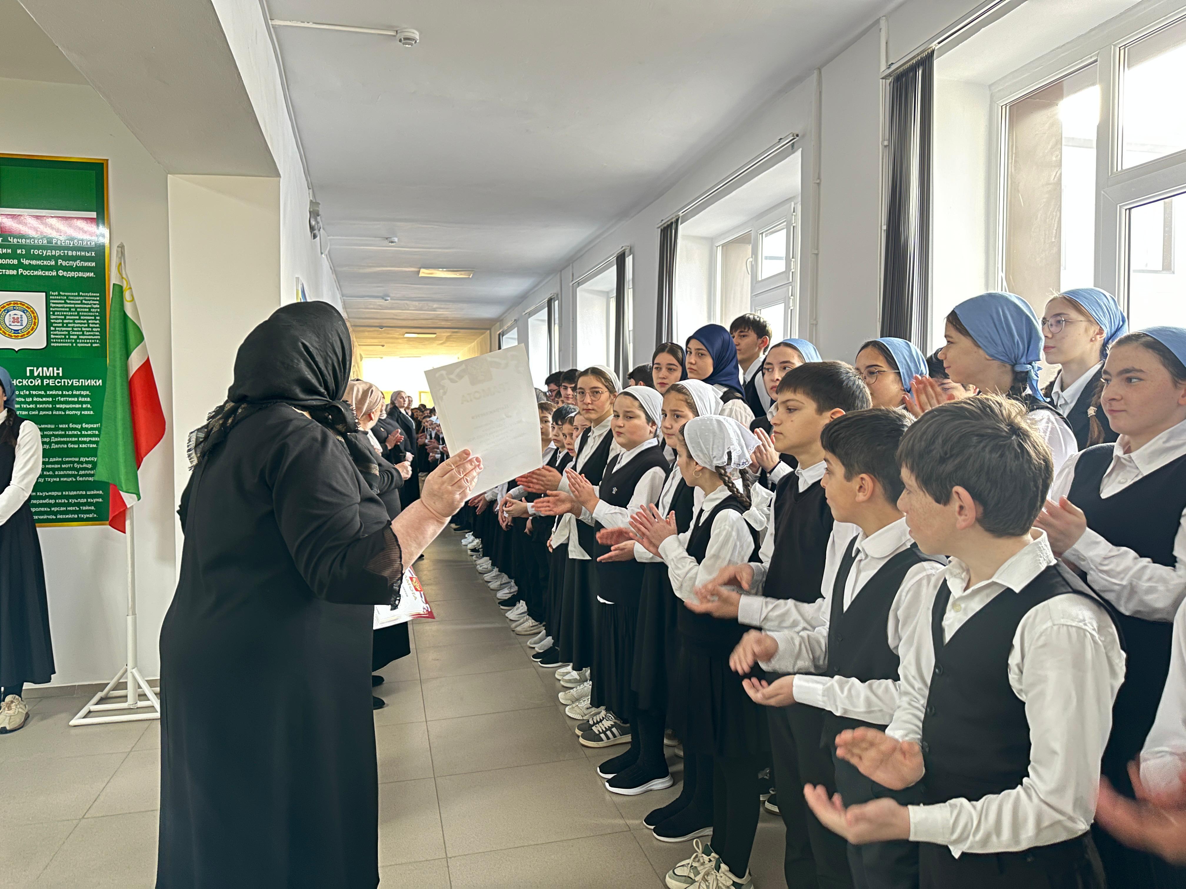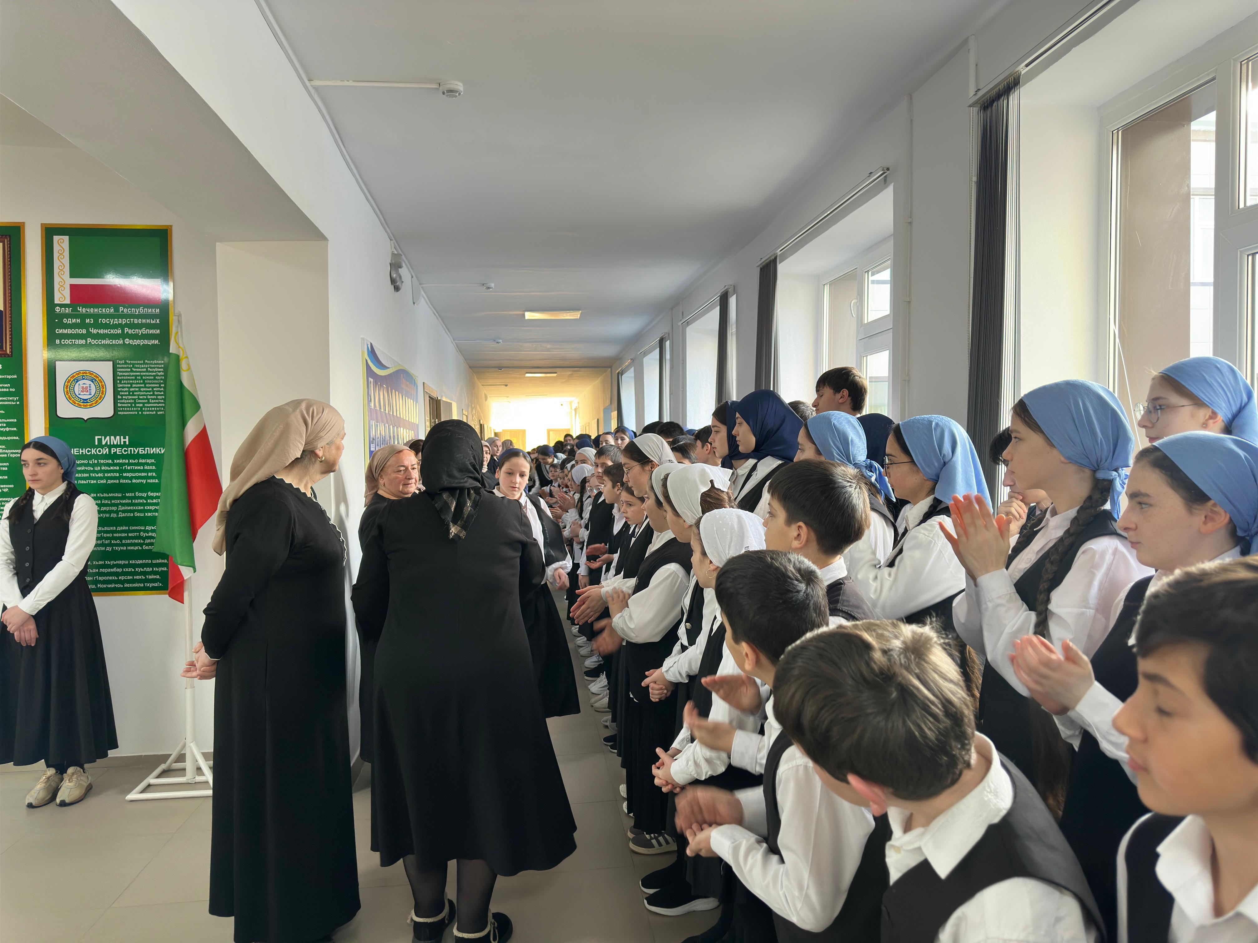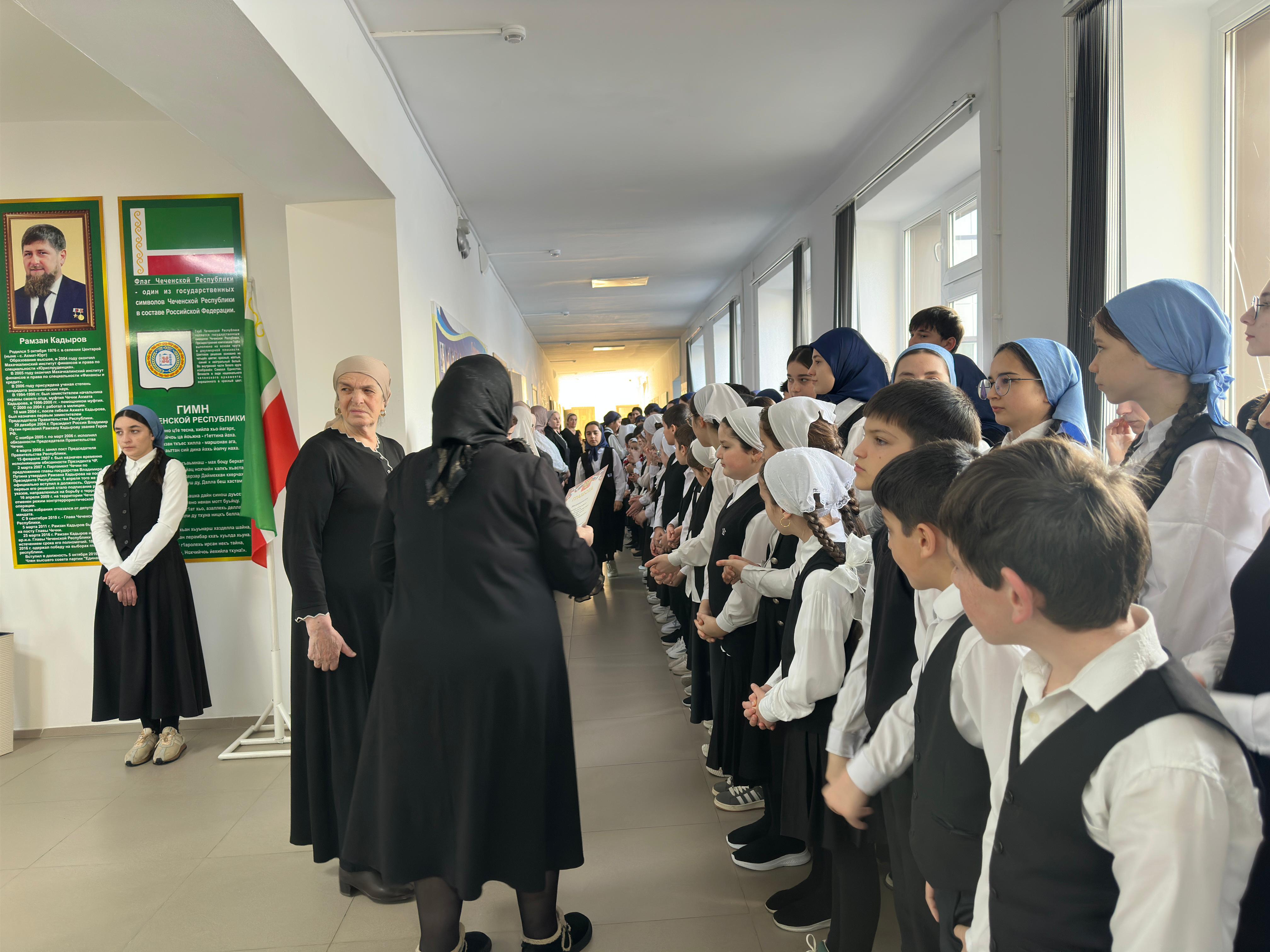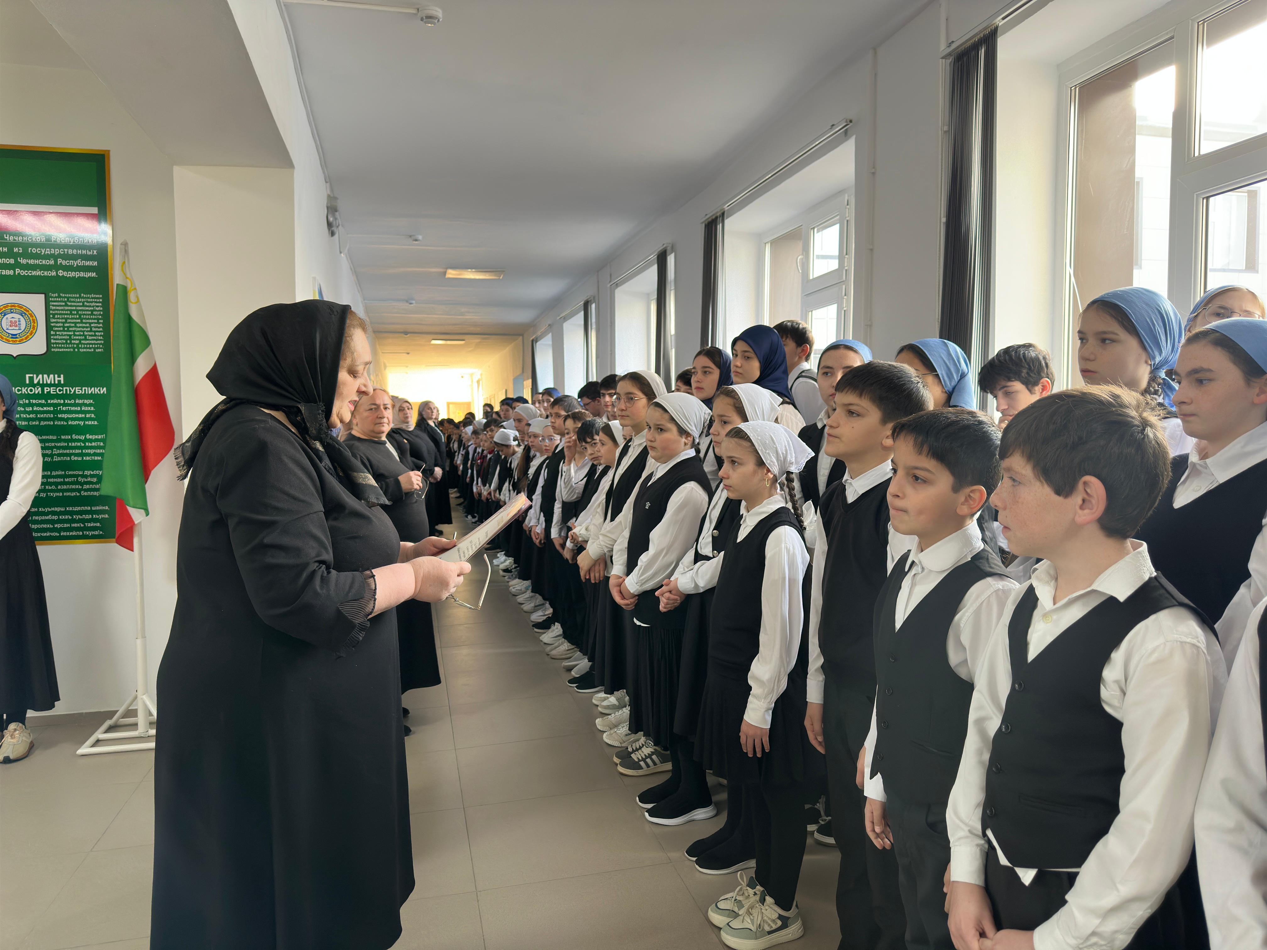 Линейка началась с торжественных церемоний исполнения государственных гимнов Российской Федерации и Чеченской Республики, а также поднятия флагов.