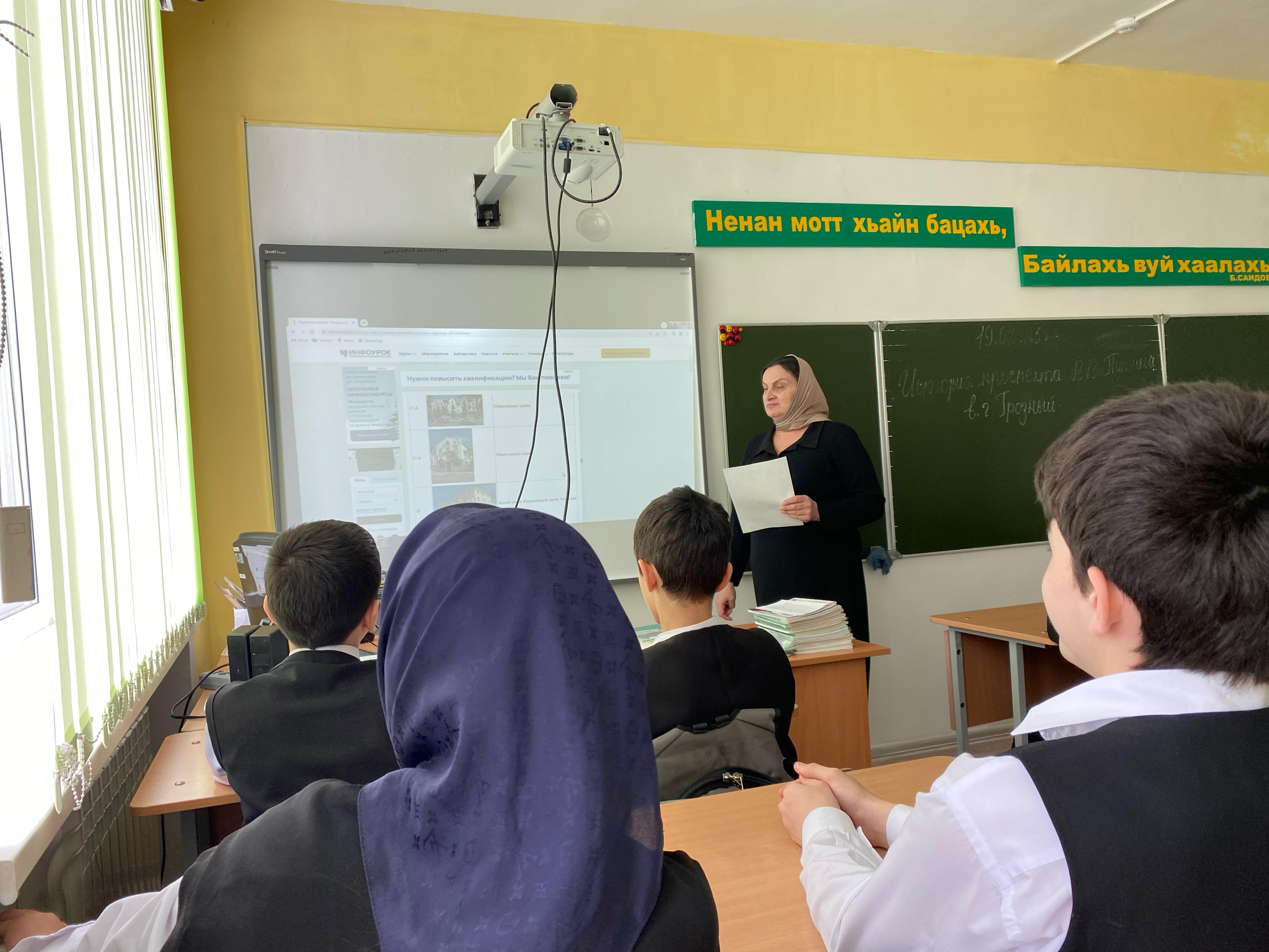 Классным руководителем 8 Б класса, Гатаевой Т.Х., 19.02.2025 был проведён классный час, целью которого являлось ознакомление учащихся с историей города Грозный и освещение роли Президента Российской Федерации В.В. Путина в процессе восстановления и развития региона.