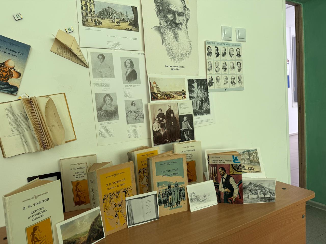 По плану была организована выставка, посвященная великому русскому классику Л.Н.Толстому.