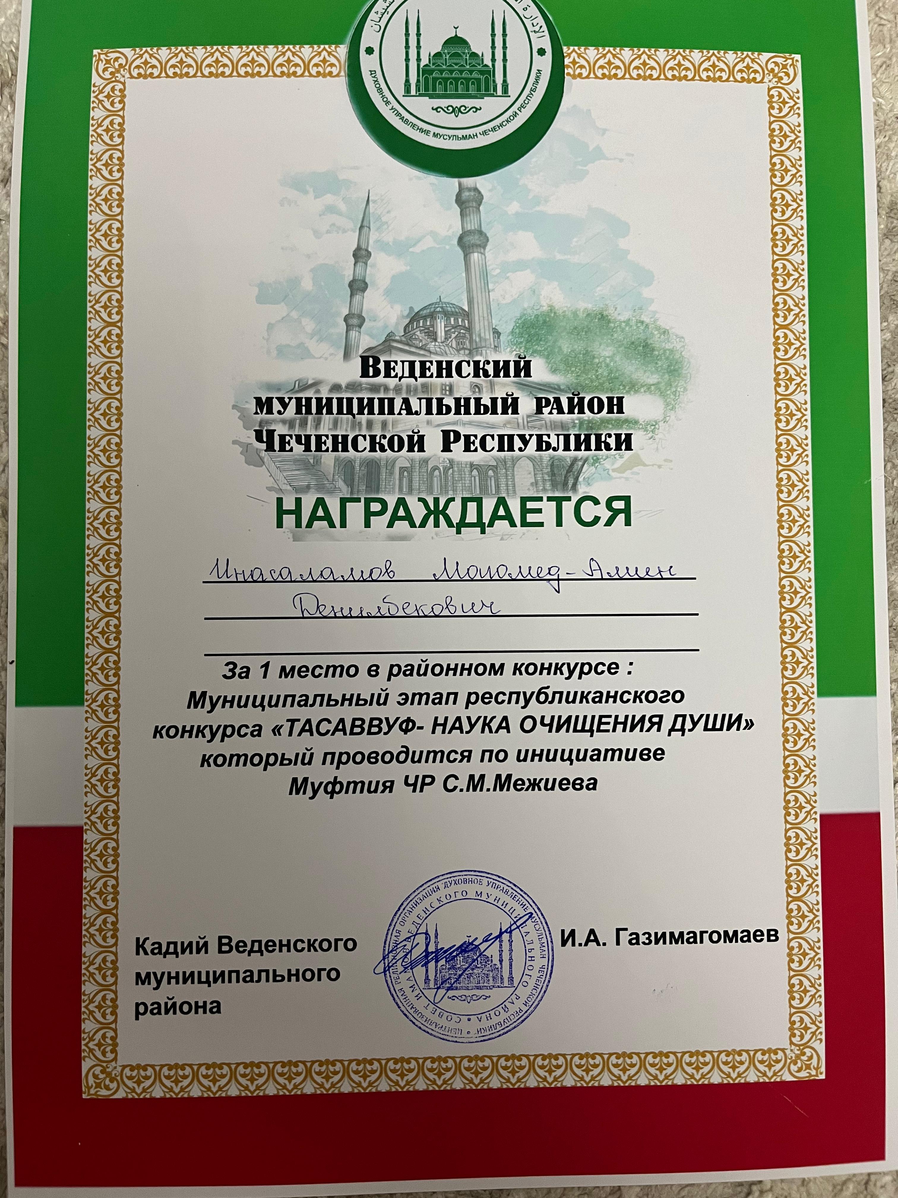 Ученик нашей школы 10 «А» класса Инасаламов Магомед-Эми принял участие и занял первое призовое место, где торжественно вручили дипломы Духовного управления мусульман Чеченской Республики и денежные премии от РОФ.