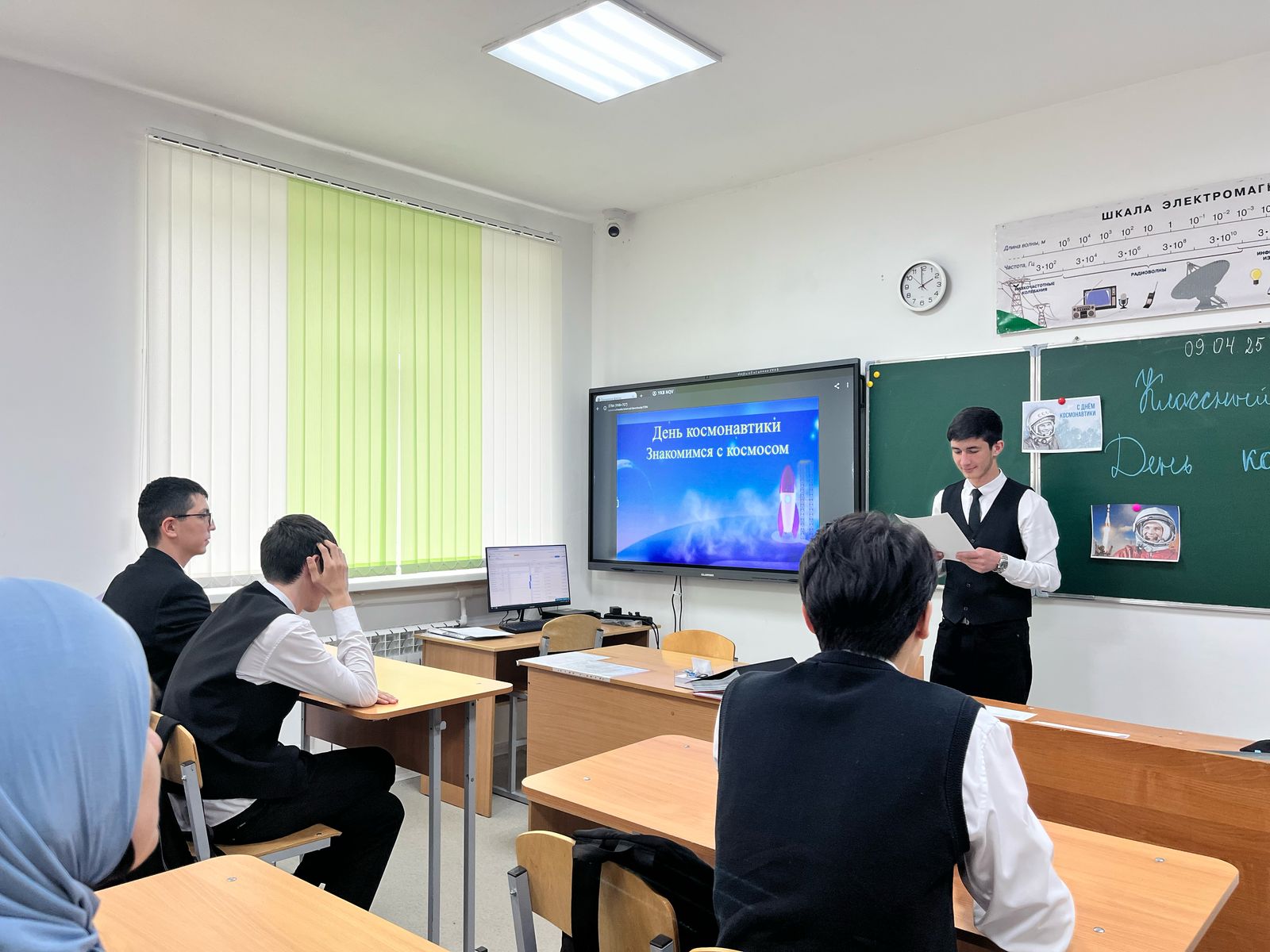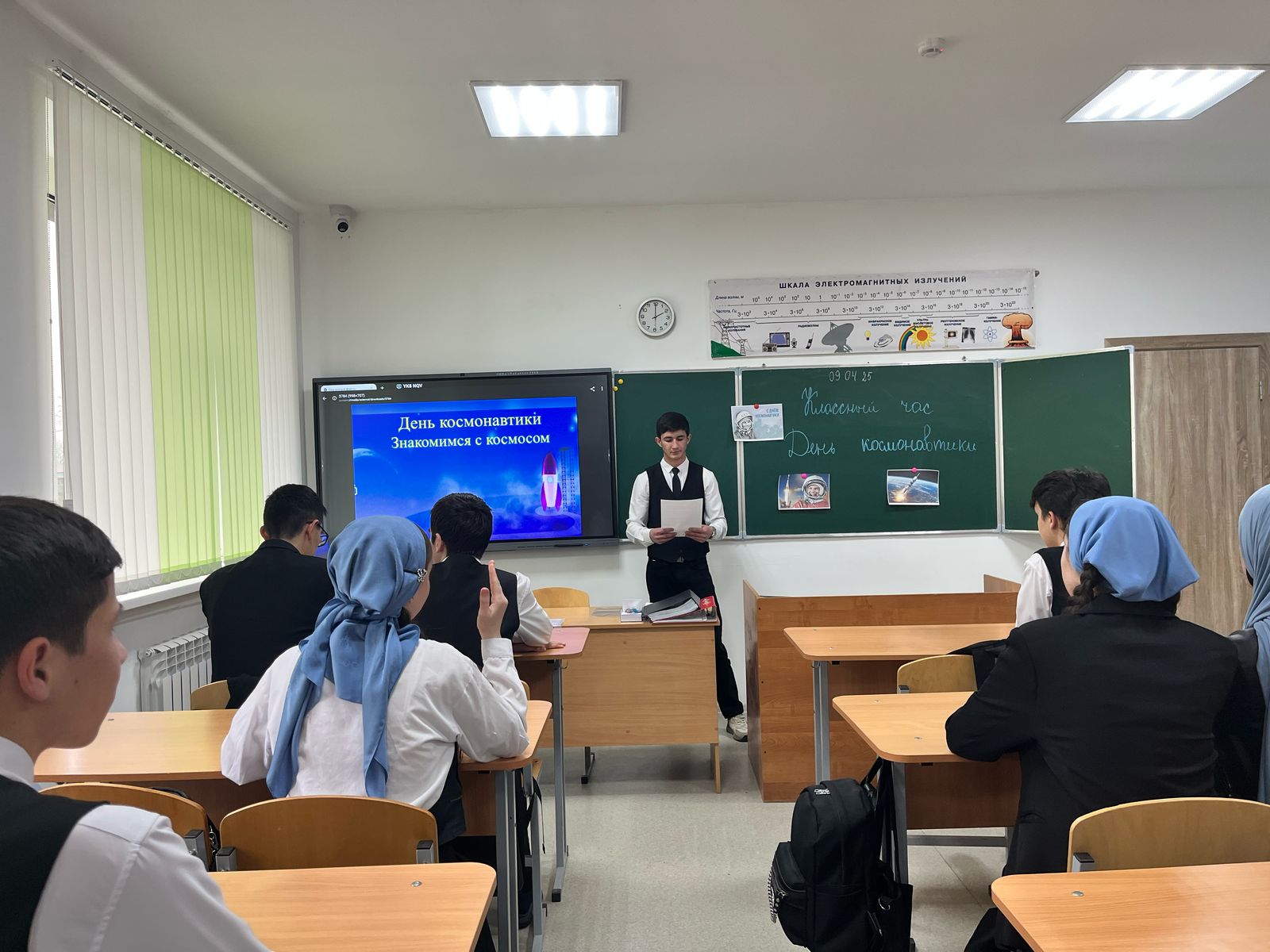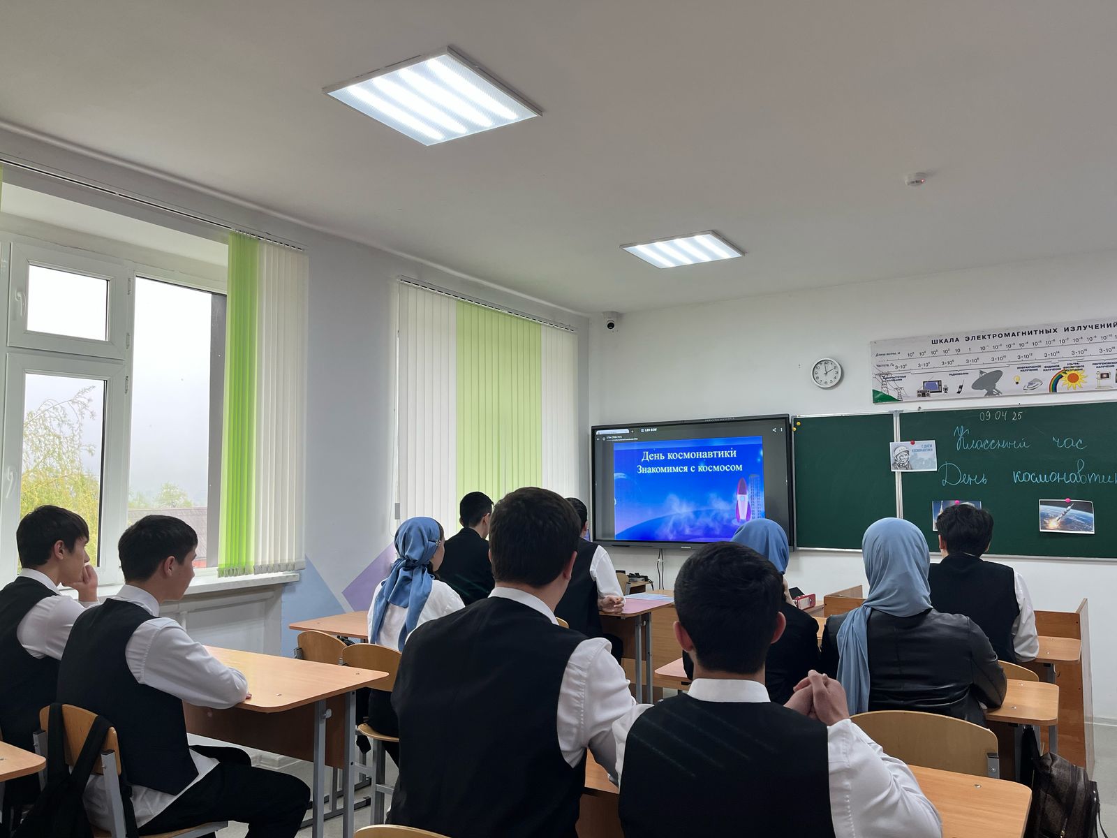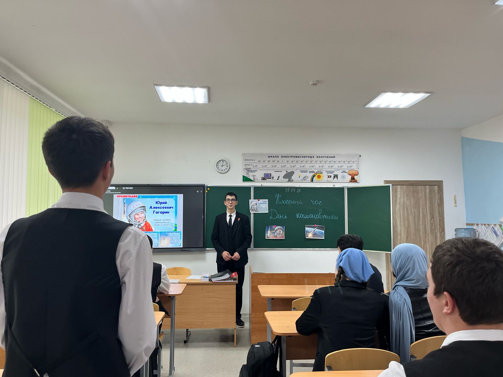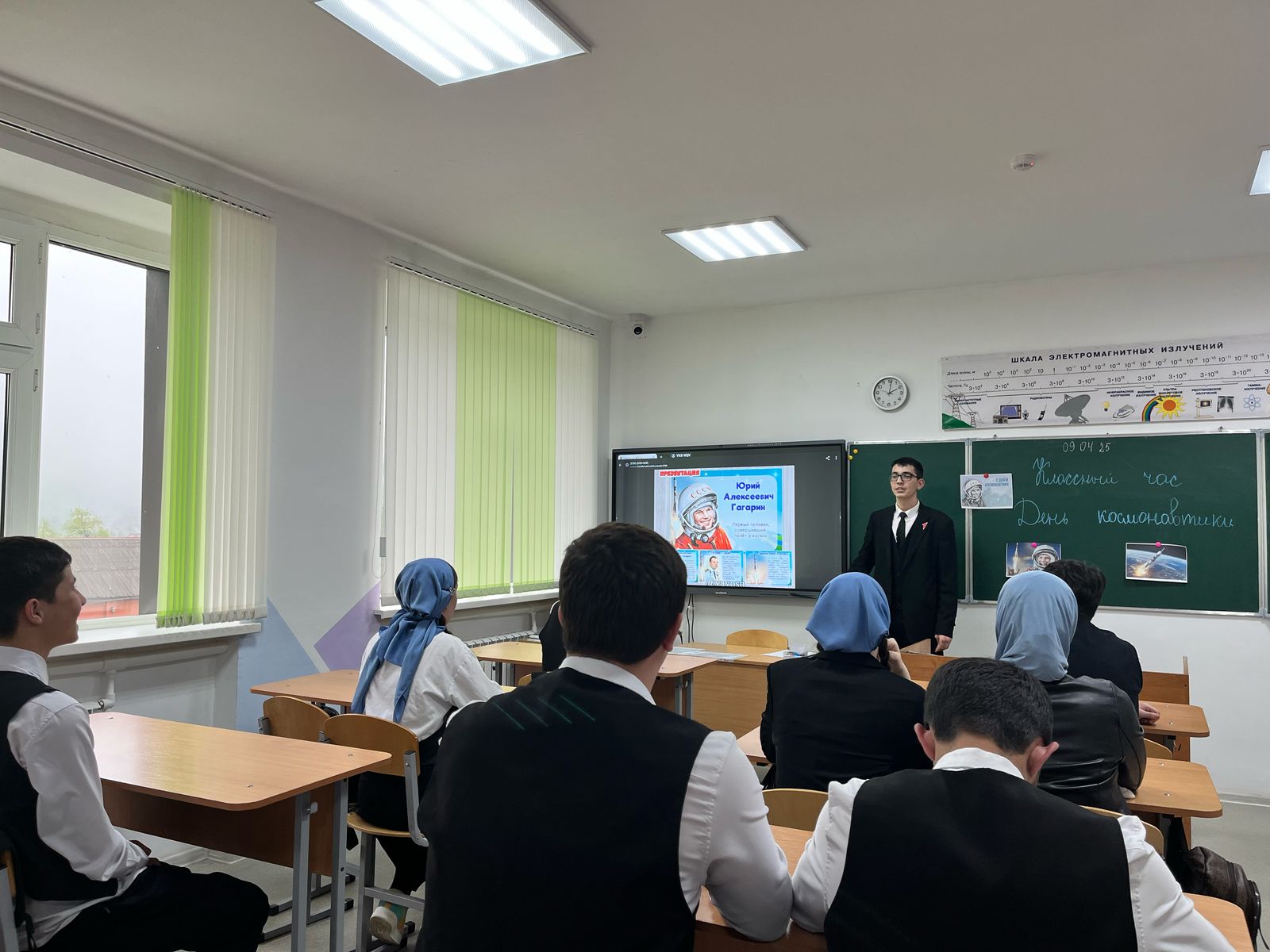09.04.2025г. классный руководитель Байсуркаева Лайла Аюбовна провела в 10 "Б" классе классный час на тему:«День космонавтики».