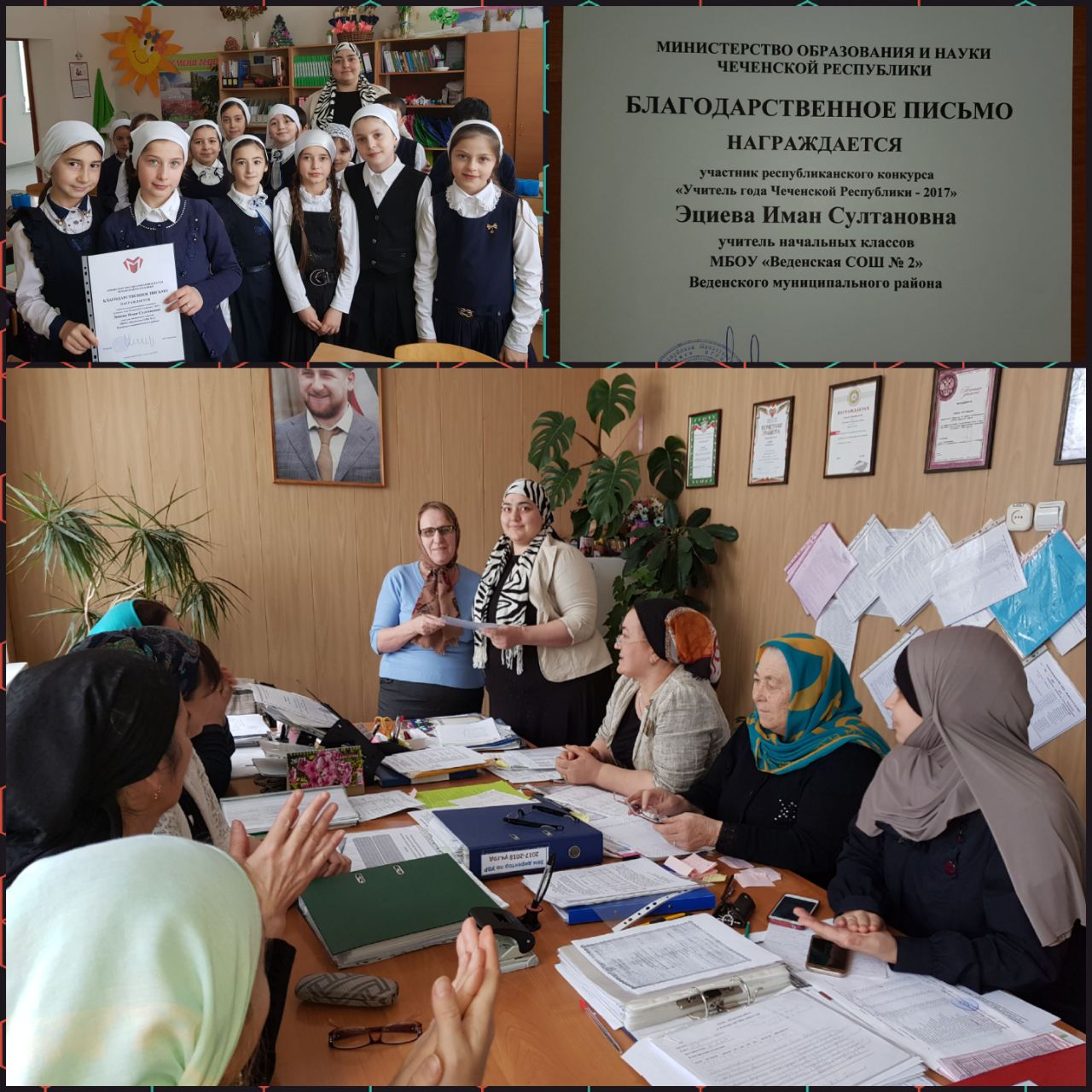 16.01.2018Эциева Иман Султановна учитель начальных классов "МБОУ "Веденская СОШ №2" была награждена Благодарственным письмом Министерства образования и науки Чеченской Республики за участие в республиканском конкурсе "Учитель года ЧР - 2017".