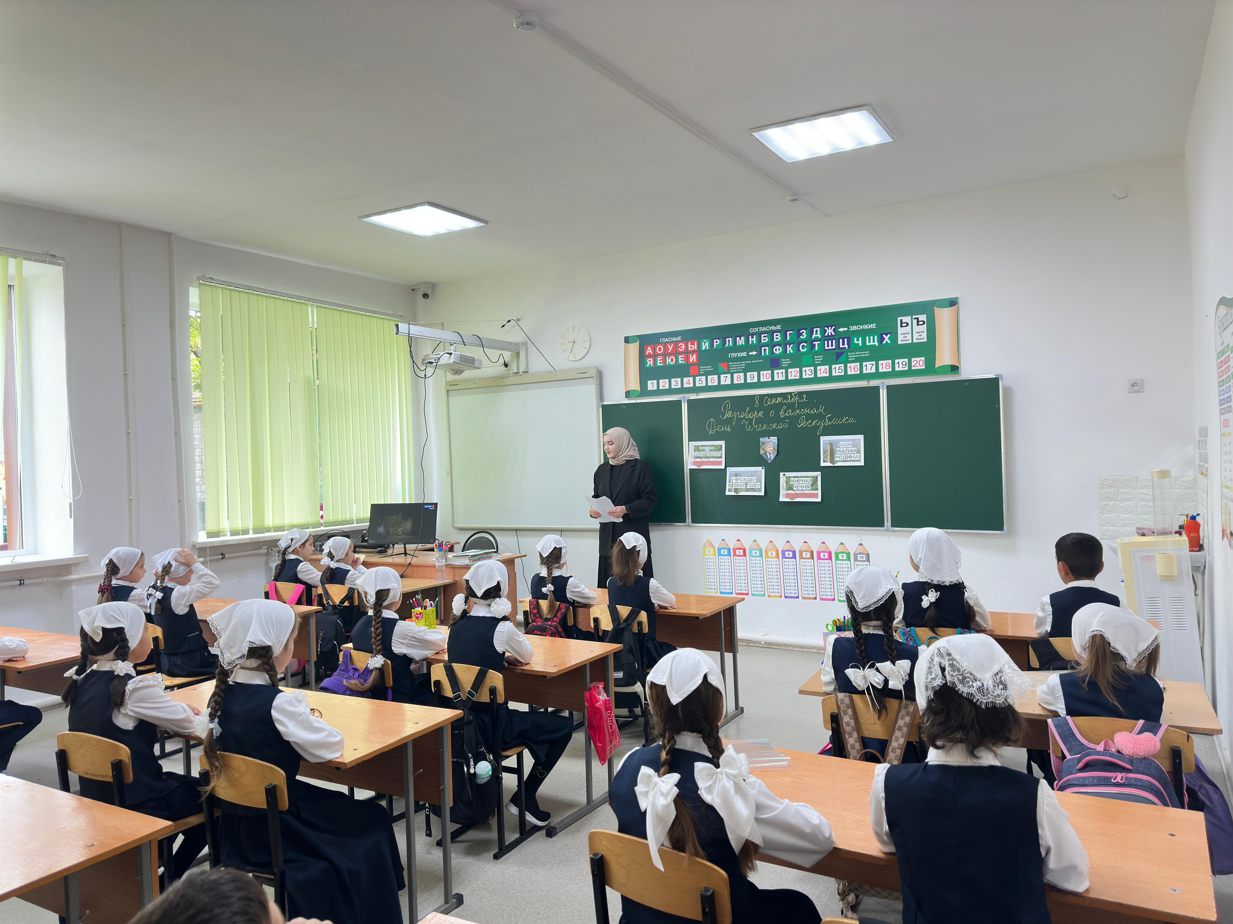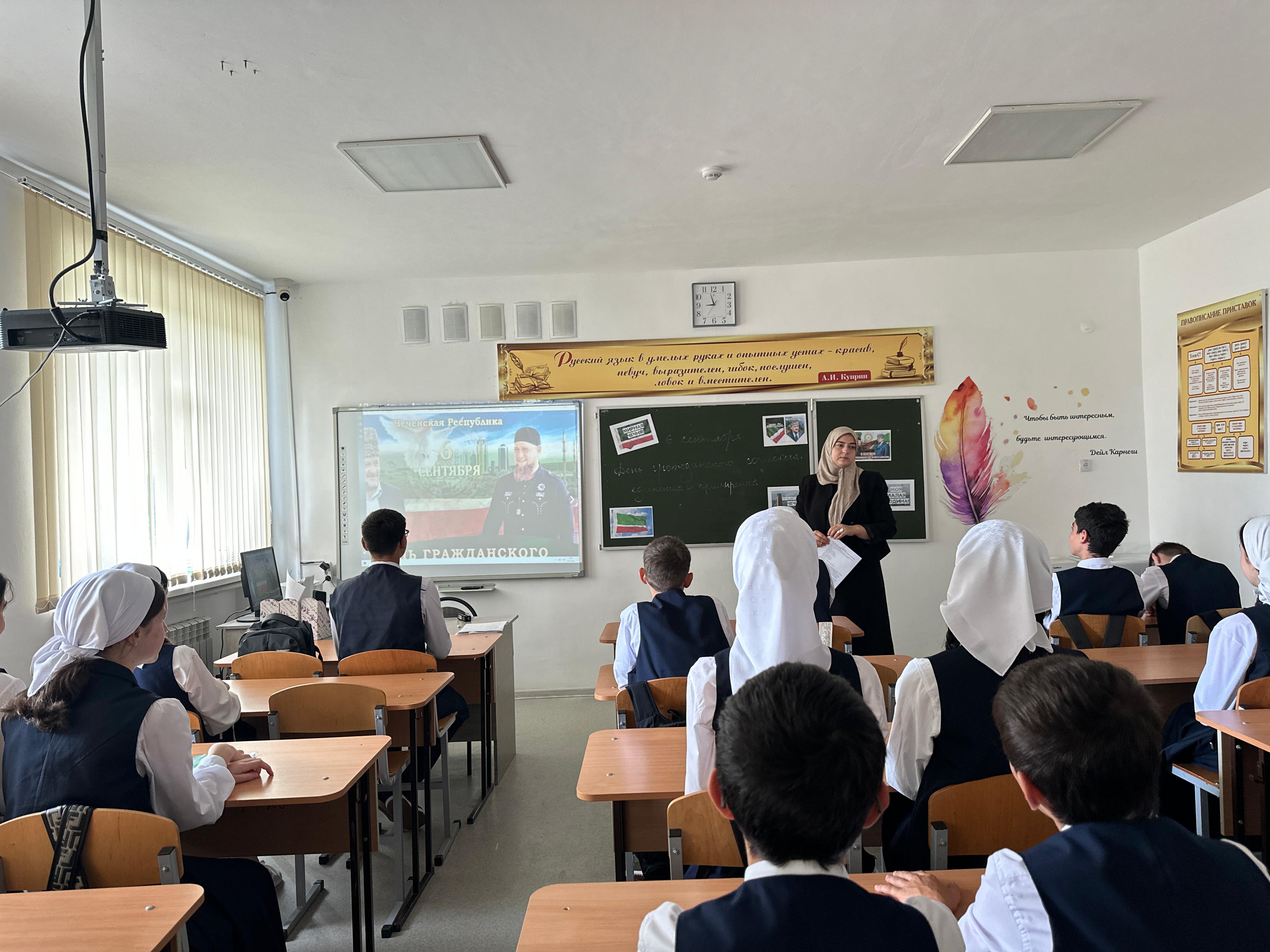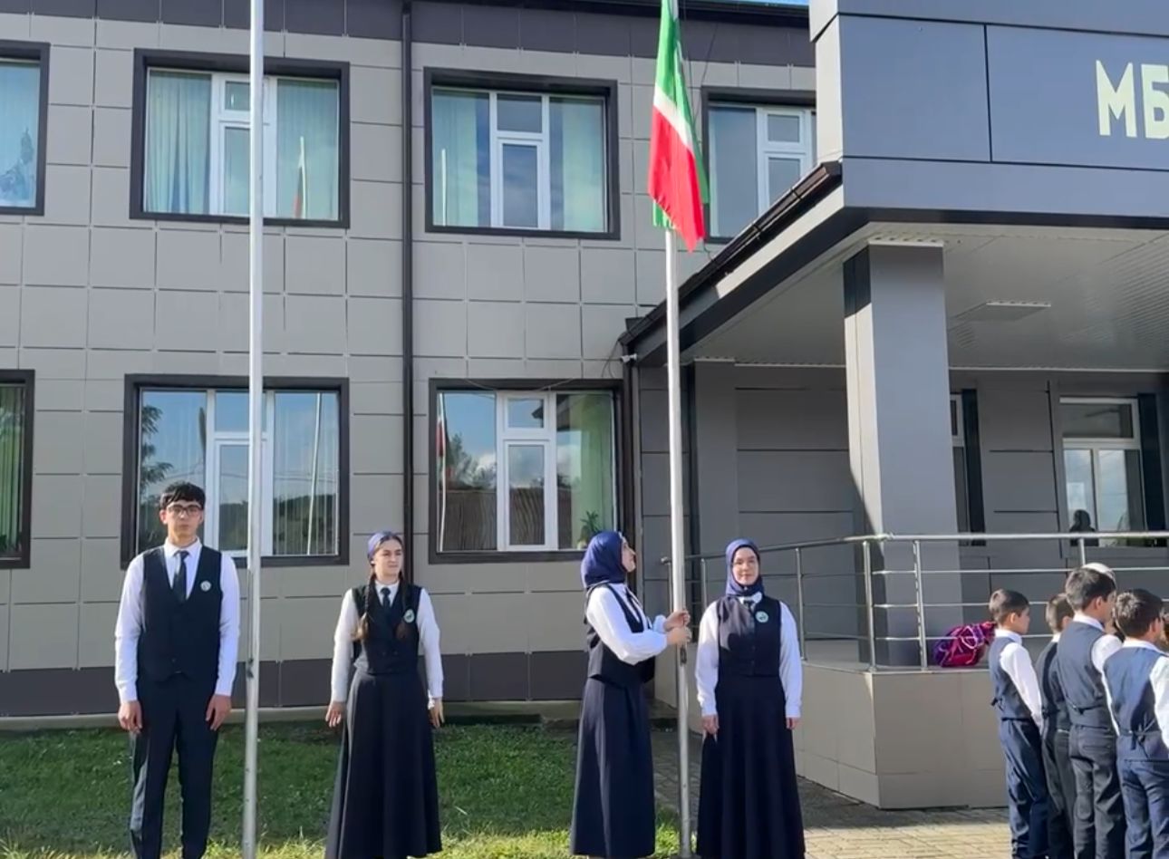 В начале мероприятия были подняты Флаг Российской Федерации и Флаг Чеченской Республики. Под звуки государственных гимнов обучающиеся и педагоги школы отдали дань уважения официальным символам нашей страны и региона.