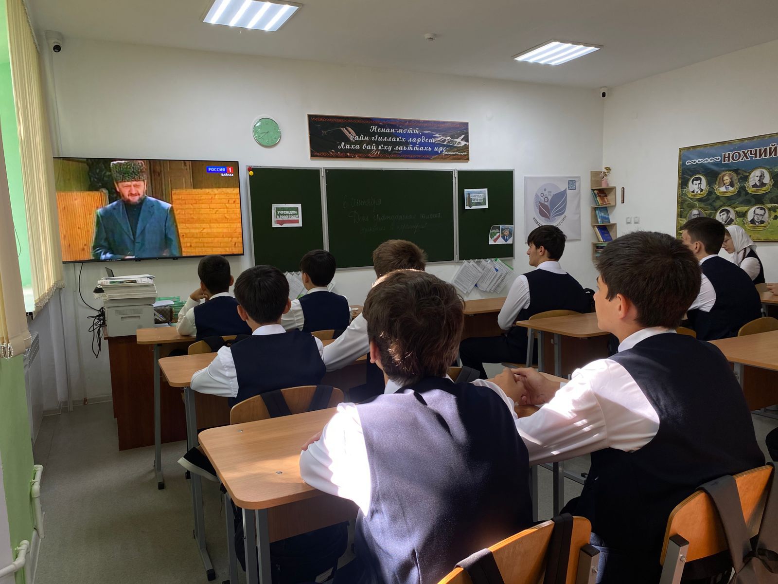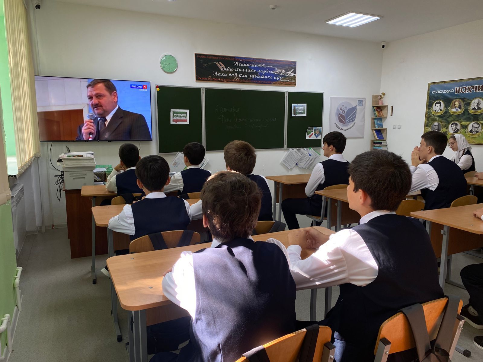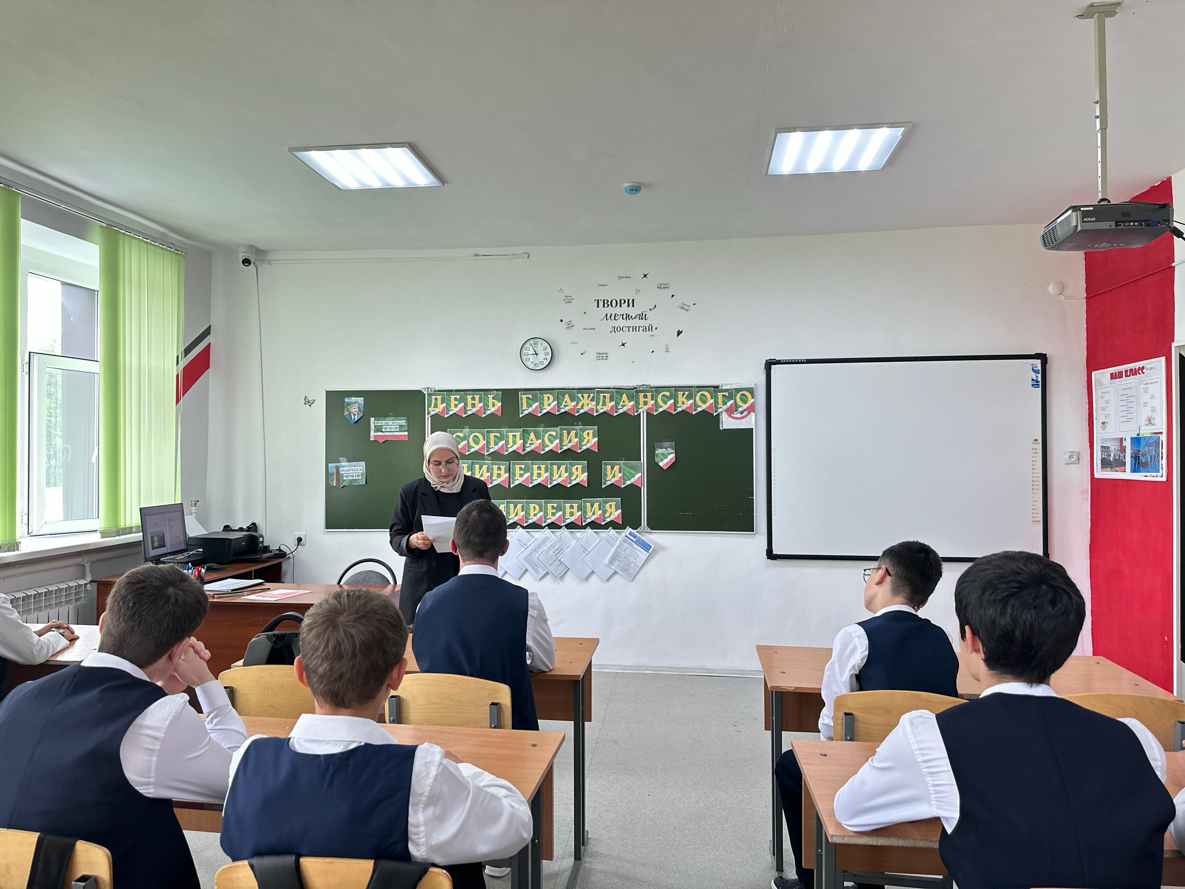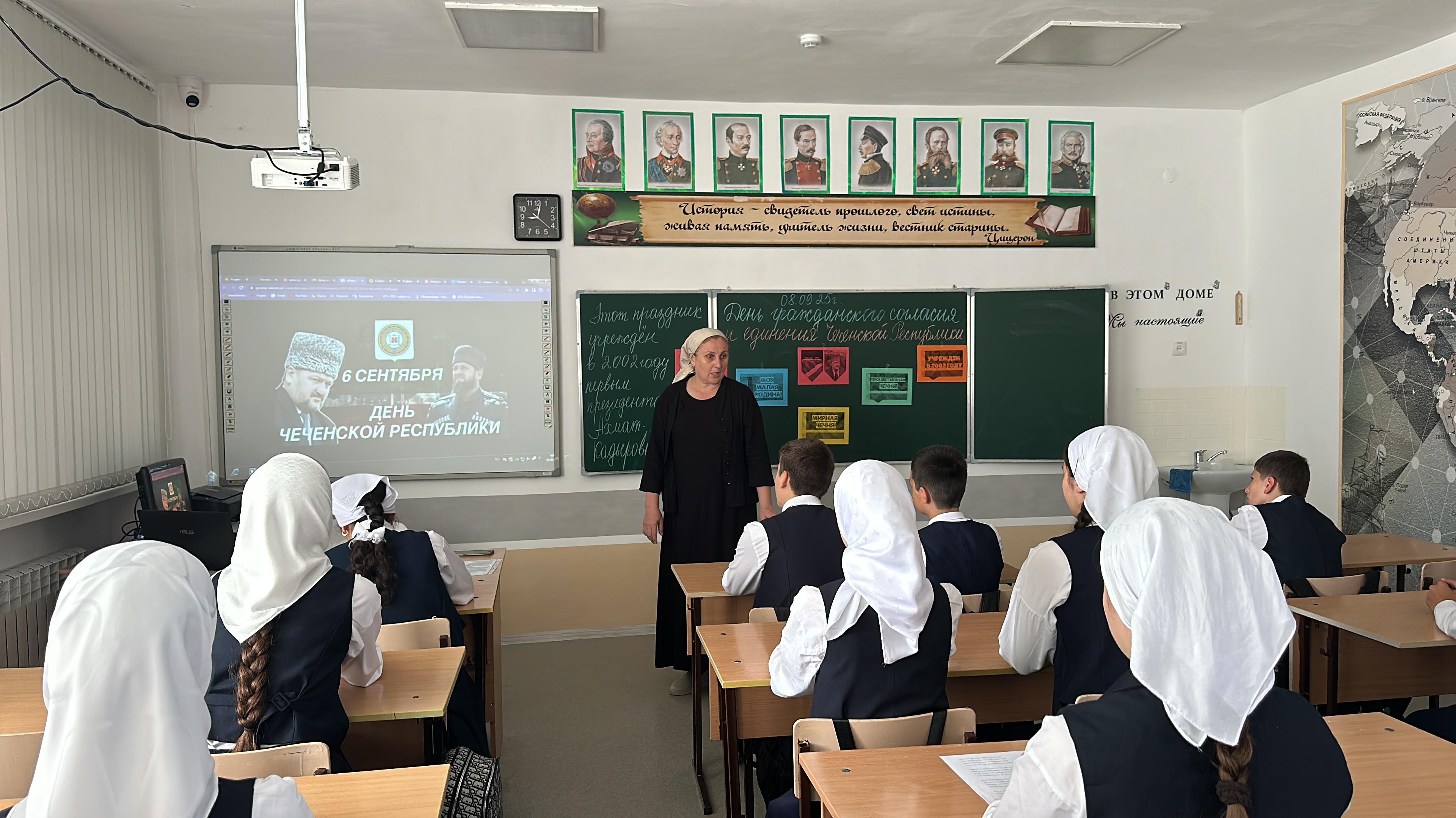 В начале мероприятия были подняты Флаг Российской Федерации и Флаг Чеченской Республики. Под звуки государственных гимнов обучающиеся и педагоги школы отдали дань уважения официальным символам нашей страны и региона.