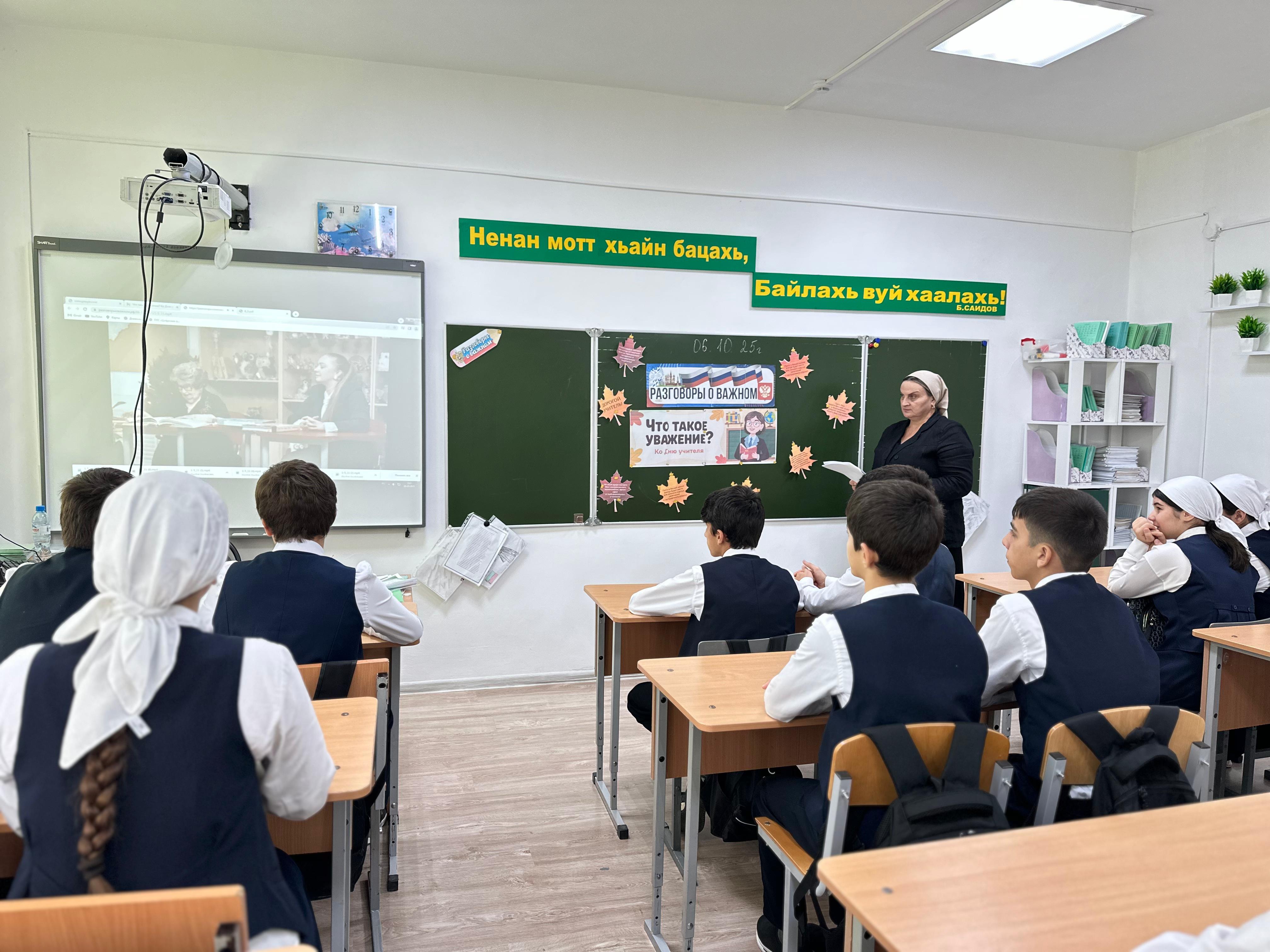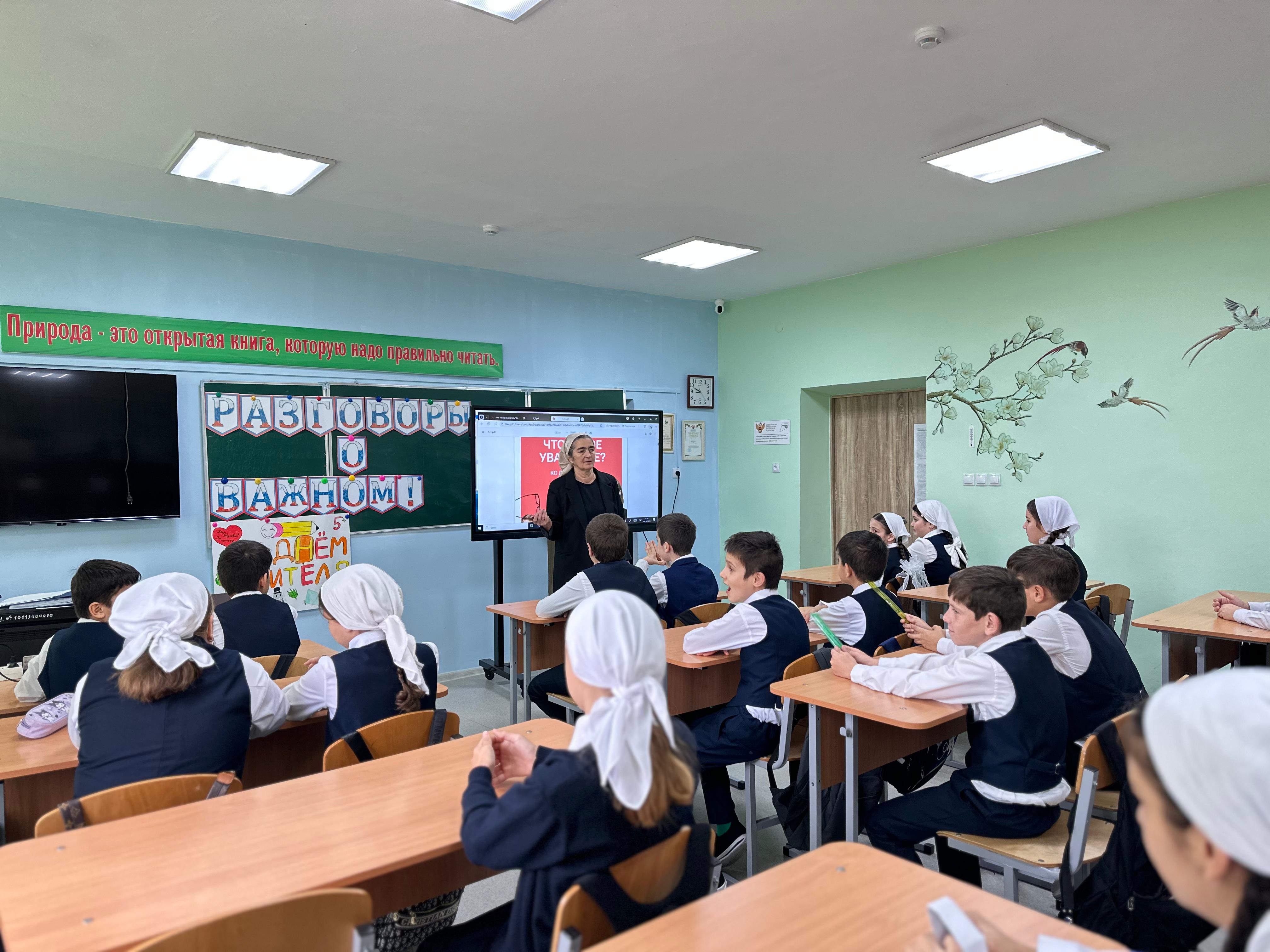 Сразу после линейки, все классы с 1 по 11 отправились на внеурочное занятие "Разговоры о важном". Тема урока была выбрана не случайно и прозвучала особенно актуально в преддверии Дня учителя: "Что такое уважение?".