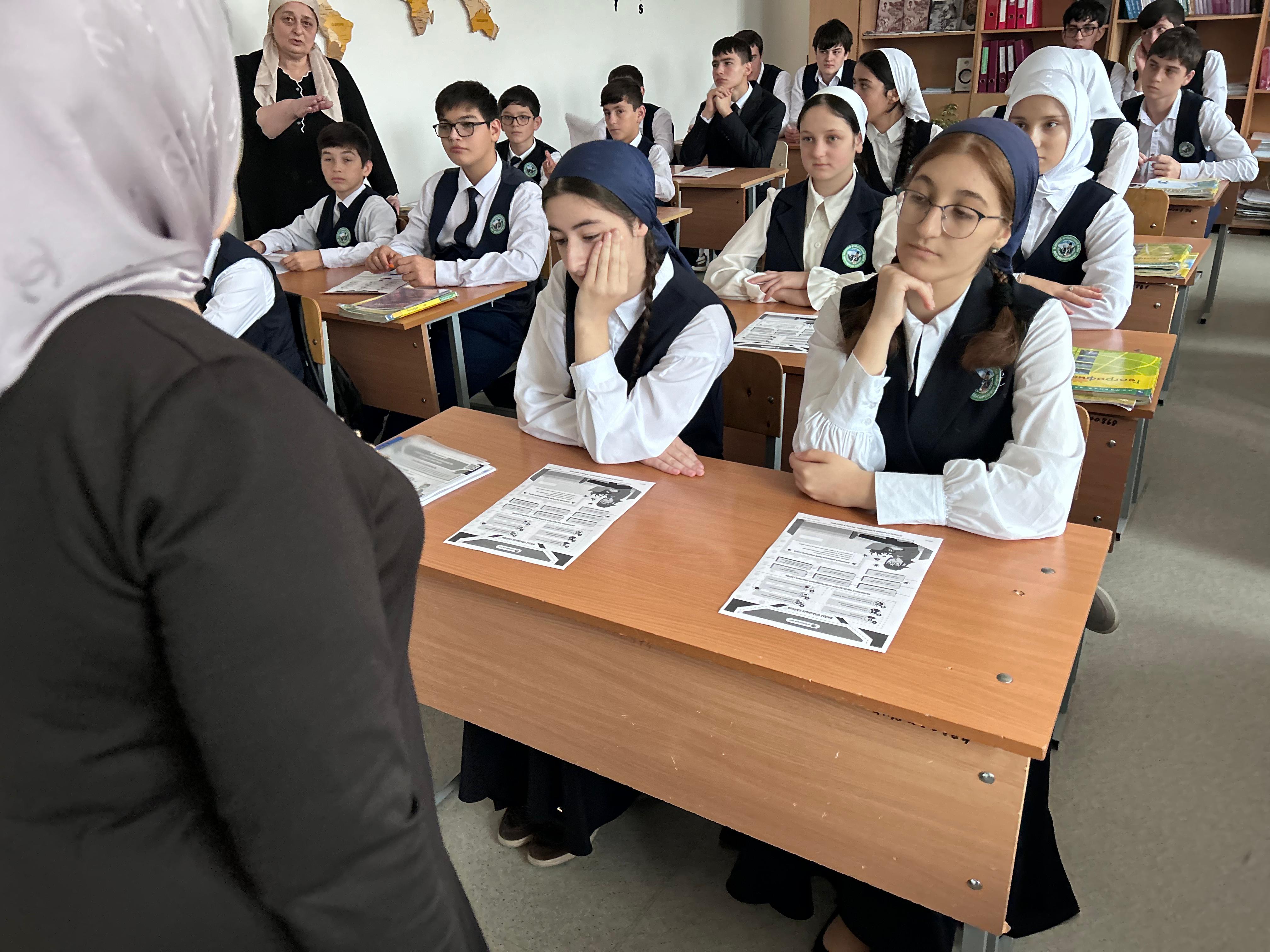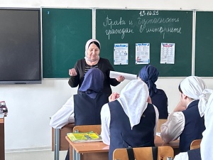Мероприятие для обучающихся 8-11 классов провела представитель Уполномоченного по правам человека в Чеченской Республике по Веденскому району Хадашева Зара Дашалиевна. Тема урока была особенно актуальной в современном мире: «Права и безопасность в интернете».