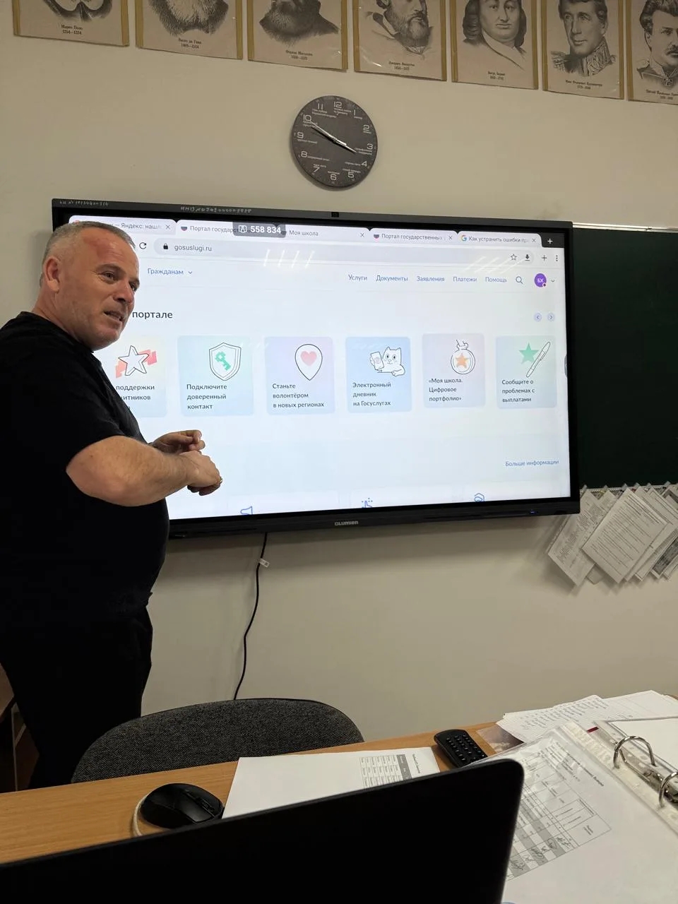 Цифровая образовательная среда: Заместитель директора по информационно-коммуникационным технологиям Арсимиков Шайхи Абдулхамидович провел для родителей наглядный мастер-класс. Он продемонстрировал на интерактивной доске процедуру привязки учетной записи ребенка к школьным цифровым сервисам через портал «Госуслуги», а также объяснил возможности и важность ведения «Цифрового портфолио» учащегося.
