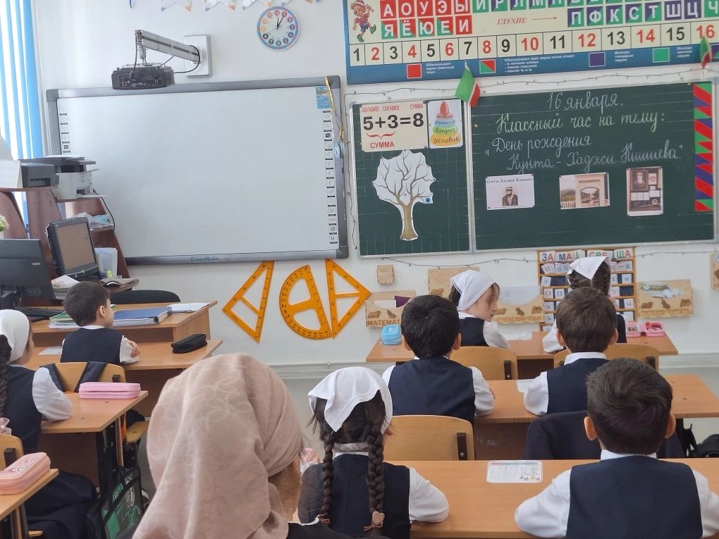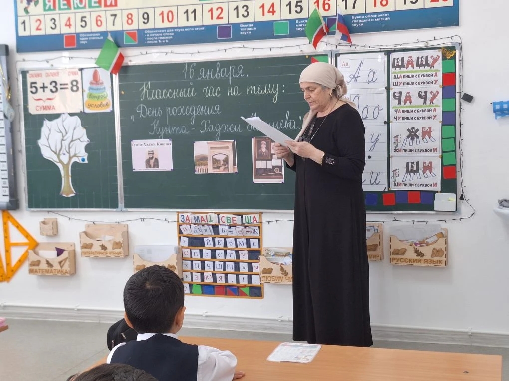 16 января 2026 года в 1 «А» классе классным руководителем Исраиловой И. С. был проведен открытый классный час, посвященный дню рождения выдающегося религиозного и общественного деятеля, проповедника мира и миротворчества Кунта-Хаджи Кишиева.