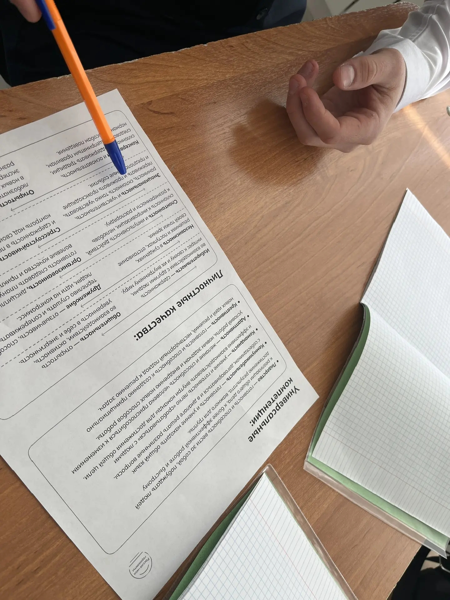 На занятии учащиеся ознакомились с раздаточным материалом «Что тебе помогает выбрать профессию», «Работа с сочетаниями качеств» и определили свои сильные стороны и качества, которые им стоит развивать.