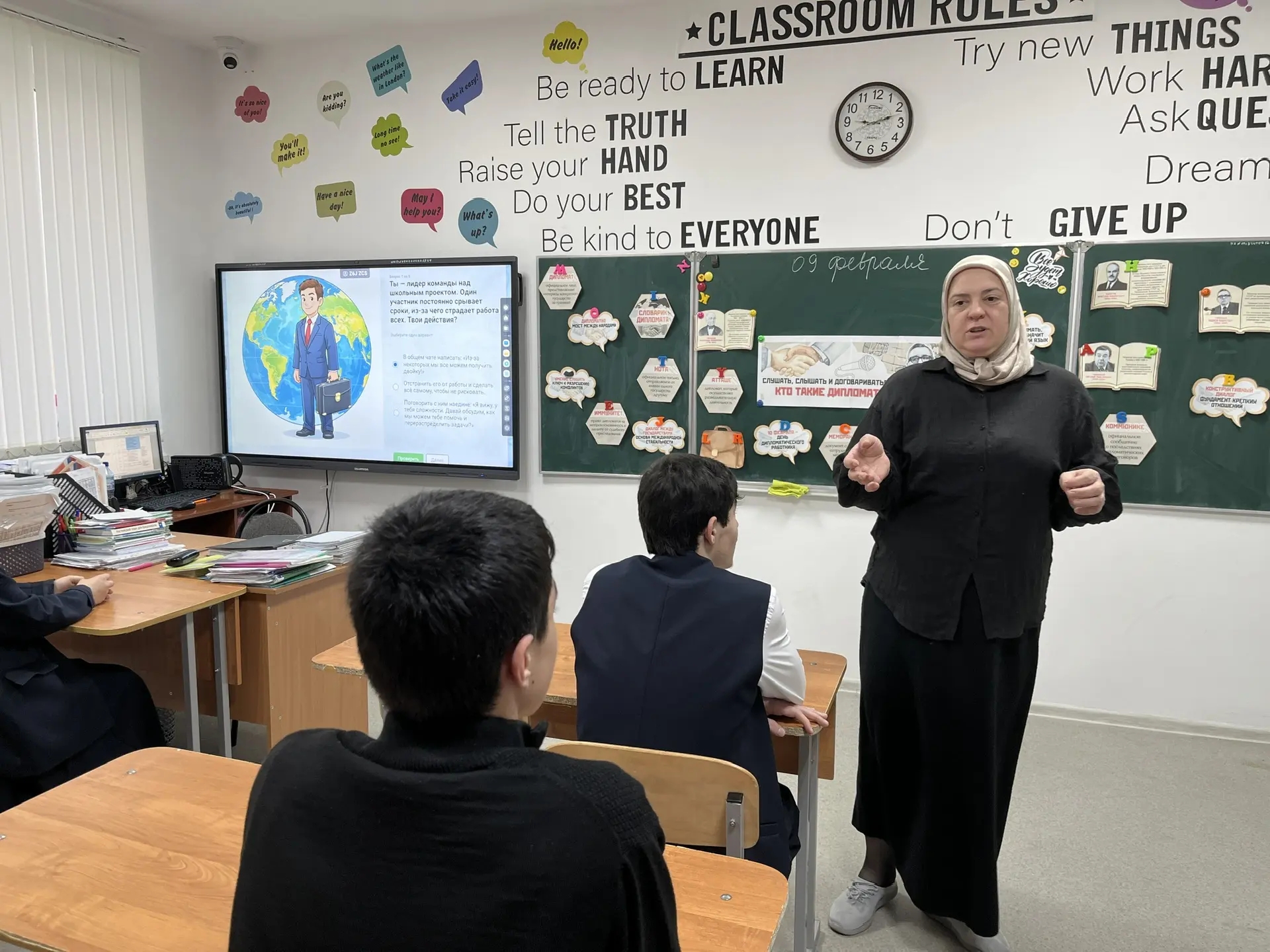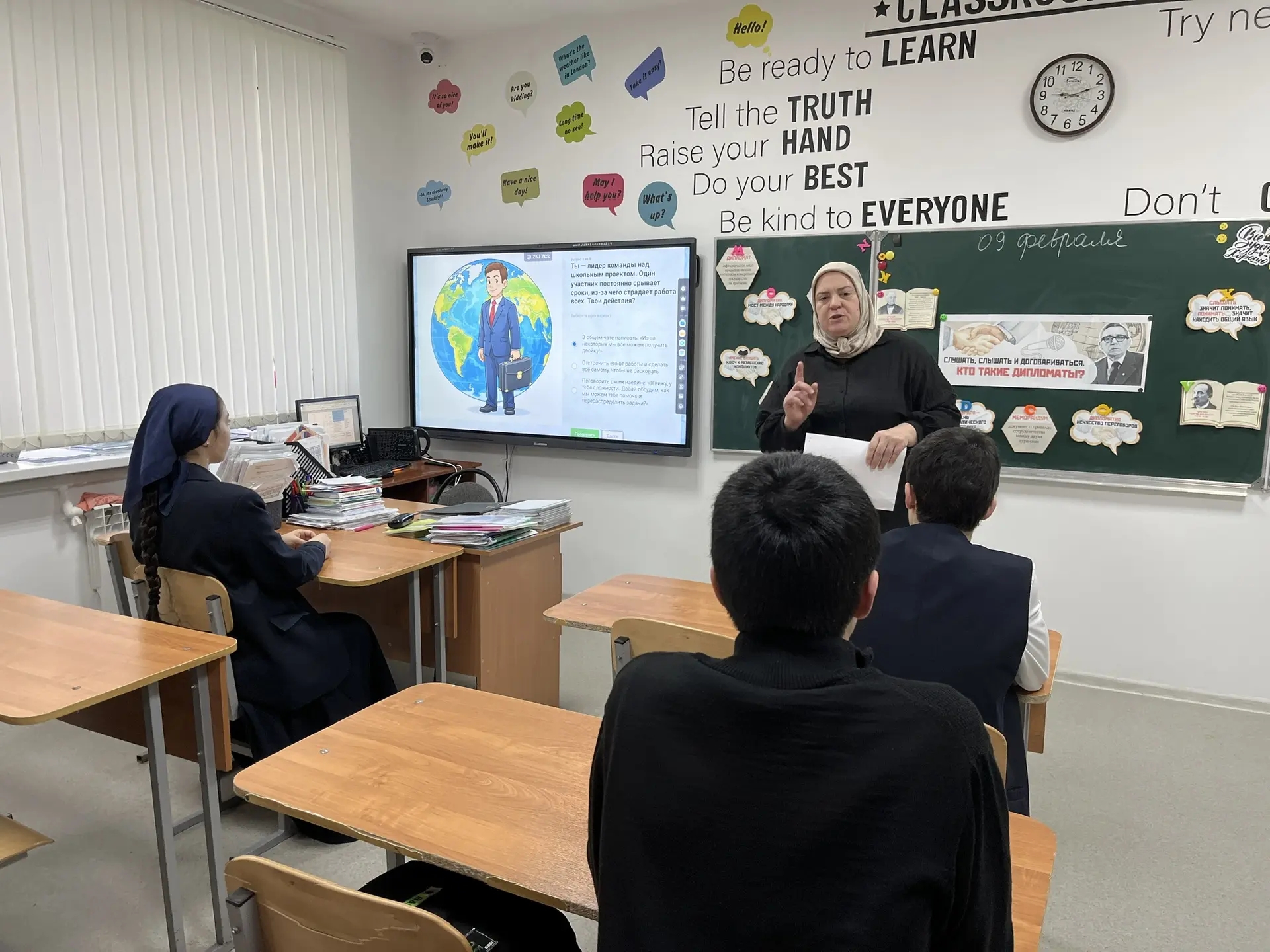 Сегодня, 9 февраля, в МБОУ «Веденская СОШ №2» прошло занятие в рамках федерального проекта «Разговоры о важном» на тему «Слушать, слышать и договариваться. Кто такие дипломаты?». Занятие было приурочено ко Дню дипломатического работника, который отмечается 10 февраля.