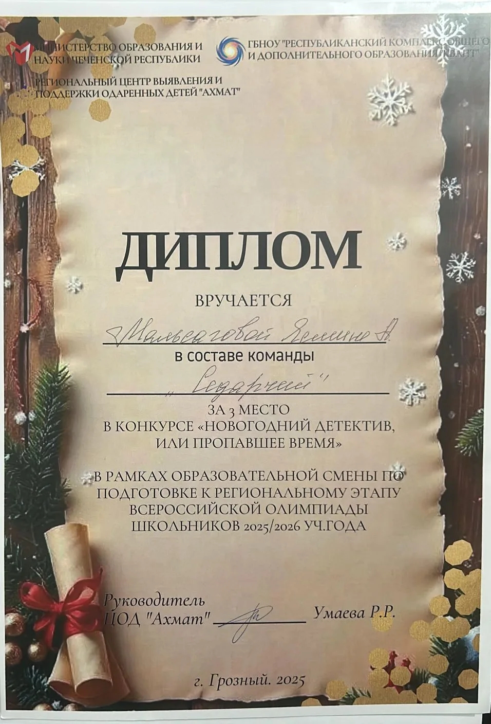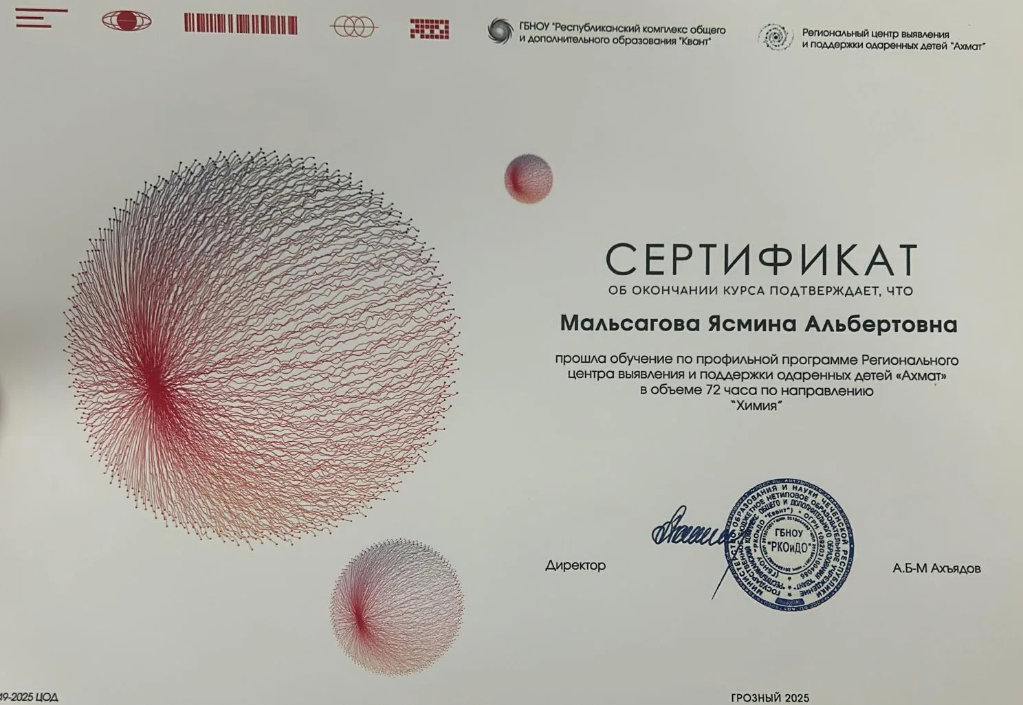 С 23 по 30 декабря 2025 года ученица 11 класса МБОУ «Веденская СОШ №2» Мальсагова Ясмина проходила обучение по профессиональной программе Регионального центра выявления и поддержки одаренных детей «Ахмат» по направлению «Химия».