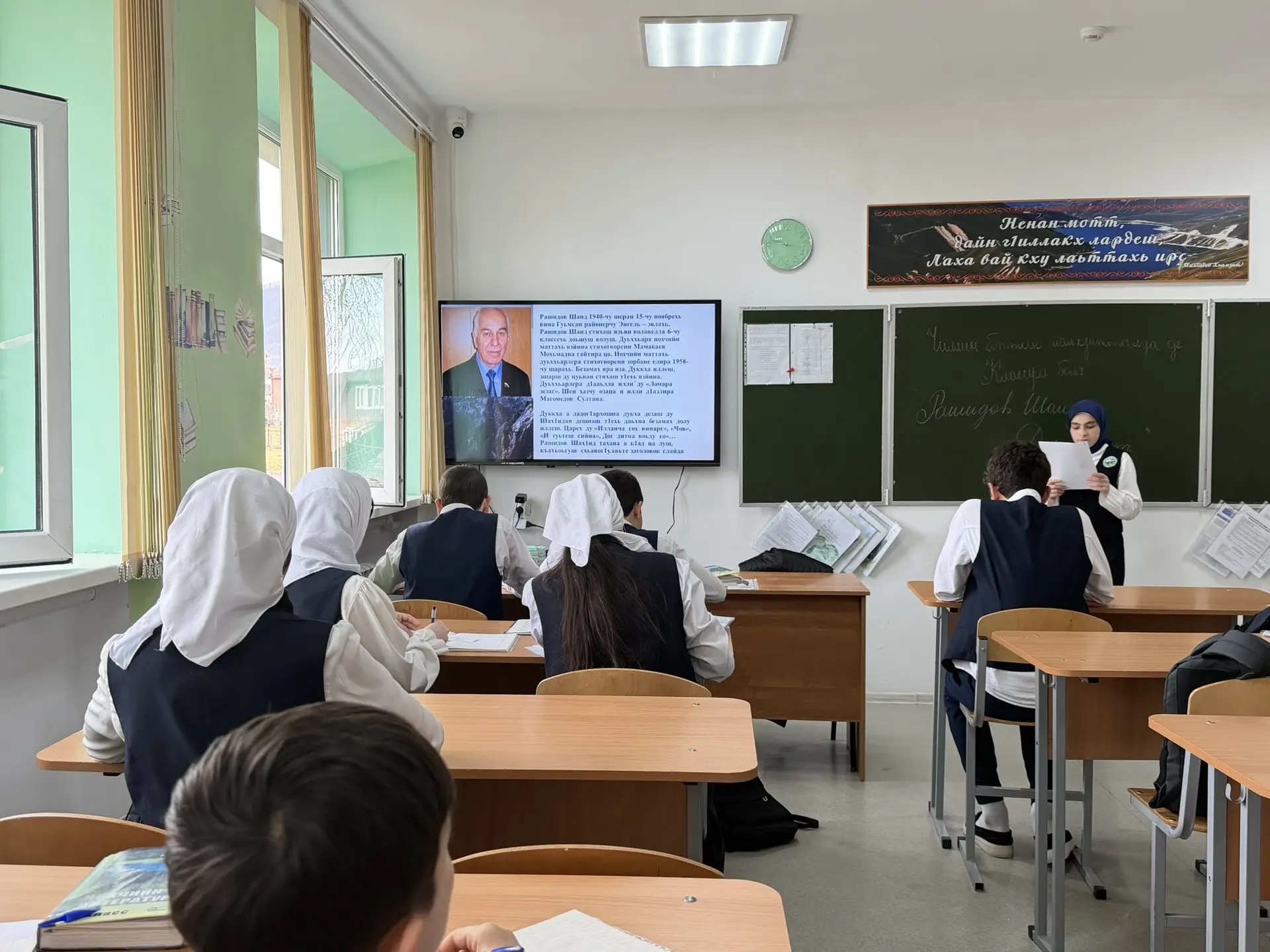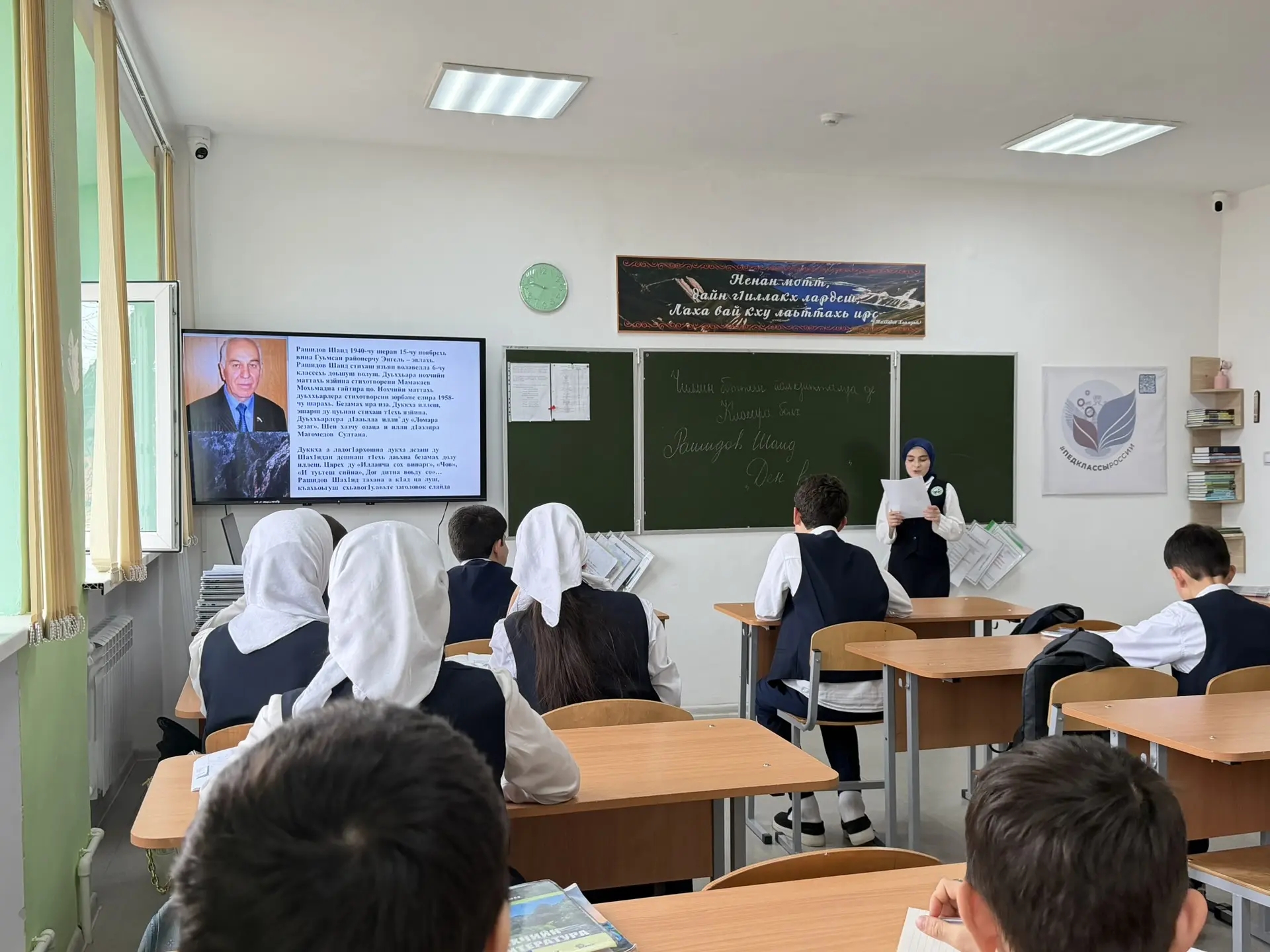 Темой урока была «Рашидов Шаид. Поэма «Ден весет». Ученики 7 класса с интересом слушали Гагаеву Мату, спикера нашего сегодняшнего урока. Мата подробно разобрала жизнь и творчество писателя, рассказала про его жизненные ценности, а также прочитала его немало известные стихотворения.