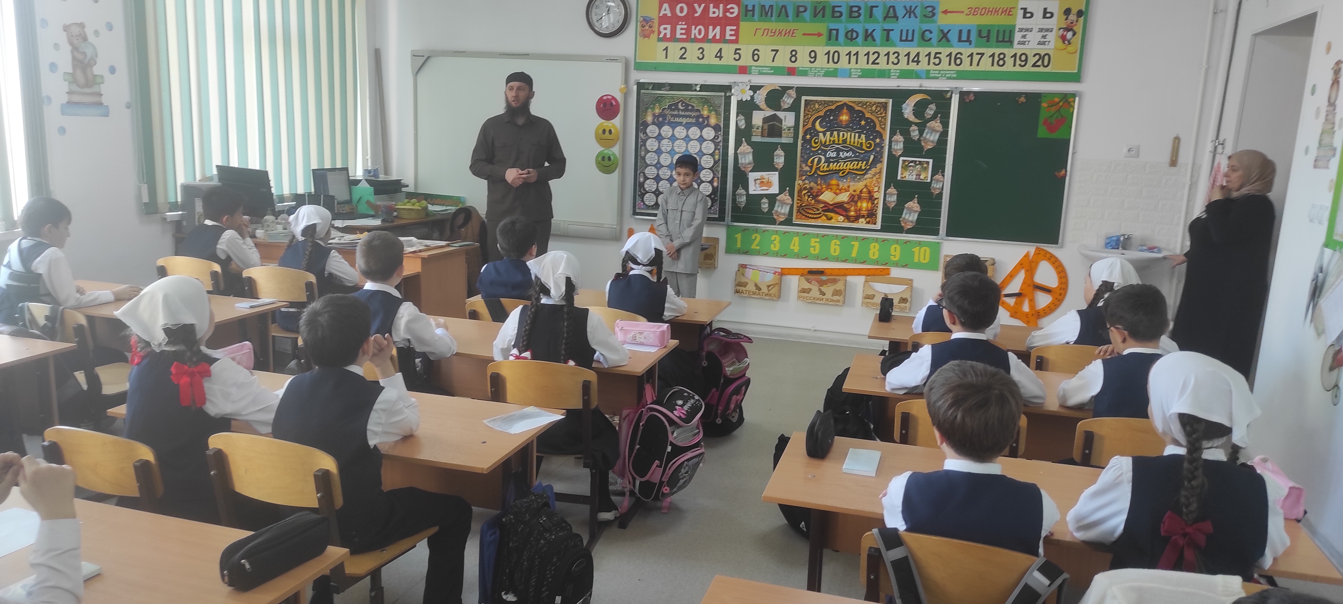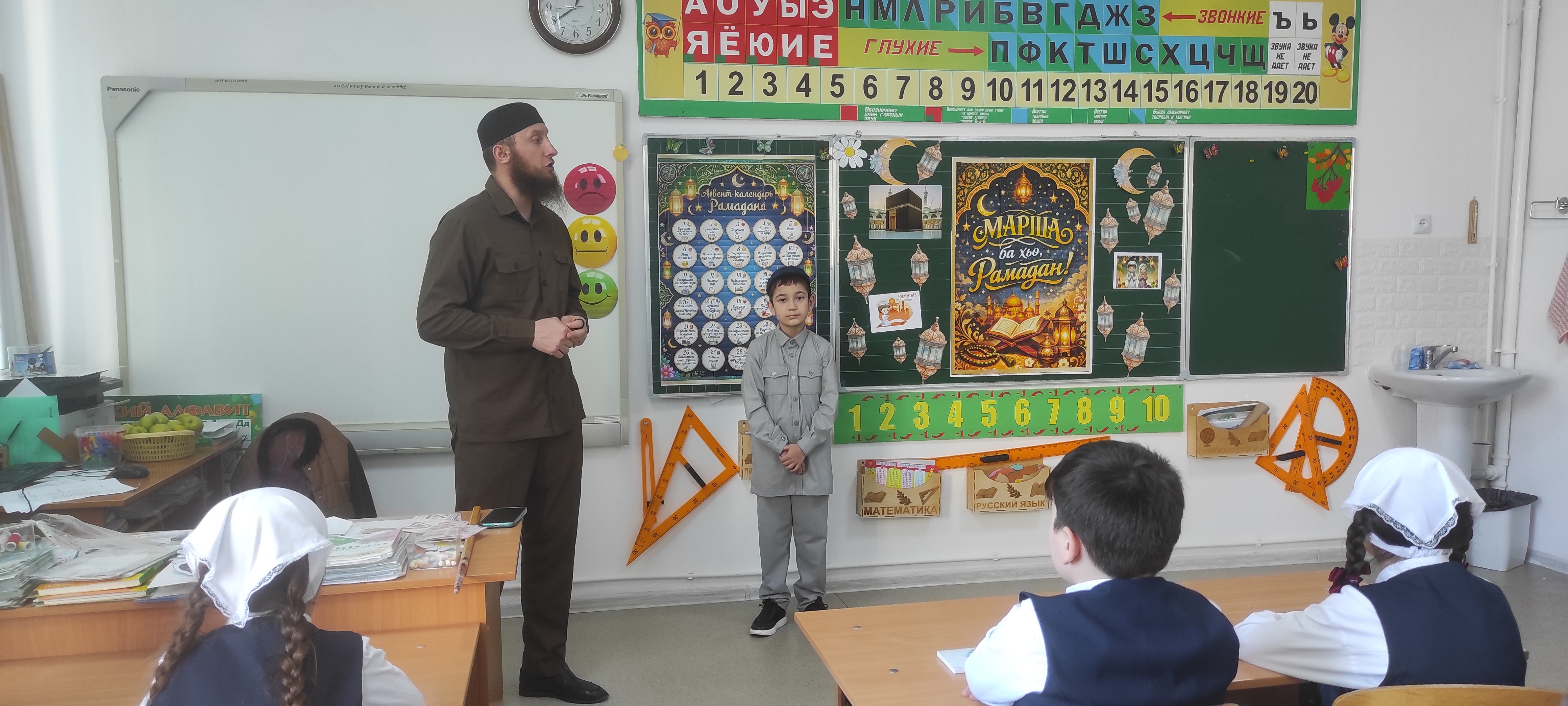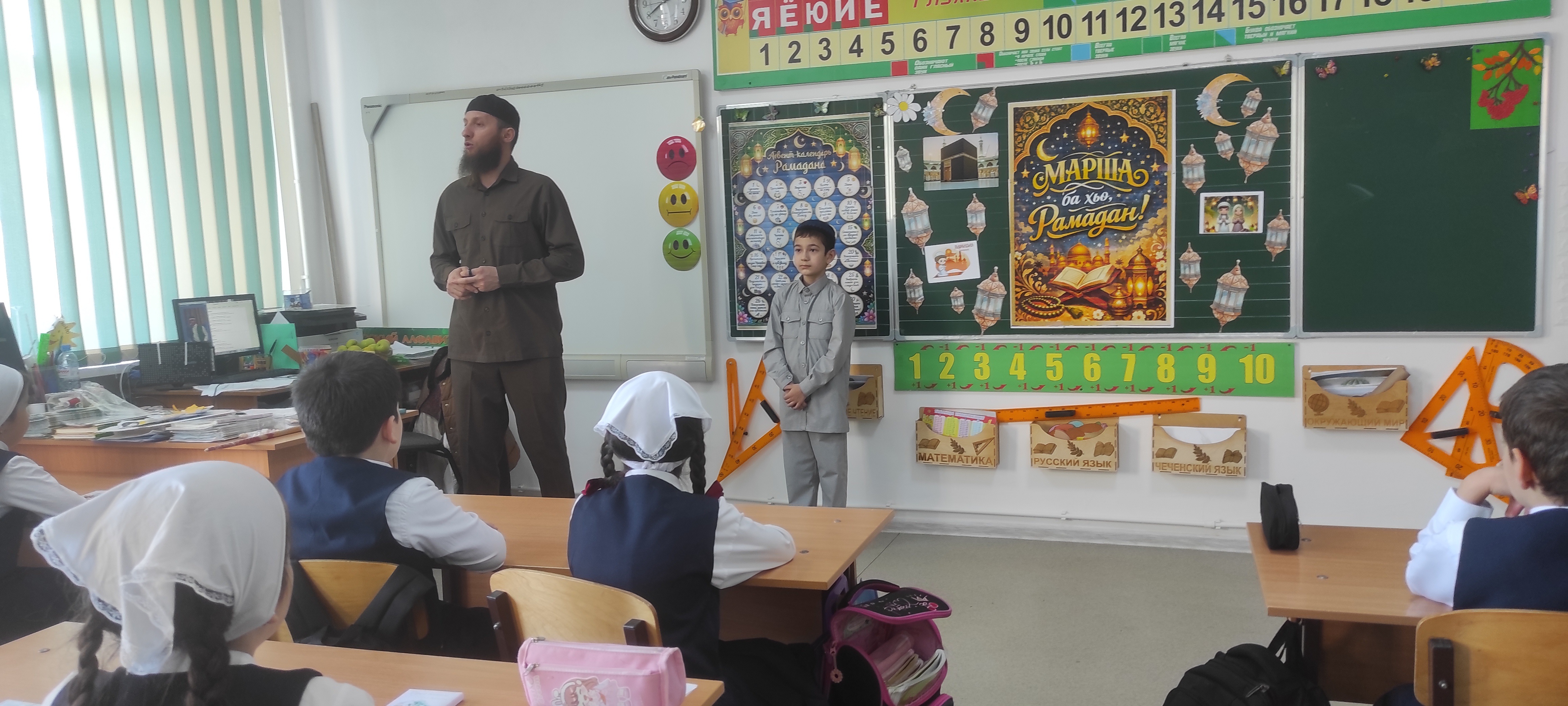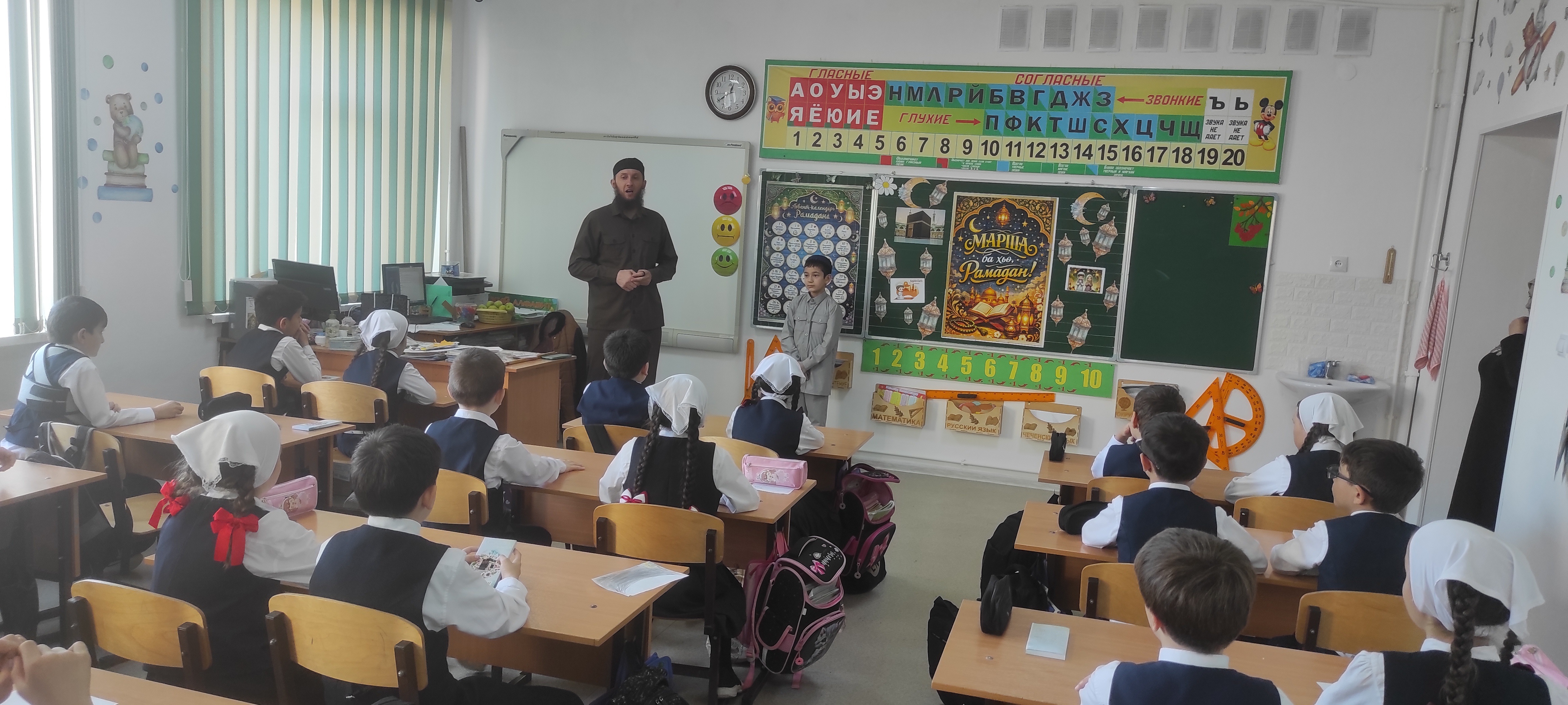 18.02.2026г. классный руководитель 3 "А" класса Гучигова Я.Т. провела мероприятие посвящённое ожиданию Священного месяца Рамадан. Педагог ДНВ Аюбов А. провел беседу с учащимися. Основной акцент мероприятий был сделан на расширении кругозора детей, знакомстве с культурными и духовными традициями, а также развитии уважения к религиозному наследию.
