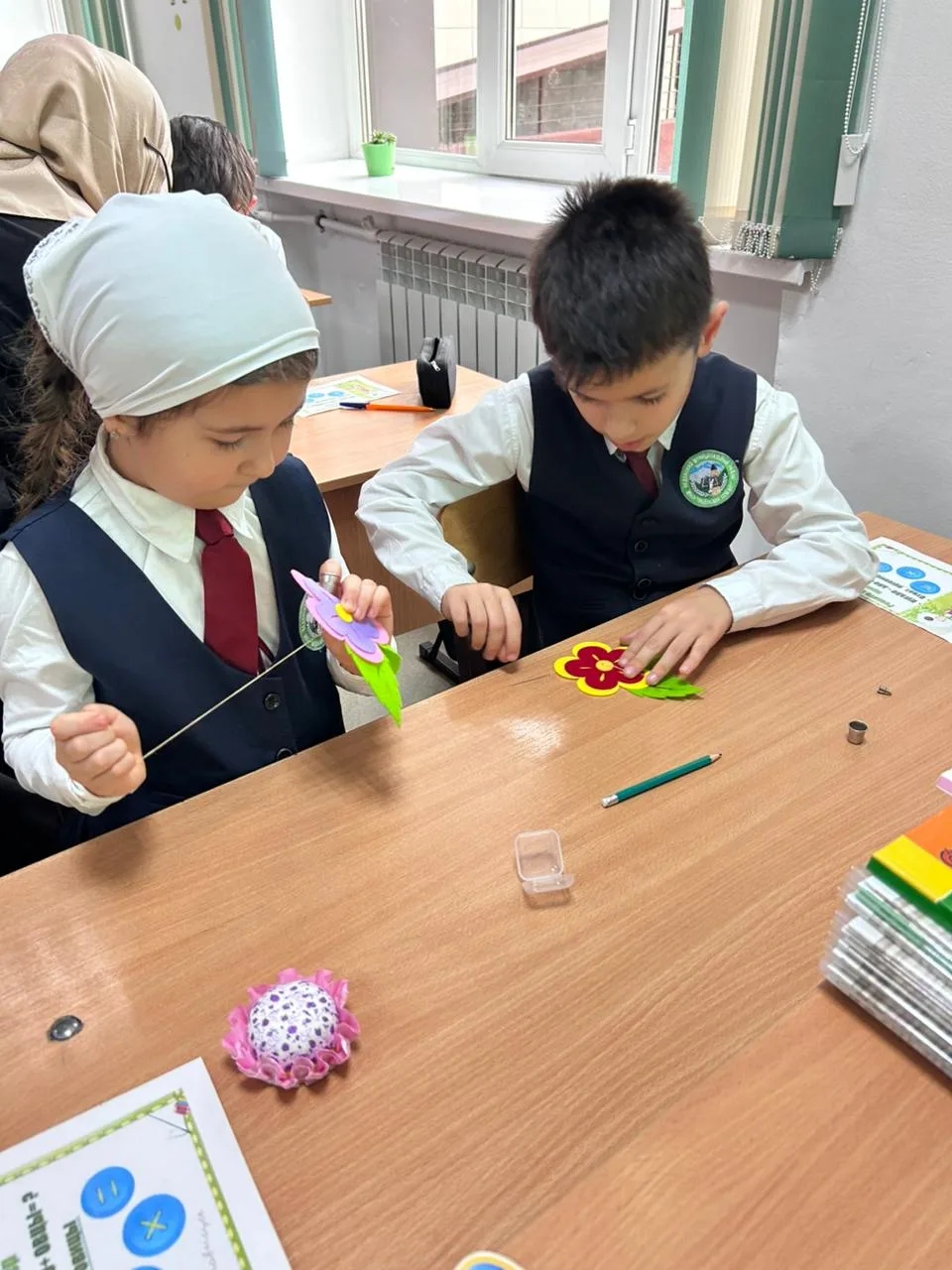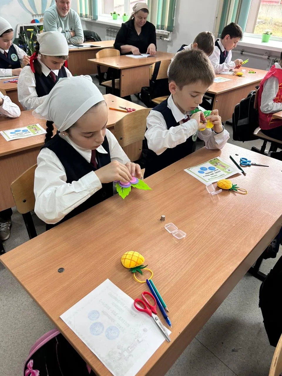 Особого внимания заслуживает организация рабочего пространства. На каждой парте заранее были подготовлены настоящие «шкатулки с сокровищами»: наборы пуговиц, нитки, иглы, а также лоскуты различной ткани (нетканое полотно и другие материалы), на которые ребята крепили свои изделия. Разнообразие фактур тканей и видов пуговиц позволило каждому ребенку проявить фантазию.