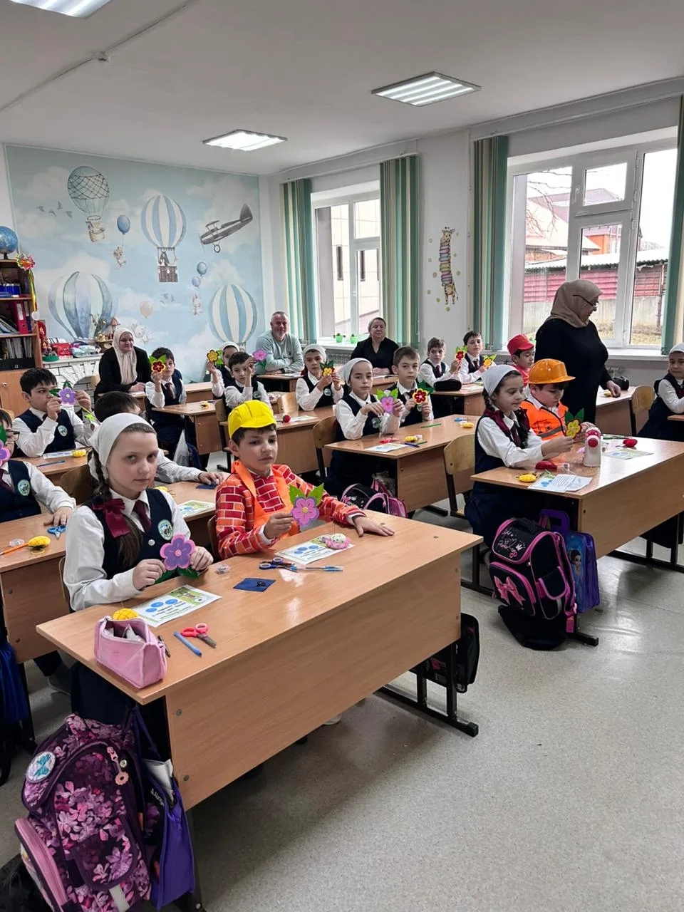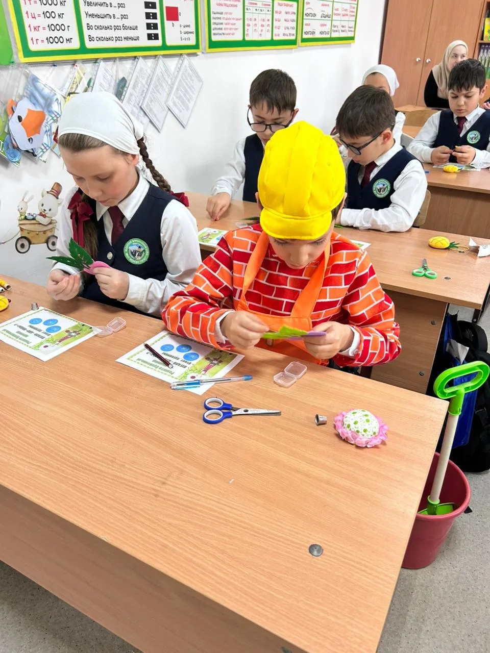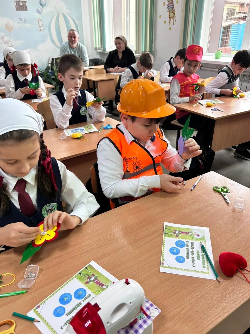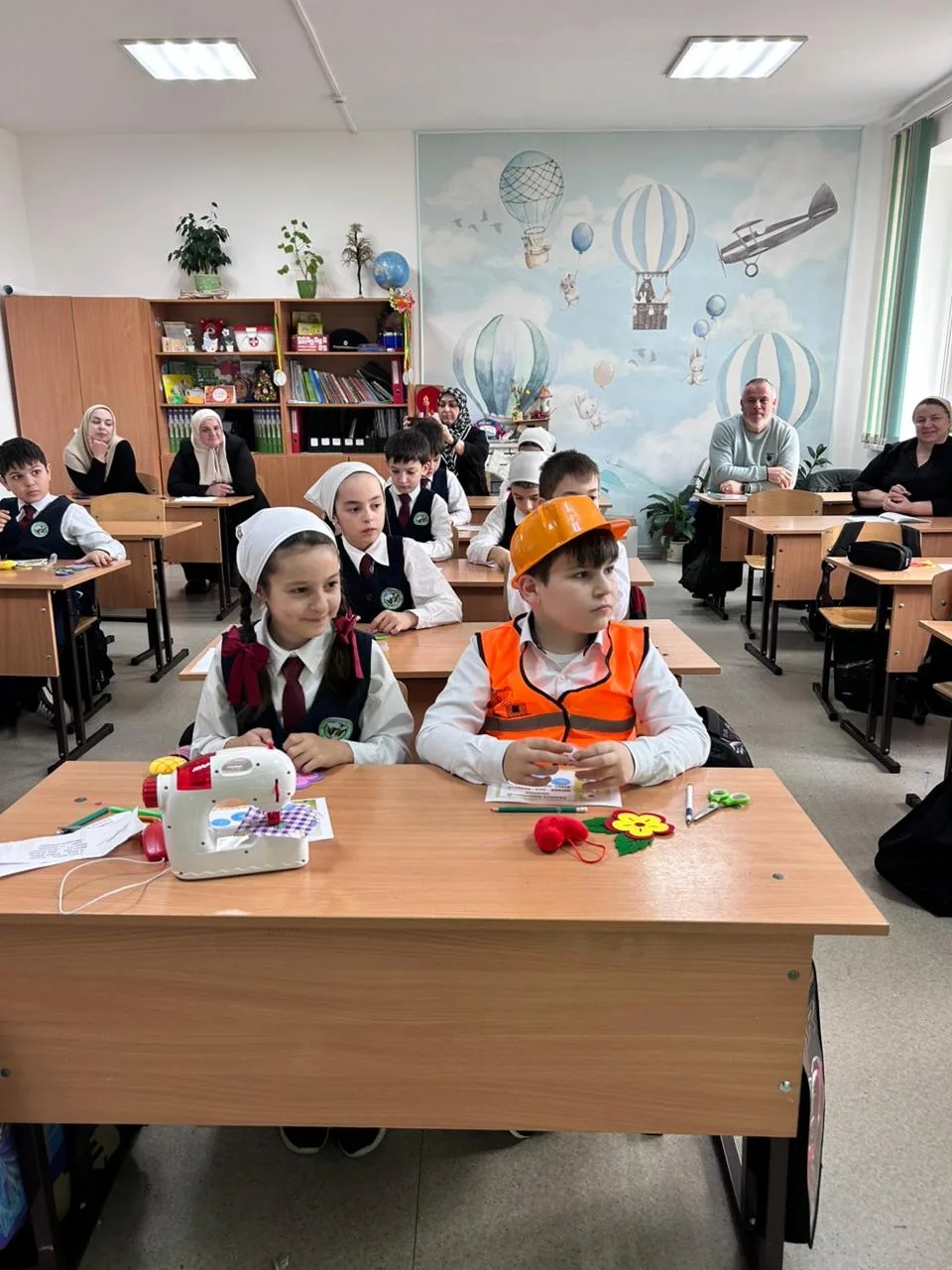 Важным воспитательным моментом стало появление на уроке костюмированных персонажей. В гости к классу пришли ребята в костюмах «Молча» (вероятно, имеется в виду сказочный персонаж или аллегория усидчивости/внимания), строителя, пожарного и швеи. Выступление детей со стихами о труде было направлено на раннюю профориентацию, формируя у школьников уважение к рабочим профессиям и понимание важности труда в жизни человека.