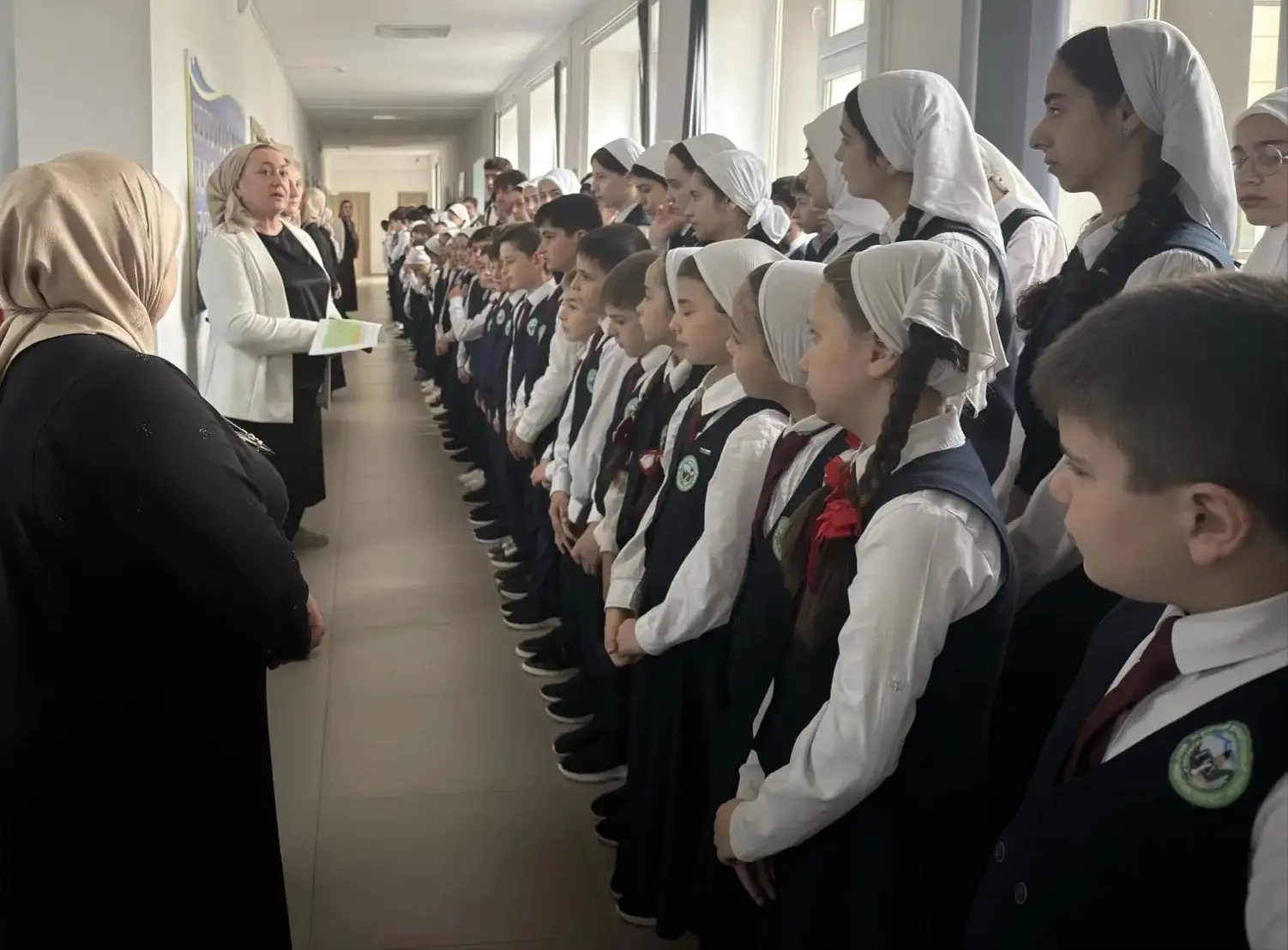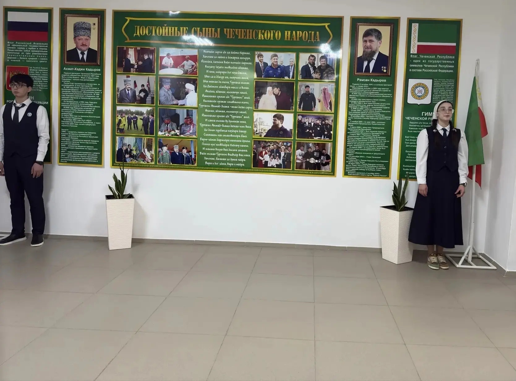Почётное право внести флаги РФ и ЧР было предоставлено знаменной группе школы в составе: Тухиева Абдуллы и Тухиевой Ясмины.