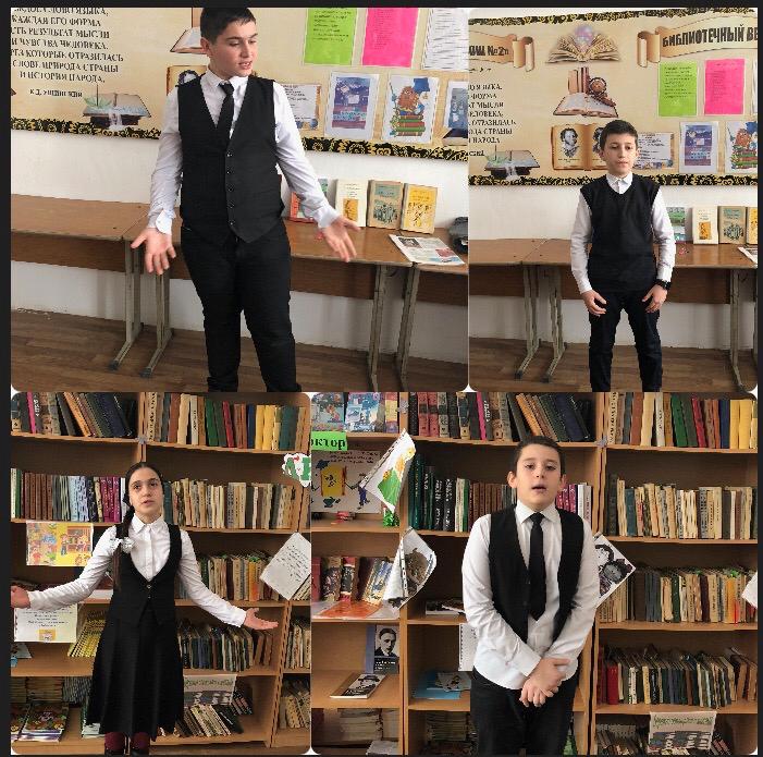 Особую активность проявили пятиклассники. В их исполнении прозвучали отрывки из сказки русских писателей. Отмечена Ахиядова М. прочитавшая отрывок из сказки «О мертвой царевне и семи богатырях». Она заняла первое место, а также второе место занял Гайсумов А, и третье место Сулейманова Я.