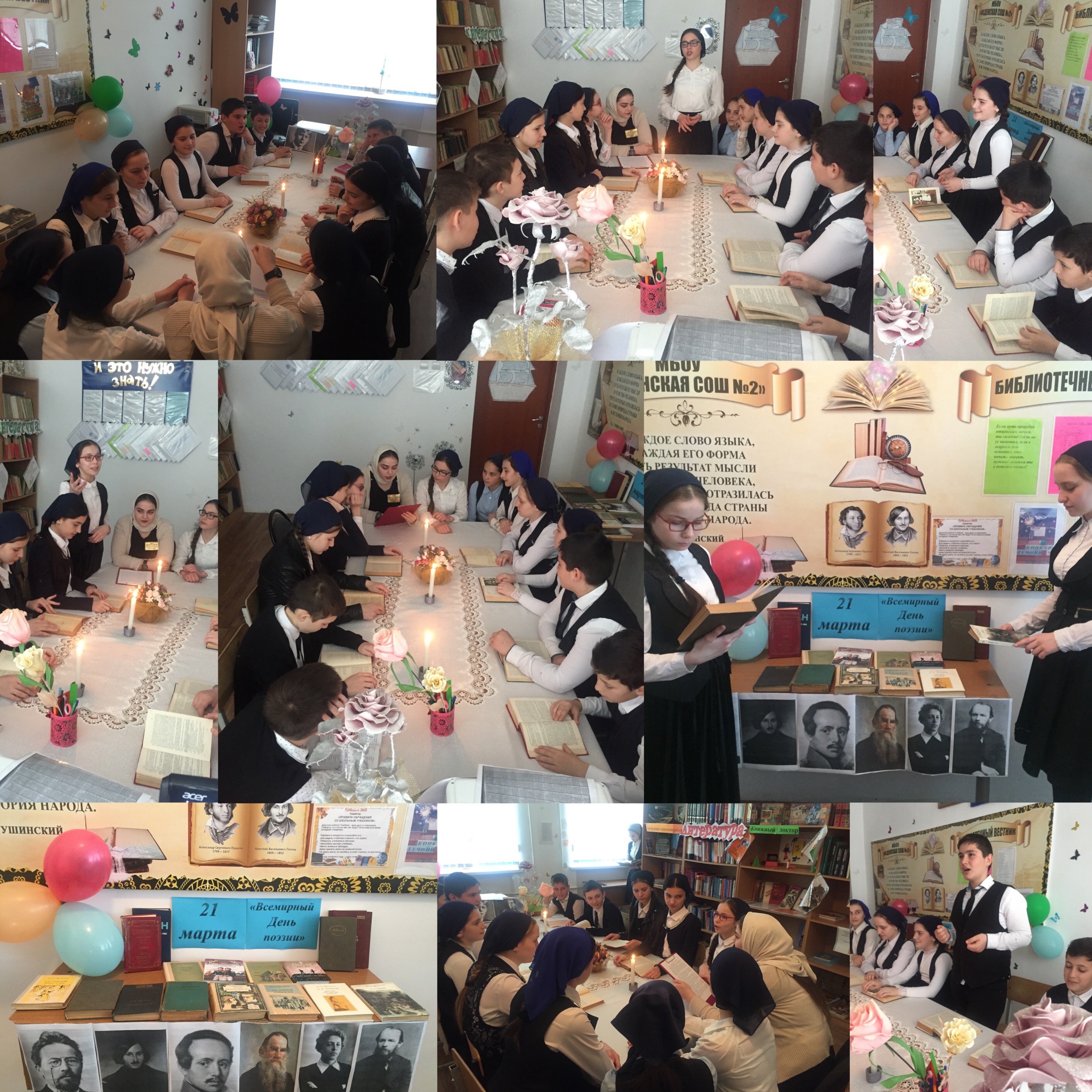 Библиотекарь Бакашева Р.Р. сделала обзор книжной выставки. Вдохновенно читали стихи собственного сочинения Ахиядова М., Истамулова Э., Халимова М., Батукаева Я., Гайсумов А., Адузаева С., Гайрбекова В. В своих выступлениях учащиеся прославляли мир поэзии, воспевающий любовь, красоту, человеческие взаимоотношения. Многие из присутствующих читали свои любимые стихи. Чимаева Радима прочла письмо Татьяны из поэмы «Евгений Онегин» А.С.Пушкина. Всех поразила своим актерским мастерством Ахиядова Милена, при чтении стихотворения Н.А.Некрасова «Русской женщине».