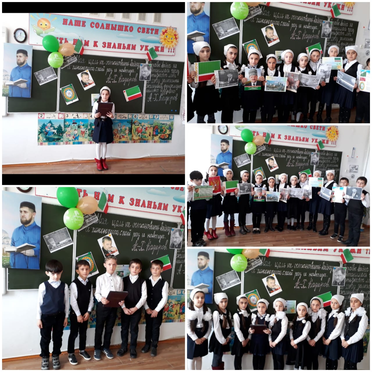 В школьной библиотеке проведена выставка книг «Страницы истории Чеченской Республики». Здание школы оформлено баннером, посвященный Дню Конституции ЧР.